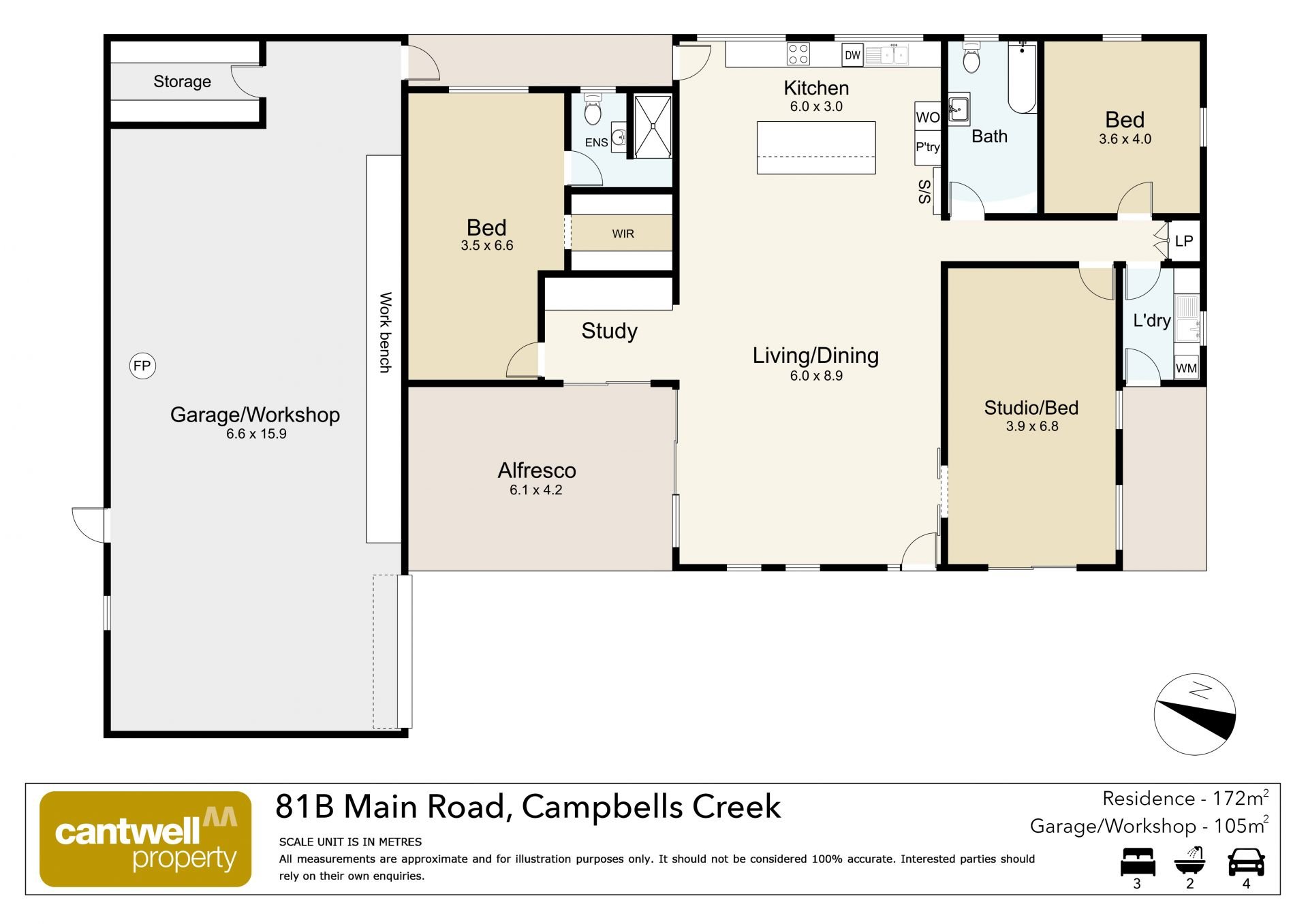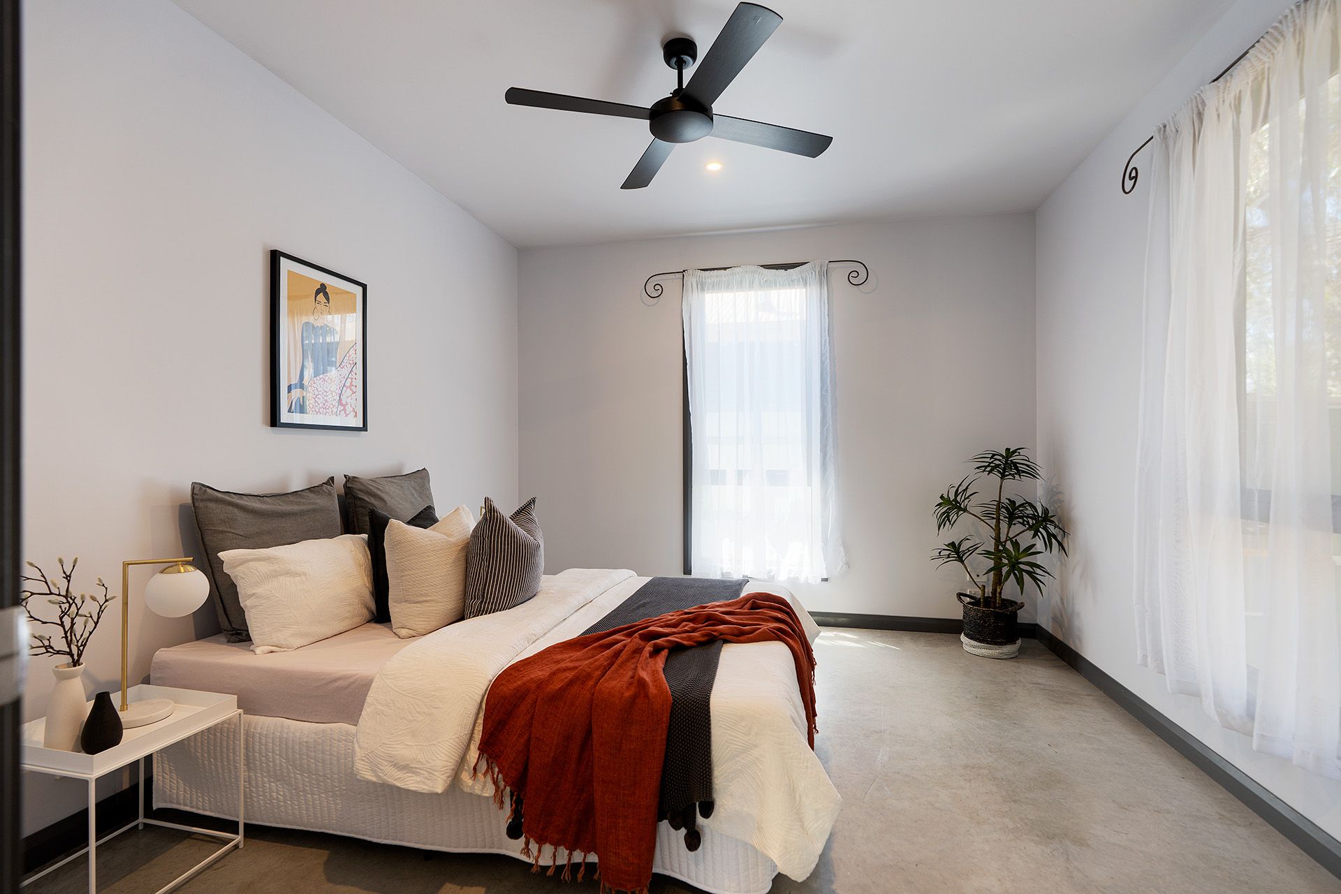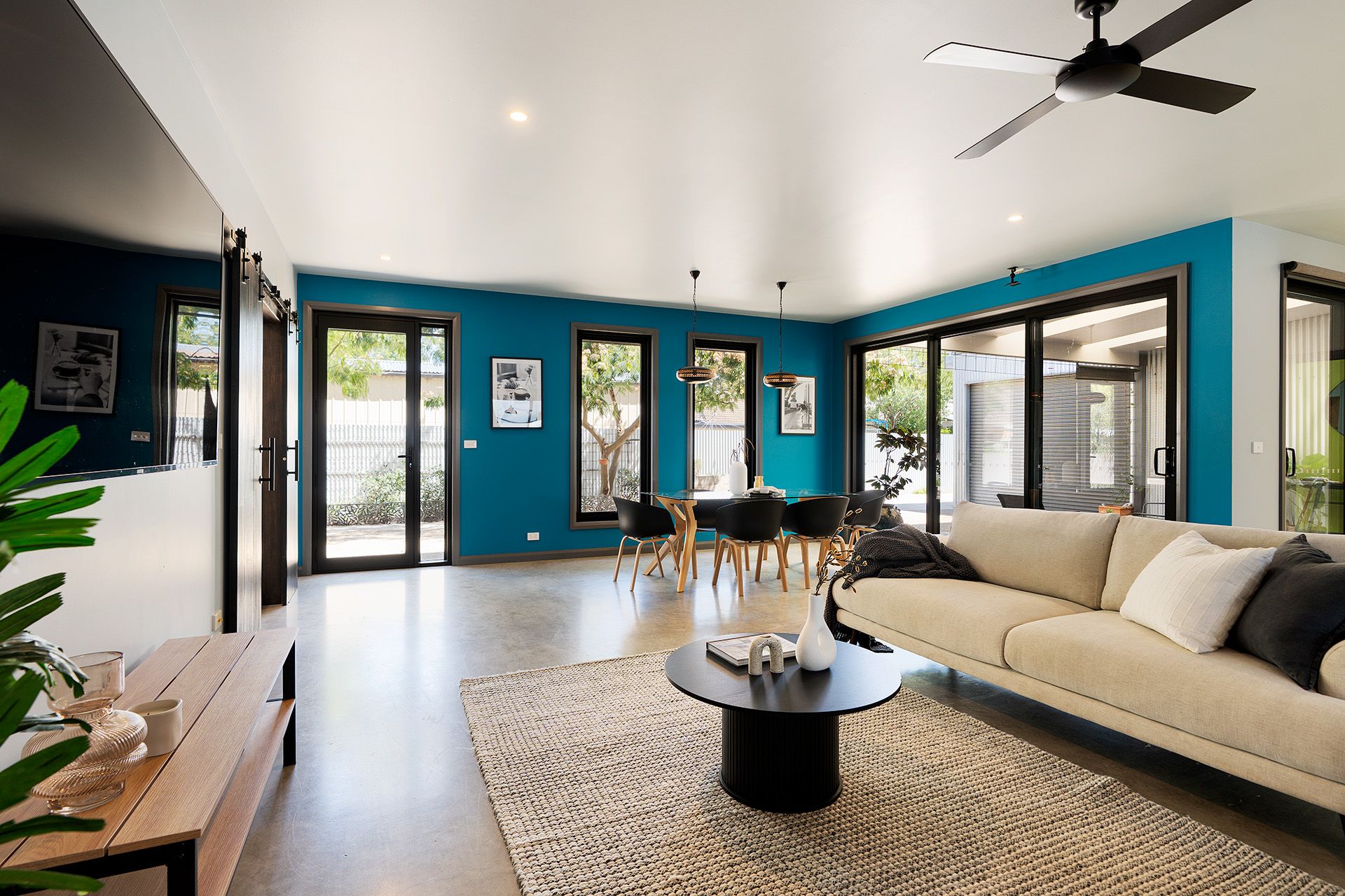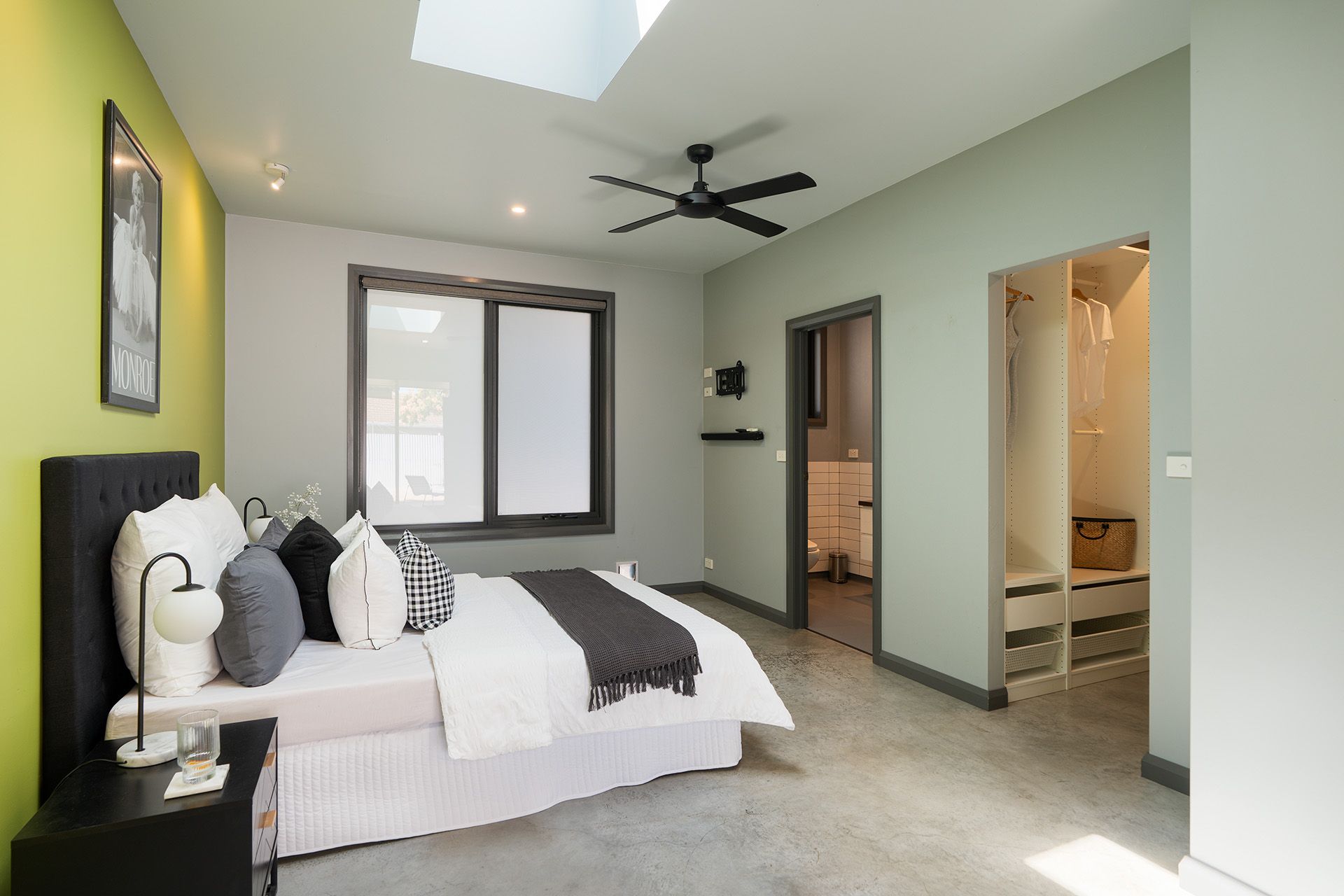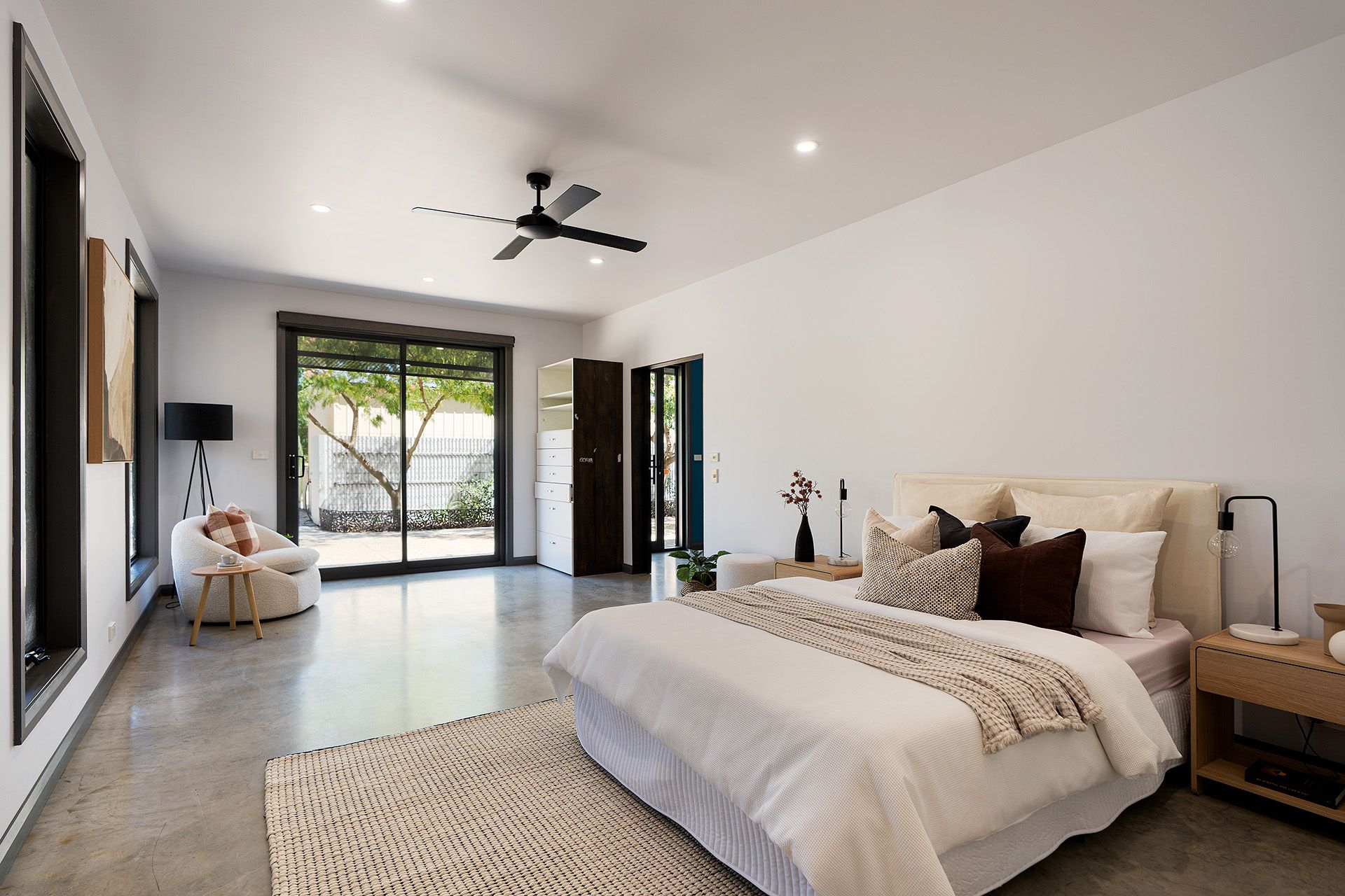 Offering three bedrooms, the main bedroom has a walk-in robe, ensuite and private access to the alfresco area. A second spacious bedroom with barn-style sliding doors offers versatility with external access, making it an excellent home studio or secondary living space. A generous bathroom has a shower over bath, laundry has storage and external access to a covered area. Extra features include double-glazed windows, hydronic floor heating, ceiling fans and split systems.