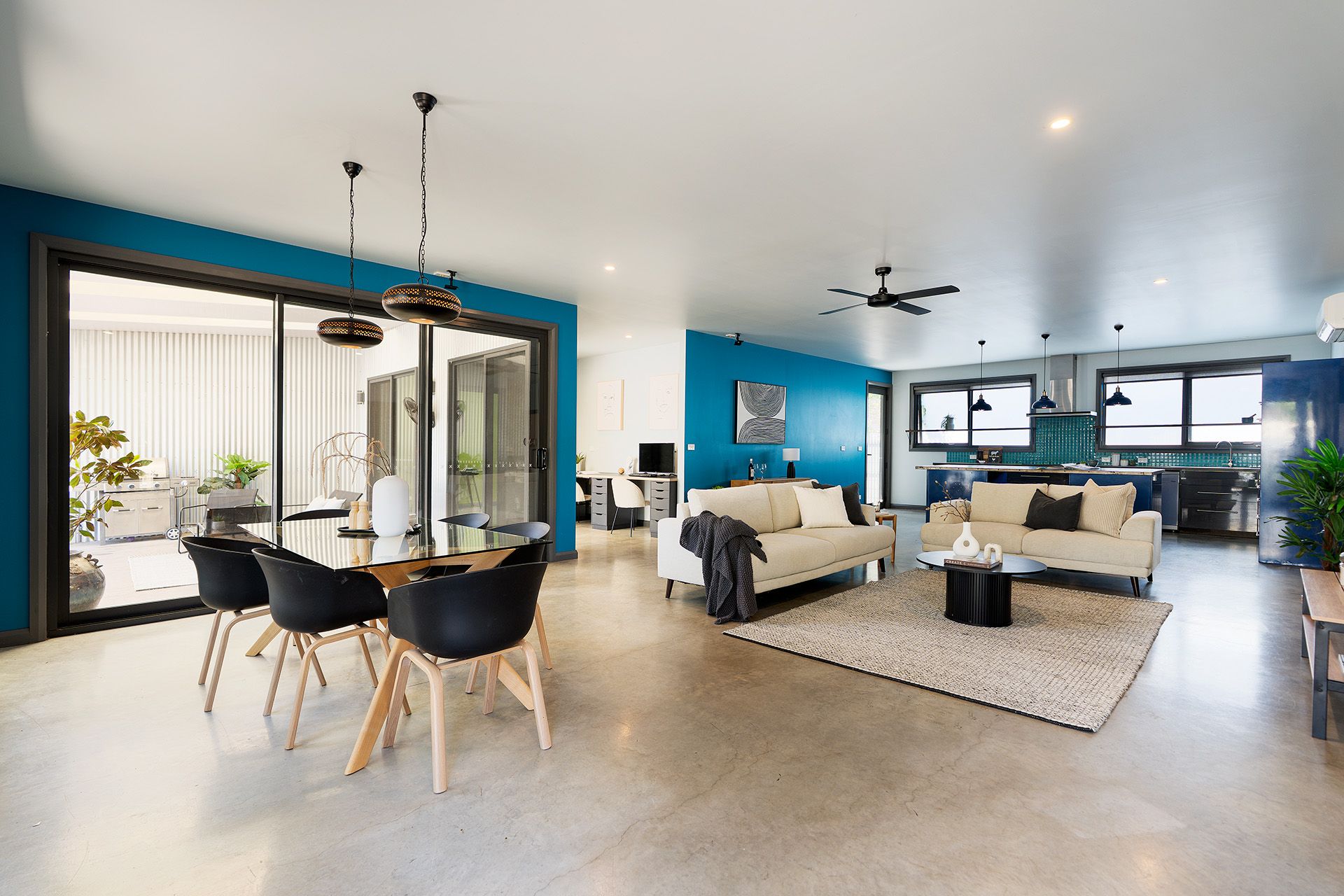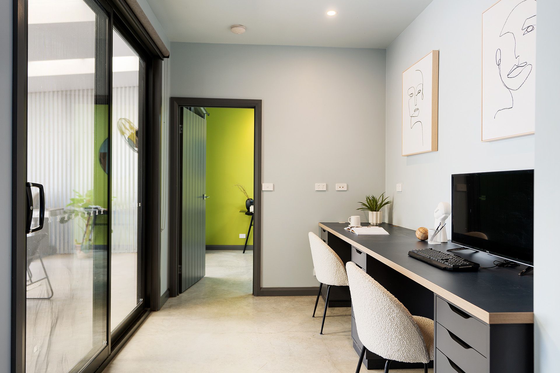 The open-plan living, dining, and kitchen areas create a spacious and functional flow, with the industrial-style kitchen with quality stainless steels being a highlight. The dining has access to the alfresco area for year-round entertaining. Adjoining the living space is a study/ home office with a built-in desk with storage.