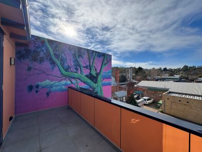The floorplan features a bedroom/ living/ workspace with double doors to an east-facing deck with an art mural by Melbourne artist Jack Rowland, who has exhibited nationally in galleries such as James Makin and the VANGUARD Invitational at Outre. On this level is a bathroom with combined Euro-style laundry that provides a shower, a toilet, a wall-hung basin, and bespoke timber wall storage. Steps lead to the original Victorian period building with hardwood flooring, large double hung windows overlooking Hargraves Street, and an open plan concept of a living, with dining and a galley style kitchen. The kitchen provides an induction/electric cooktop, an under-mount oven, a dishwasher, storage, and a split system. A third level features a loft-style bedroom with a split system and double doors leading onto a balcony with outlooks over Castlemaine and towards the Bourke and Wills Monument.