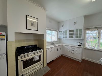 The home features two well-sized bedrooms, both with built-in robes, and a light-filled north-facing lounge complete with a split system for heating and cooling. The spacious dine-in kitchen is well-equipped with a 900mm Smeg gas cooker, dishwasher, and open shelving-ideal for those who love to cook. A combined bathroom and laundry provide practicality, and there's also a convenient additional powder room.