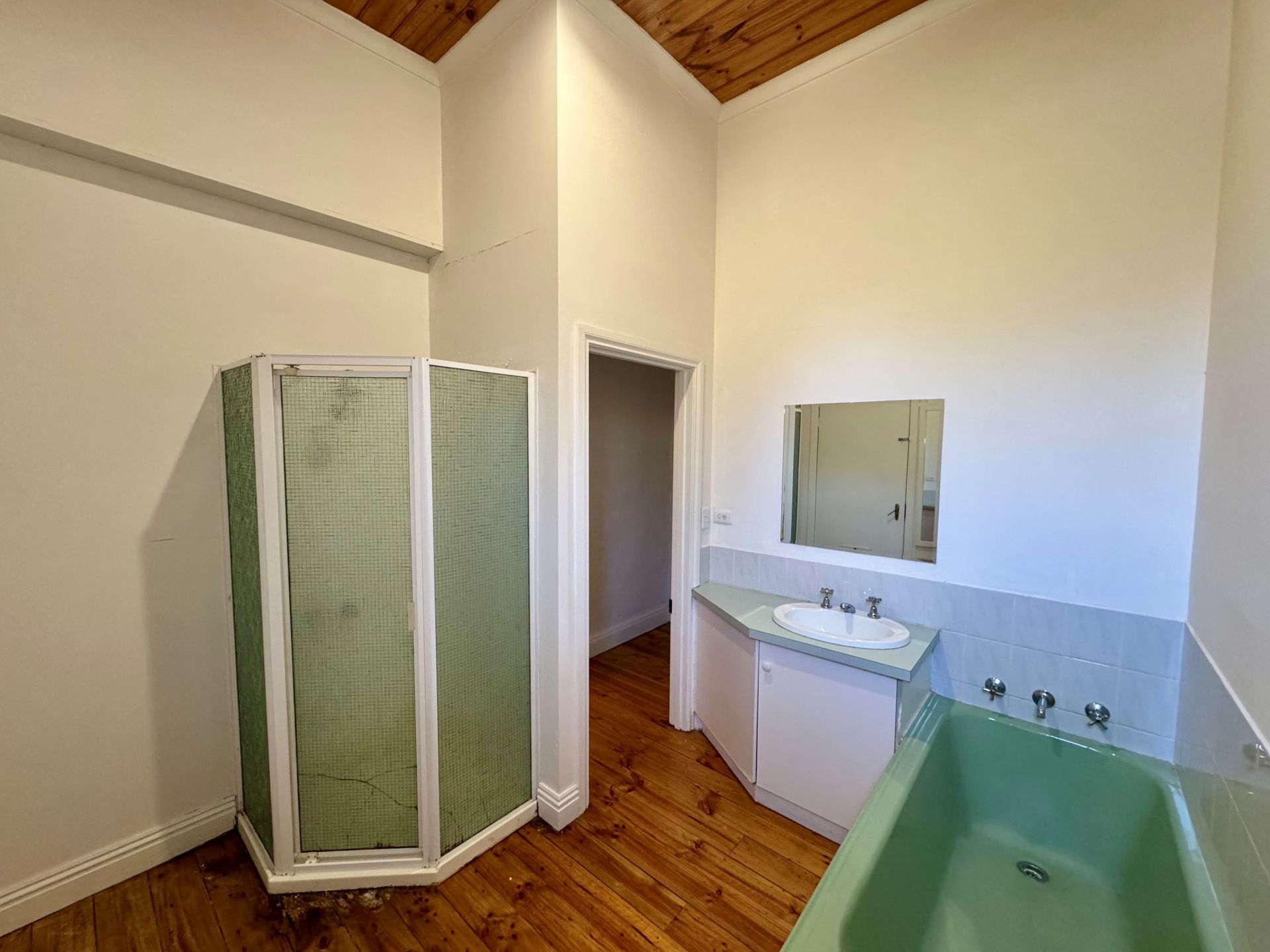 The home offers four bedrooms, two spacious, sunlit rooms at the front with polished floors, and two carpeted bedrooms at the rear, including one with exterior access, ideal for guests or a home office.