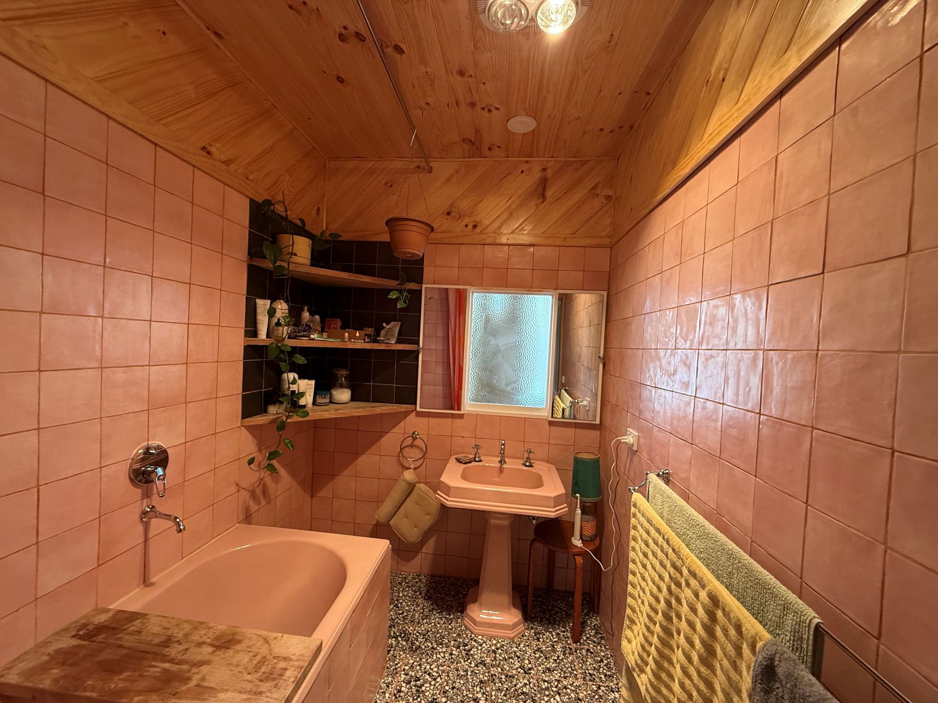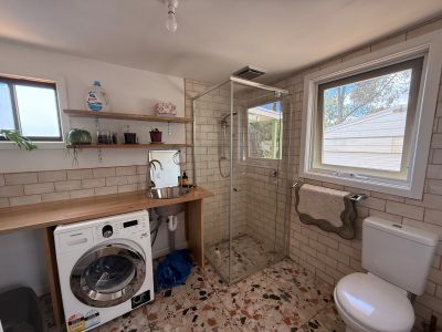 The main bathroom is well-appointed with shower over bath, while the second bathroom conveniently incorporates the laundry and extra storage, providing added functionality without compromising space.