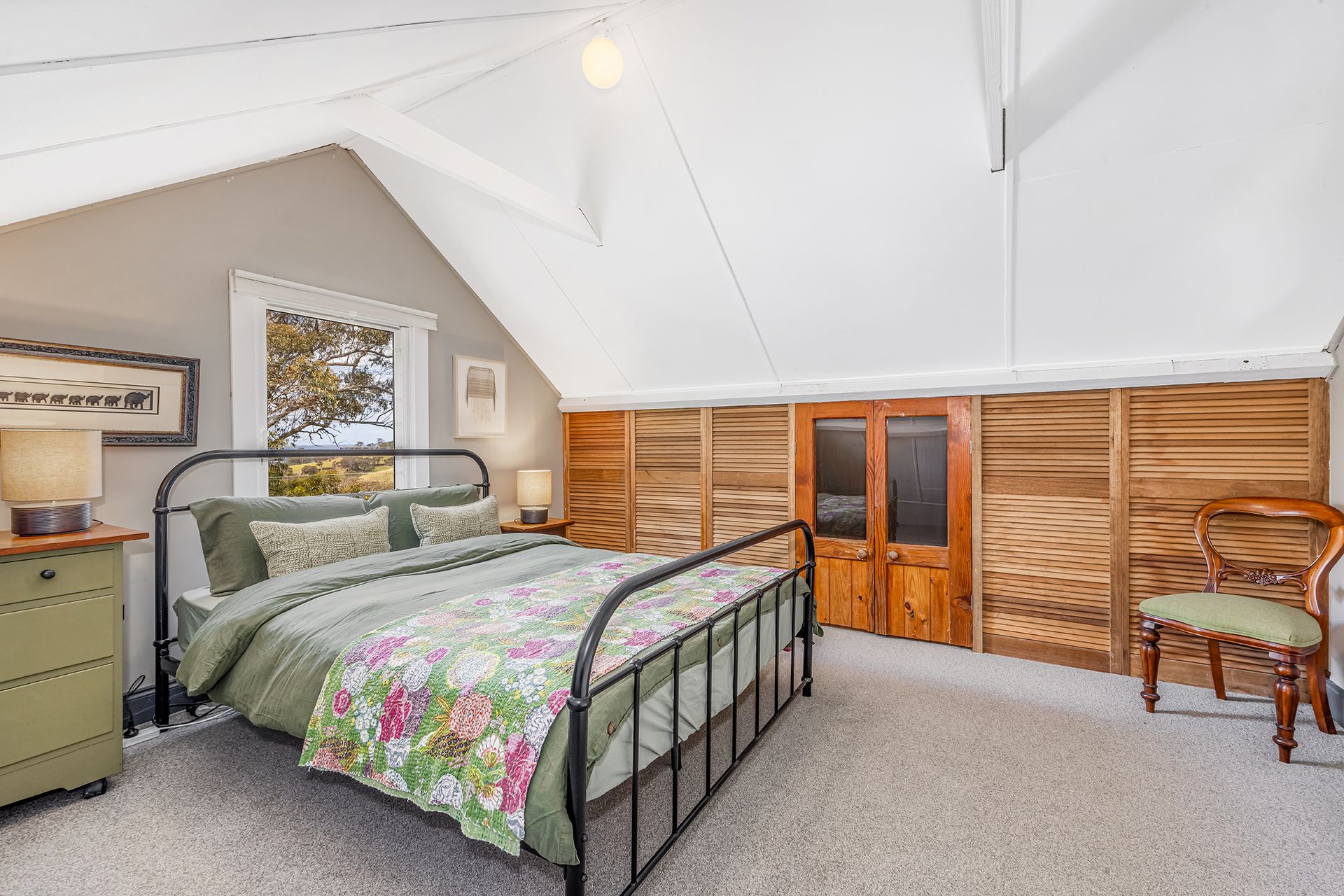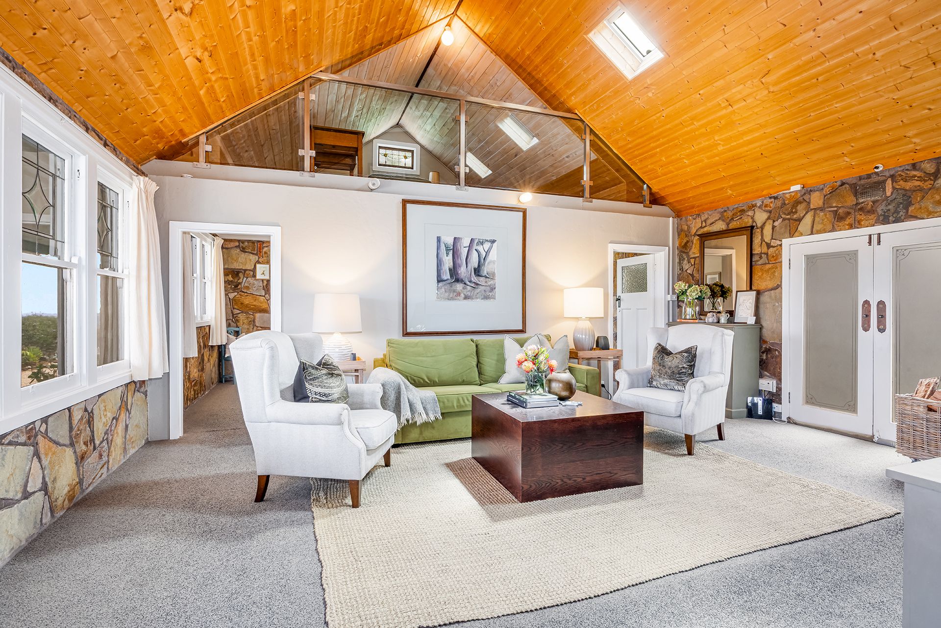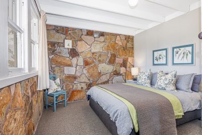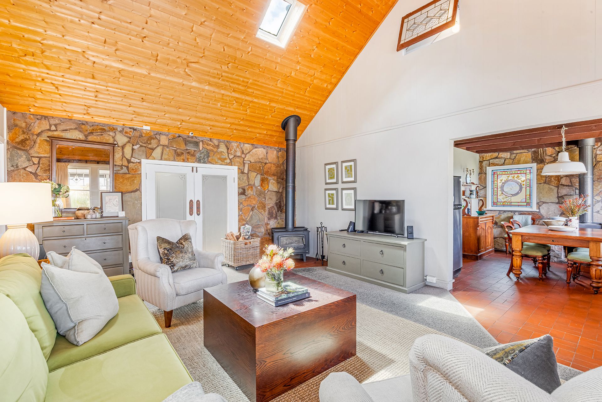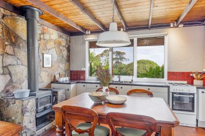 Inside, the home is warm and inviting. A comfortable, carpeted central lounge is complemented by a wood heater, exposed stone walls and high timber ceilings. The separate kitchen and dining area with gas cooking and a wood heater overlooking the garden and views beyond, creating the ideal space for slow breakfasts and long, relaxed dinners.