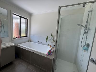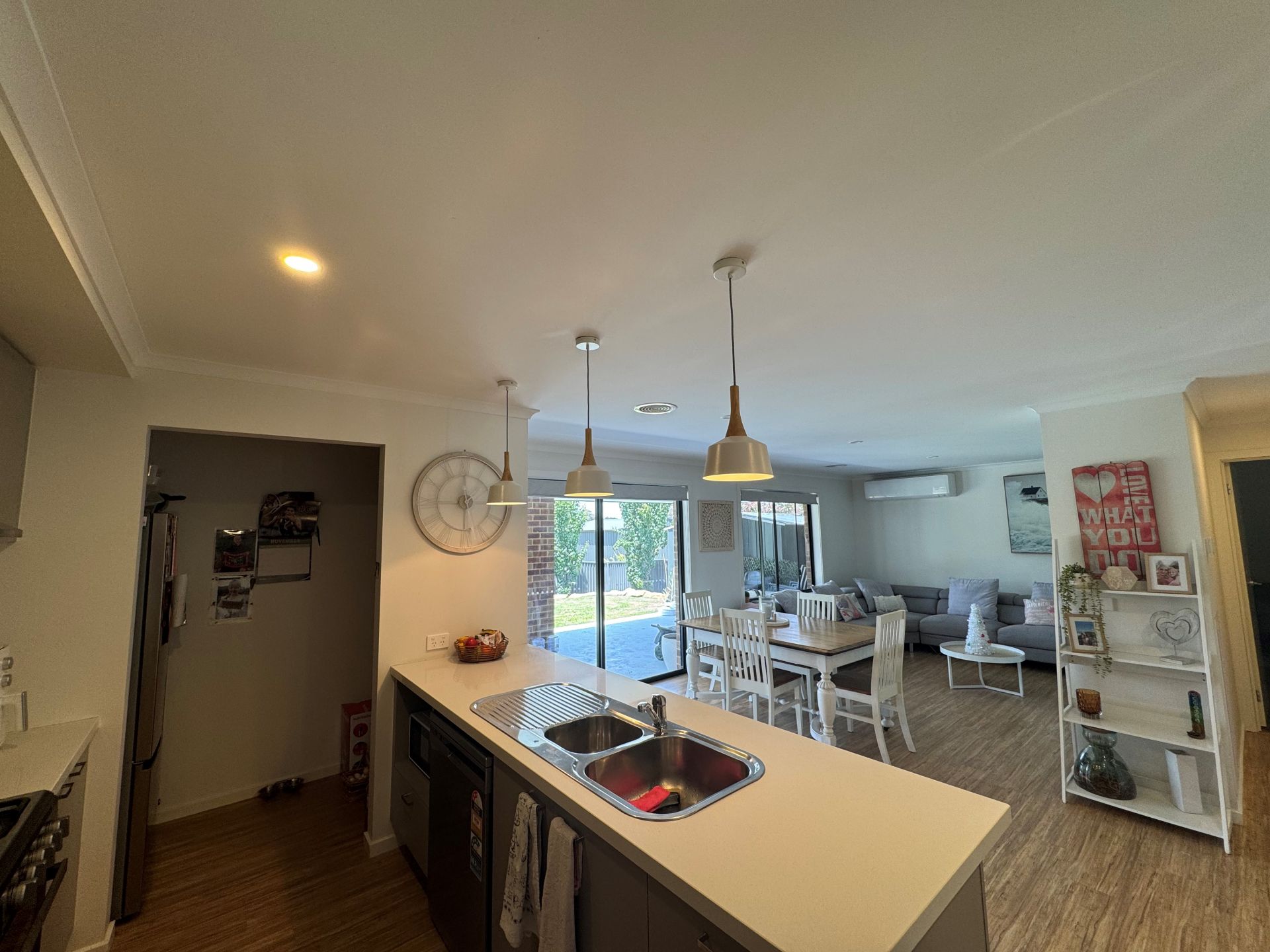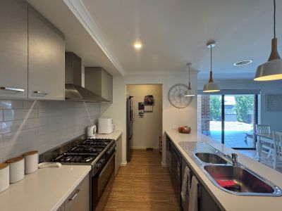 The heart of the property is an open-plan kitchen, dining and living area that flows seamlessly to a covered alfresco space, ideal for entertaining. The kitchen impresses with a 900mm gas stove, dishwasher, walk-in pantry, and a central island with bench-mounted sink and ample storage. A second lounge at the front of the home provides flexibility for family living, while a well-appointed family bathroom with separate toilet and a laundry with external access complete the interior.