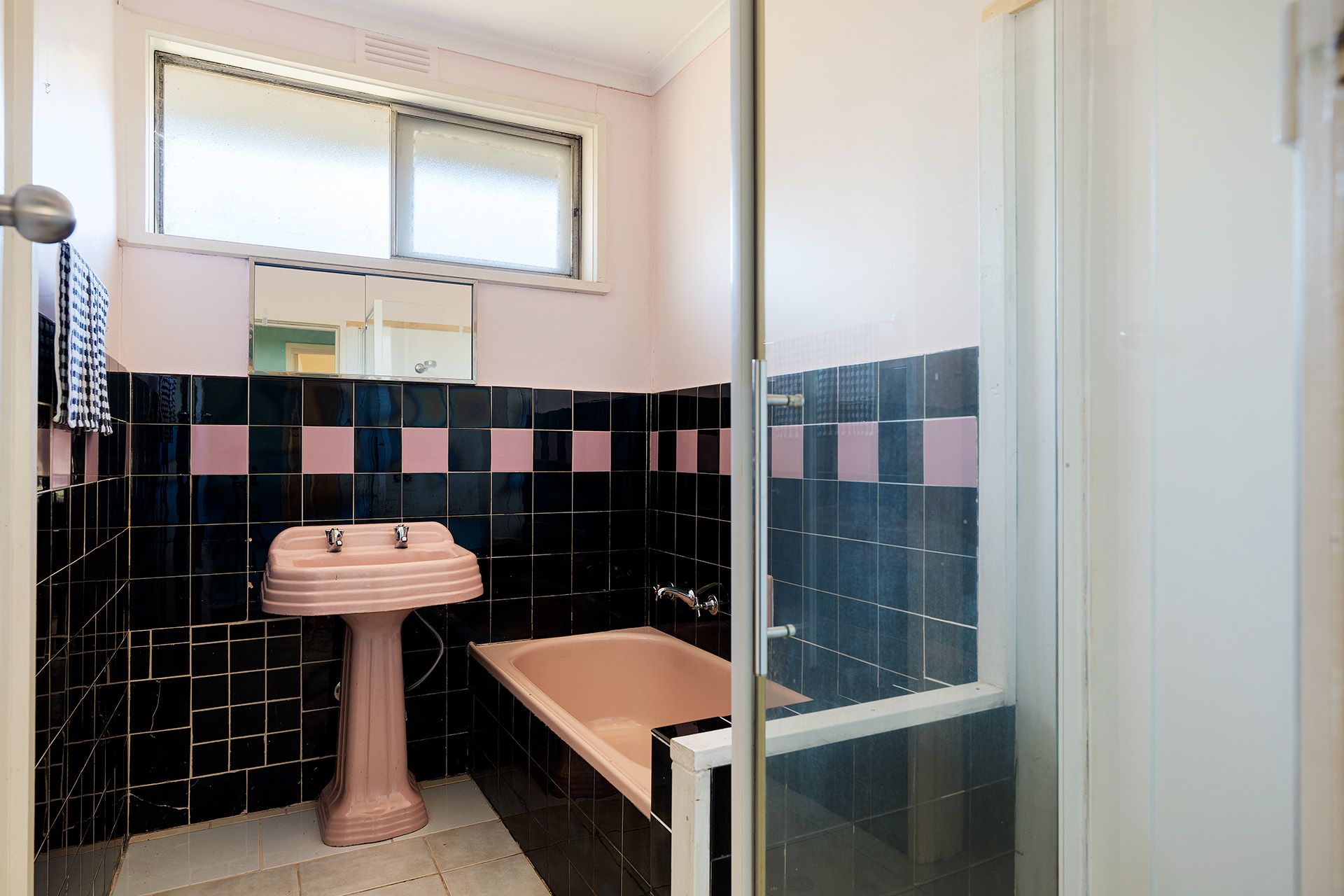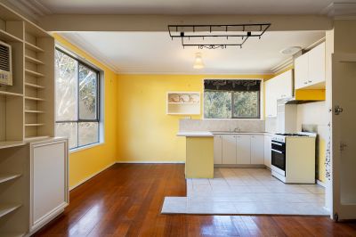 Step through a circular driveway and vine-covered verandah into the main residence, a light-filled home with original timber floors and an inviting retro aesthetic. The open-plan living and dining area features a wood fire heater, ceiling fan, and split system, while the kitchen offers wrap-around benchtops, a freestanding gas oven and cooktop, and a view over the back garden and bushland beyond. Three generous bedrooms (main with built-in robes) are serviced by a retro-style bathroom and a practical laundry with direct outdoor access.