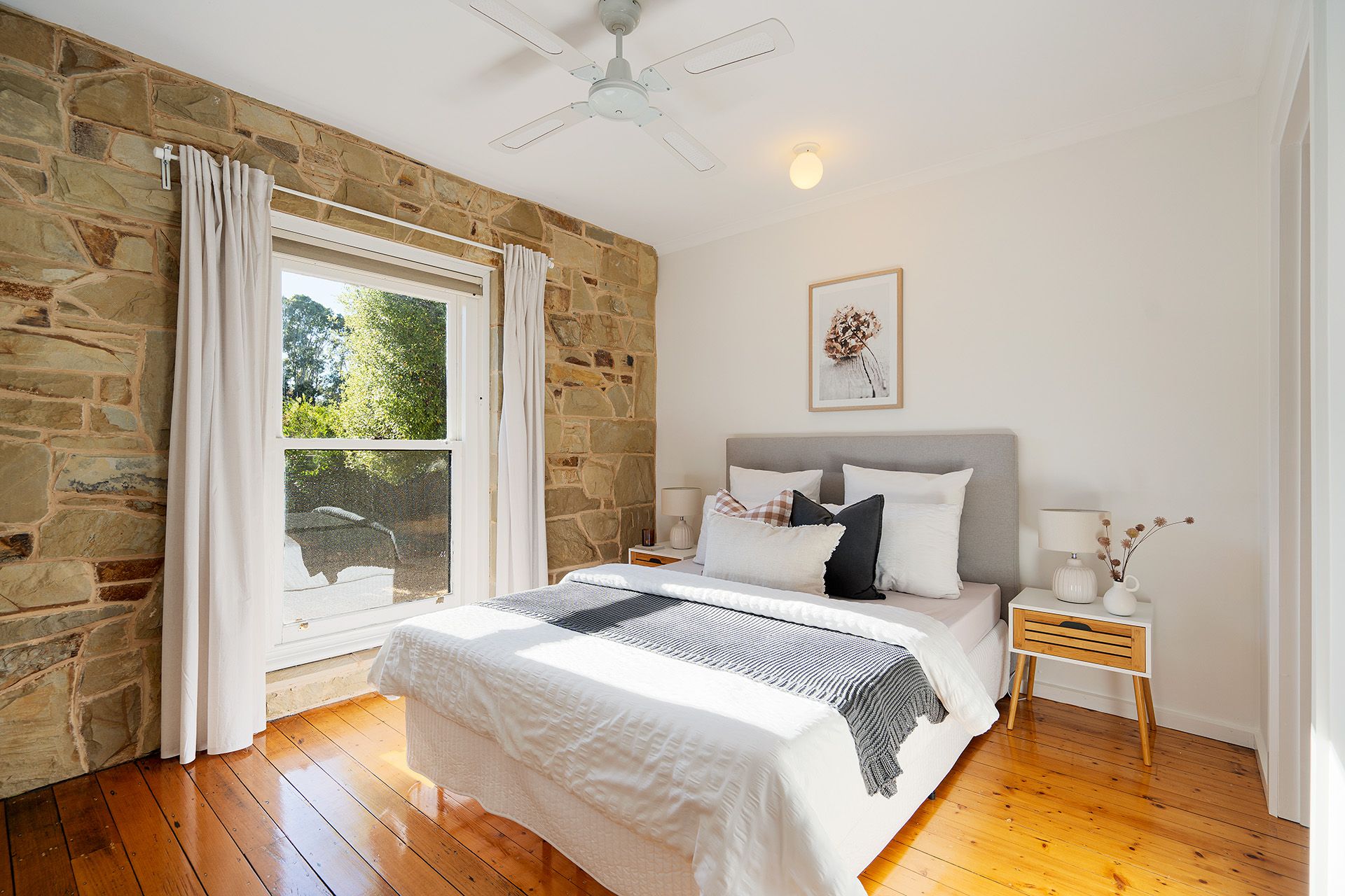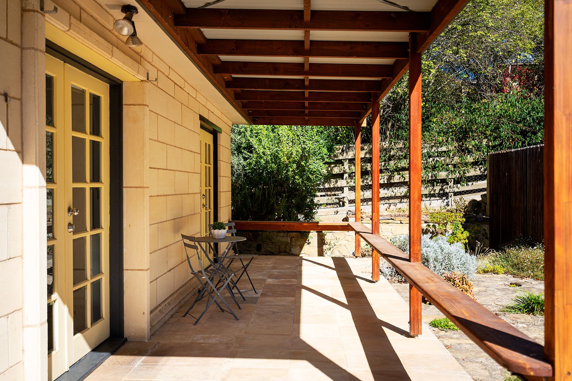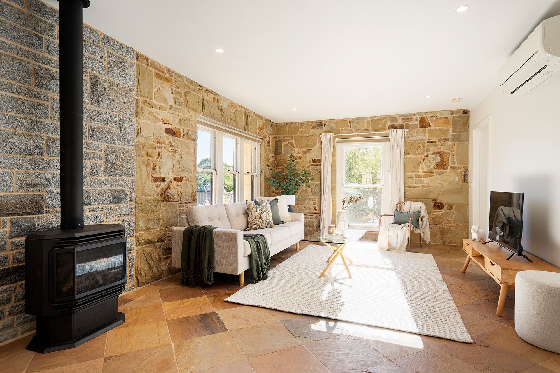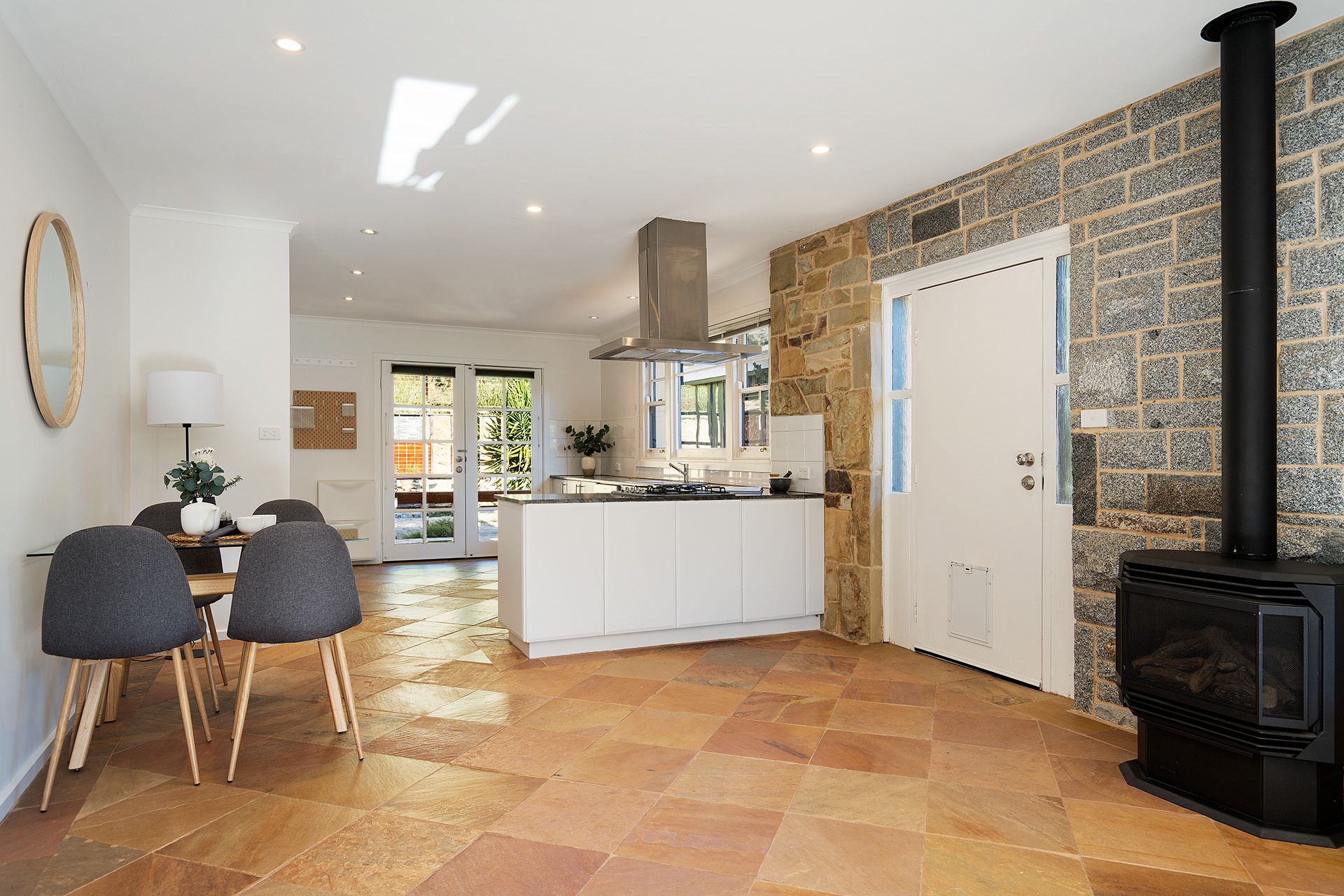 The floorplan features entry into a north-facing open-plan kitchen with dining and living. The kitchen provides a gas cooktop with an under-mount oven, a Bosch dishwasher, and stone benchtops, a return bench allows for bar-style seating, and French doors lead to a covered verandah overlooking a private courtyard. The dining and living include a gas log fire and a split system. The living space has a stunning feature wall of Harcourt granite and Castlemaine slate with stone flooring and large double-hung windows that frame the garden.