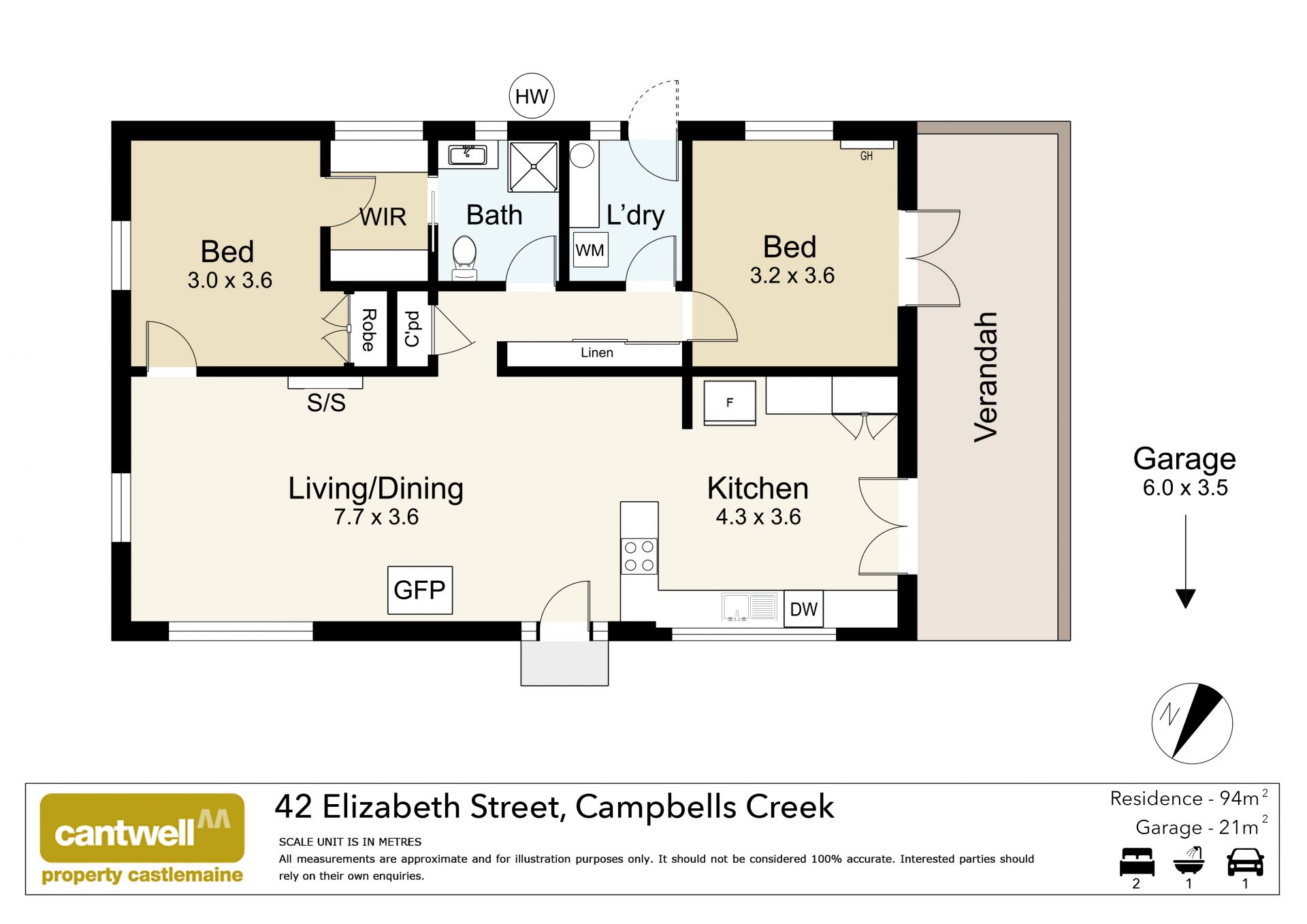 Adjoining the living is the main bedroom with built-in robes, a walk-in robe and access to the central bathroom with a shower, a vanity, and a toilet. A second bedroom/ study has a wall heater and French doors to the rear courtyard. Completing the internal floor plan is a laundry with external access. Additional details include Luxaflex honeycomb blinds and floorboards in the bedrooms.