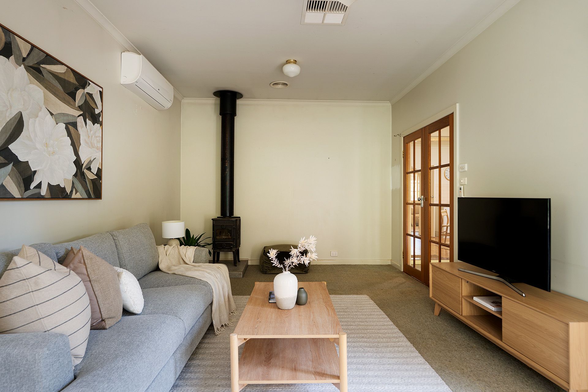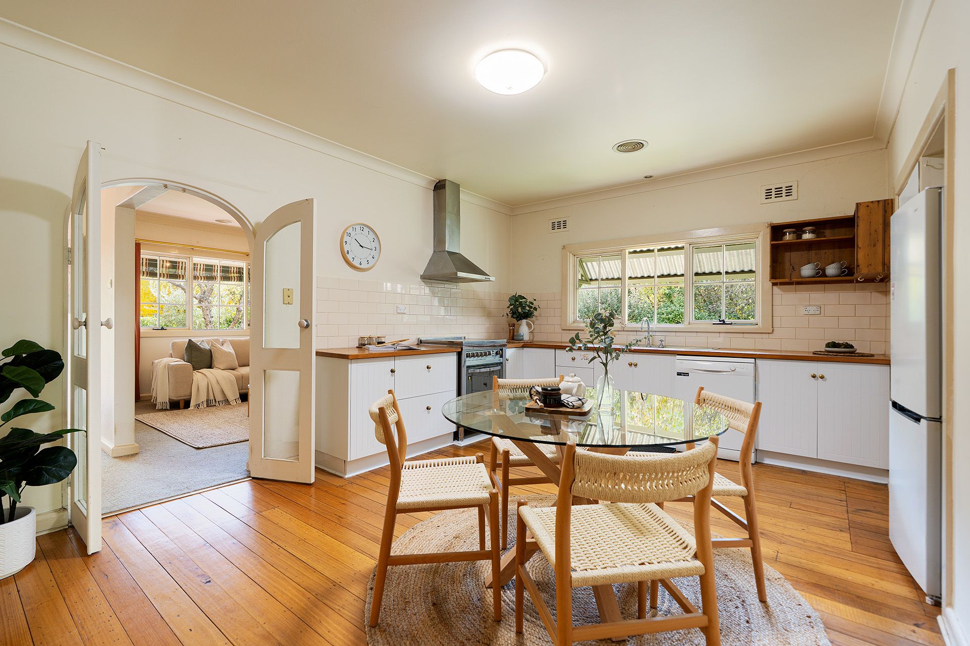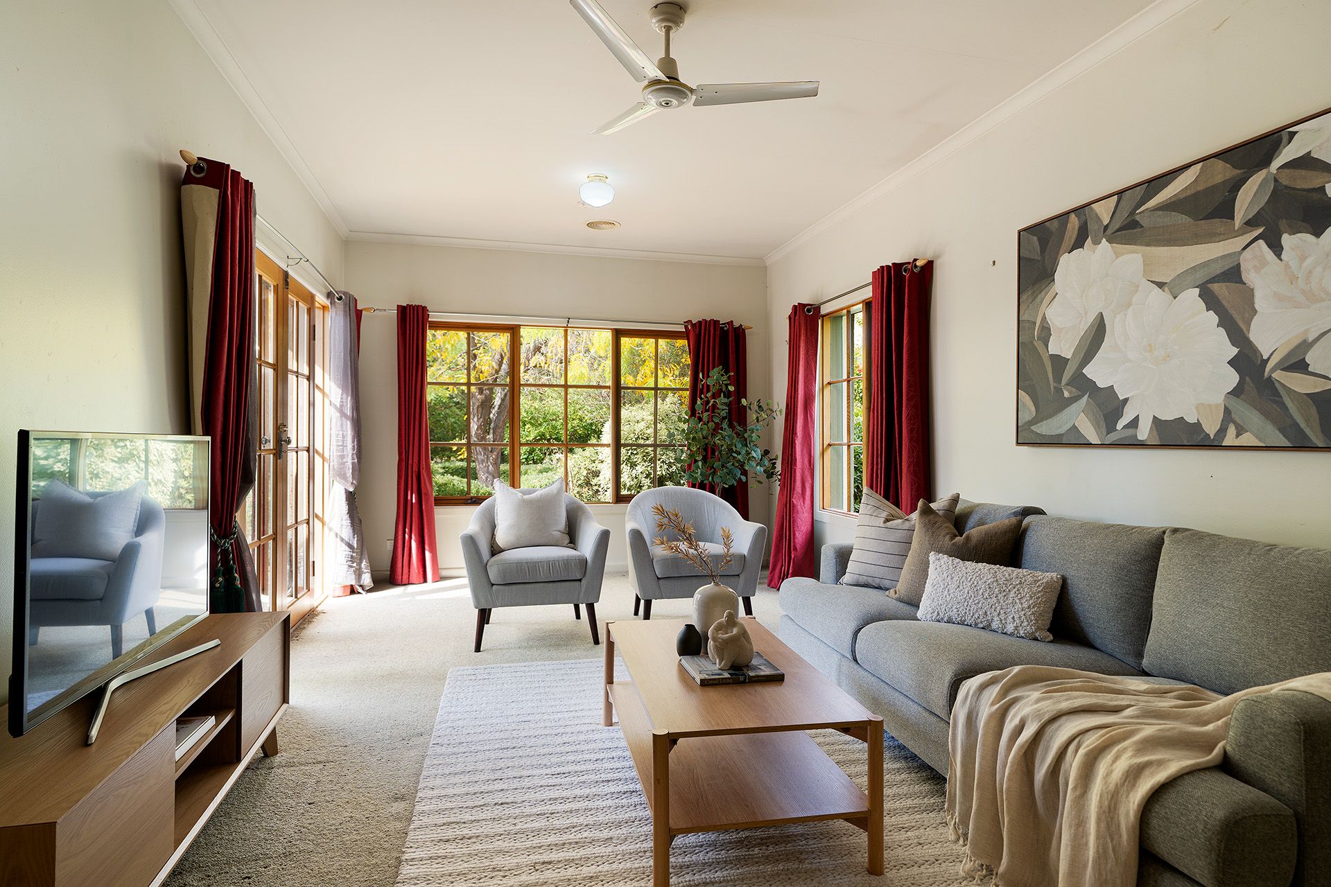 Step inside to discover a warm and inviting formal living room that overlooks the front garden, with a gas heater set within an elegant timber mantle and evaporative ducted cooling. At the heart of the home, the country-style kitchen boasts a freestanding gas cooktop and oven, dishwasher, pantry, and ample storage, all adjoining a casual meals area ideal for family dining. A second living area at the rear offers a cozy solid wood heater and split system. It opens via double doors to a terrace framed by clipped box hedging and mature ornamental trees - ideal for relaxing or entertaining in your private oasis.