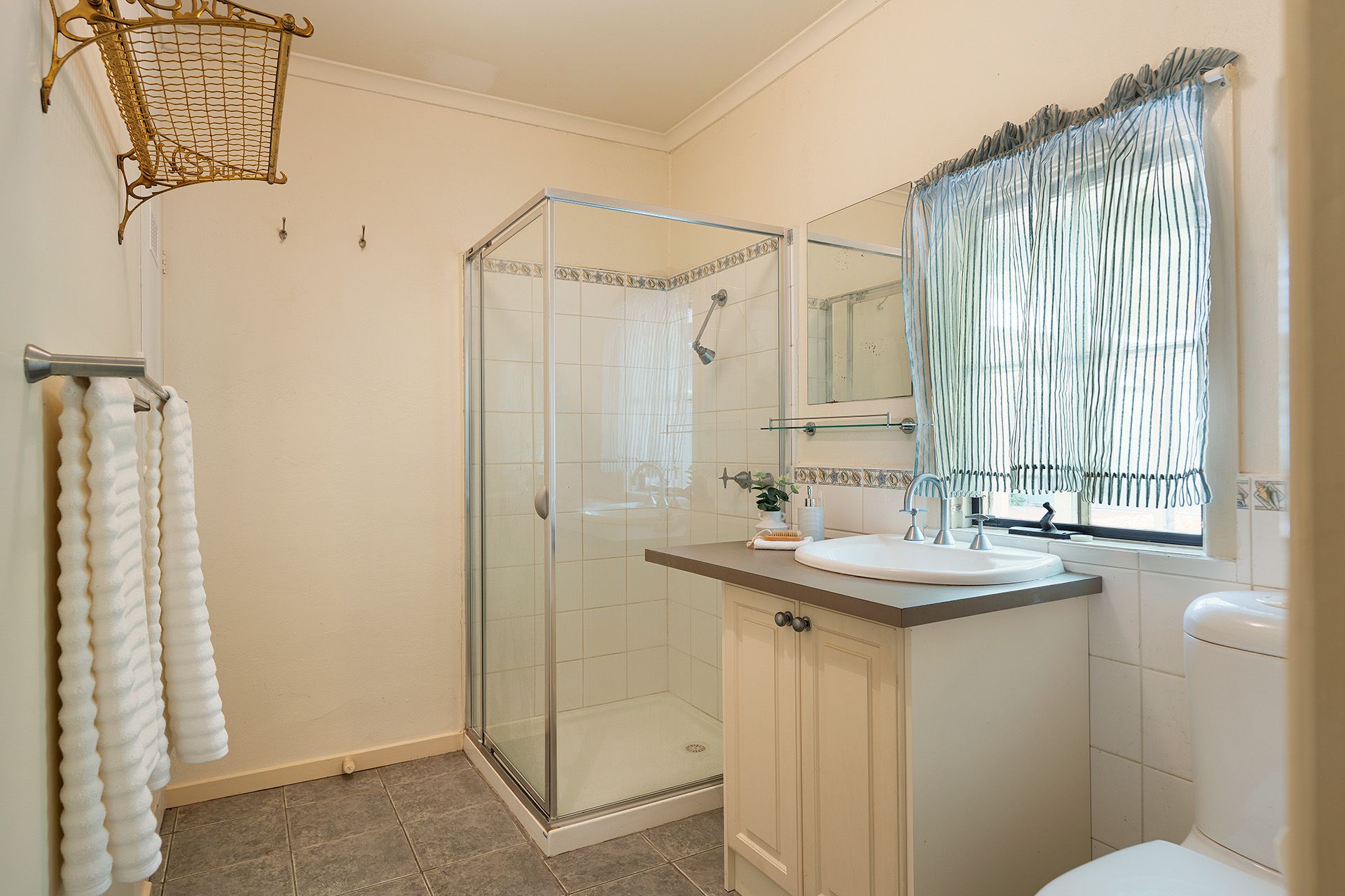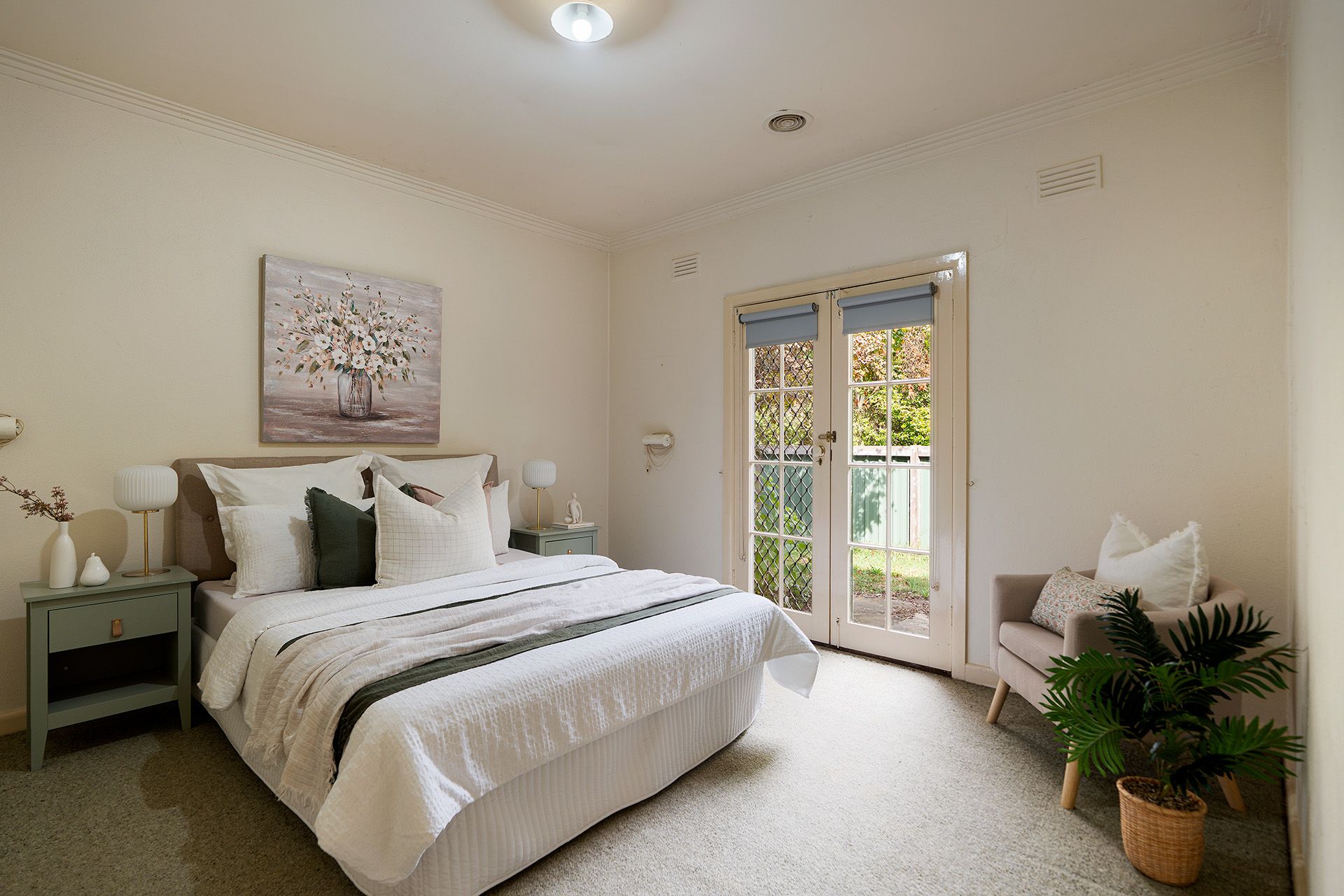 Both bedrooms are well-proportioned, with the main bedroom offering built-in robes and the second enjoying the bonus of external access - perfect for guests, a home office, or a studio setup. The central bathroom, positioned between the bedrooms, features a shower over a bath, vanity, and toilet. A second bathroom at the rear of the home offers a shower, vanity, and toilet for added convenience.