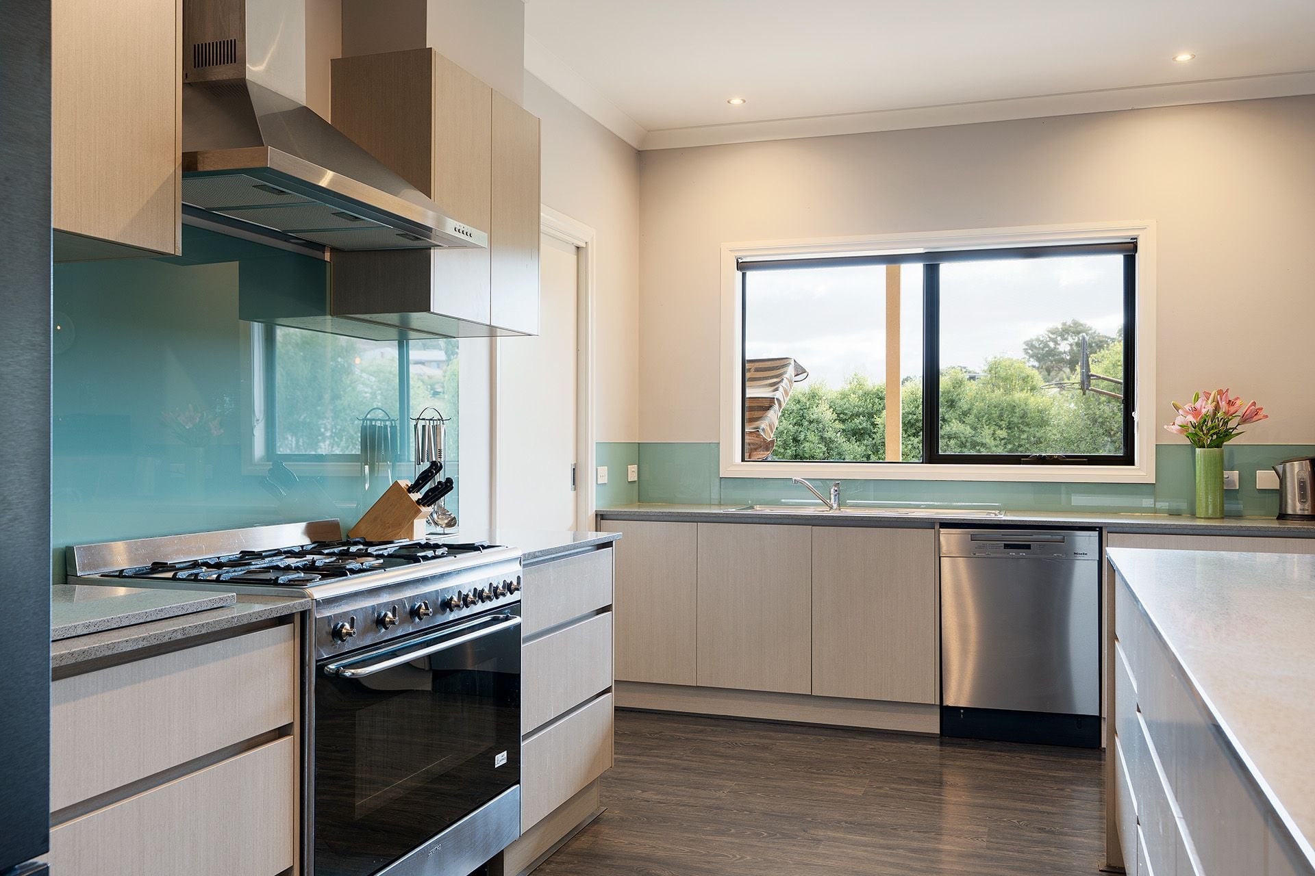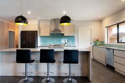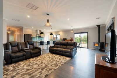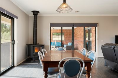 Step inside via the wide central hallway where a private home office is cleverly concealed behind bi-fold doors-perfect for remote work or study. The heart of the home is the sun-drenched, north-facing open-plan kitchen, dining and living area. The kitchen is well-appointed with stone benchtops, a freestanding 900mm SMEG gas cooktop and oven, a Miele dishwasher, plumbed fridge space, and a walk-in pantry with convenient internal access to the garage. A large island bench provides space for casual dining, and a solid wood heater creates a cosy atmosphere through the cooler months. Glass sliding doors open to a generous alfresco area, complete with a second solid wood heater, making it ideal for entertaining year-round.
