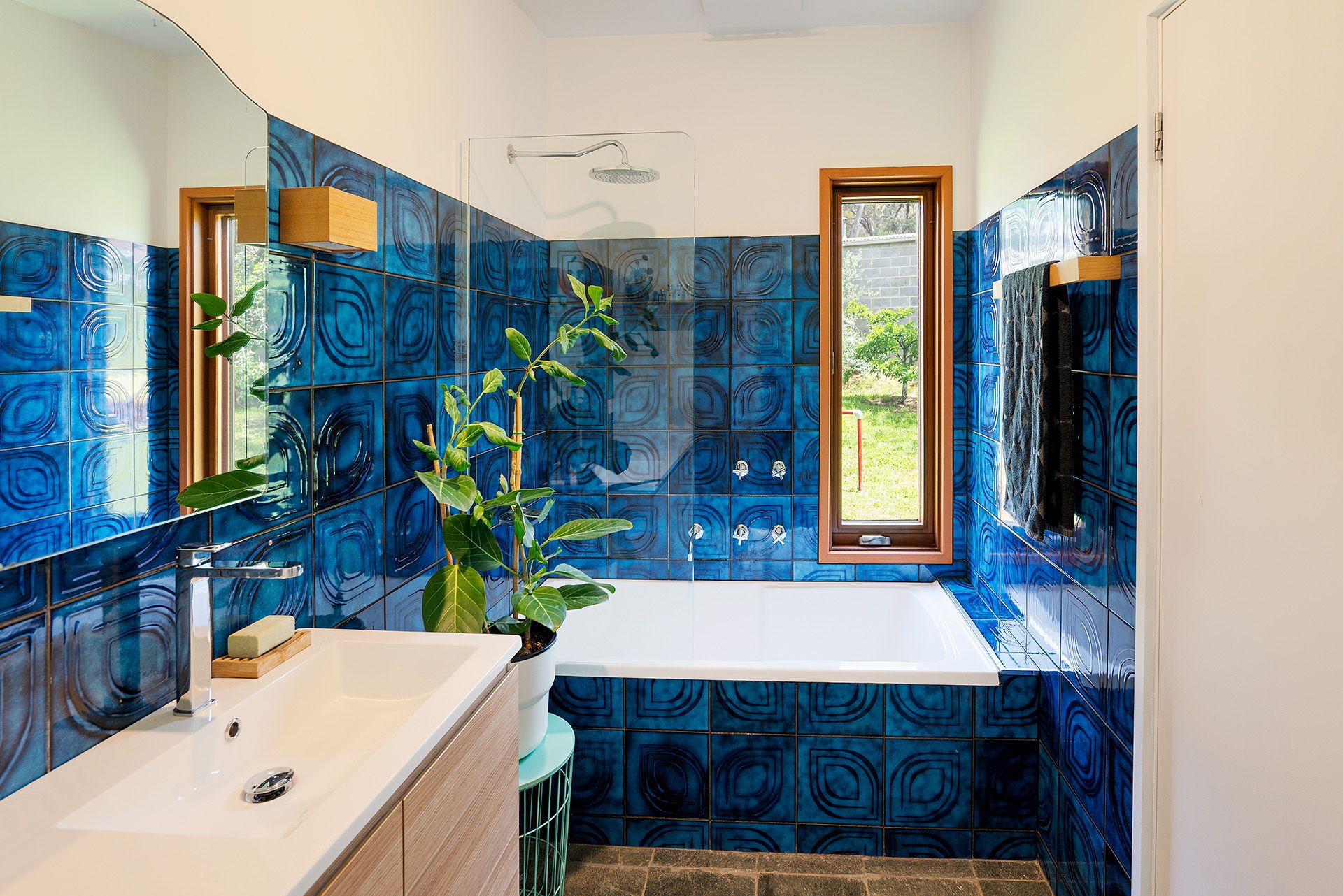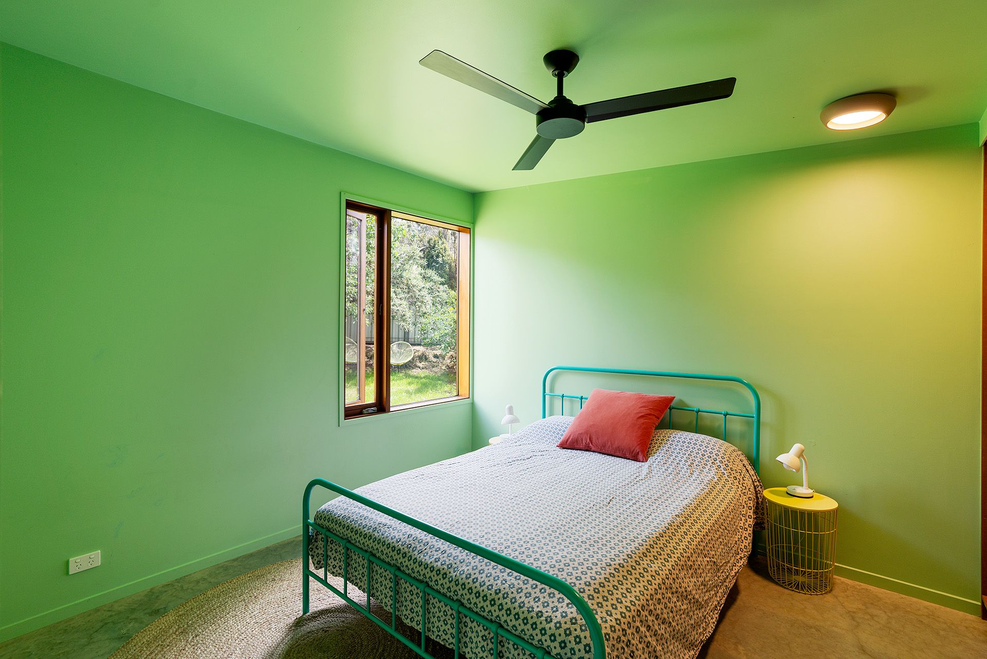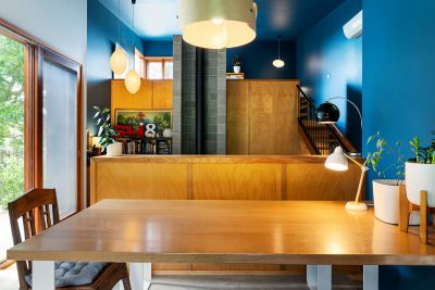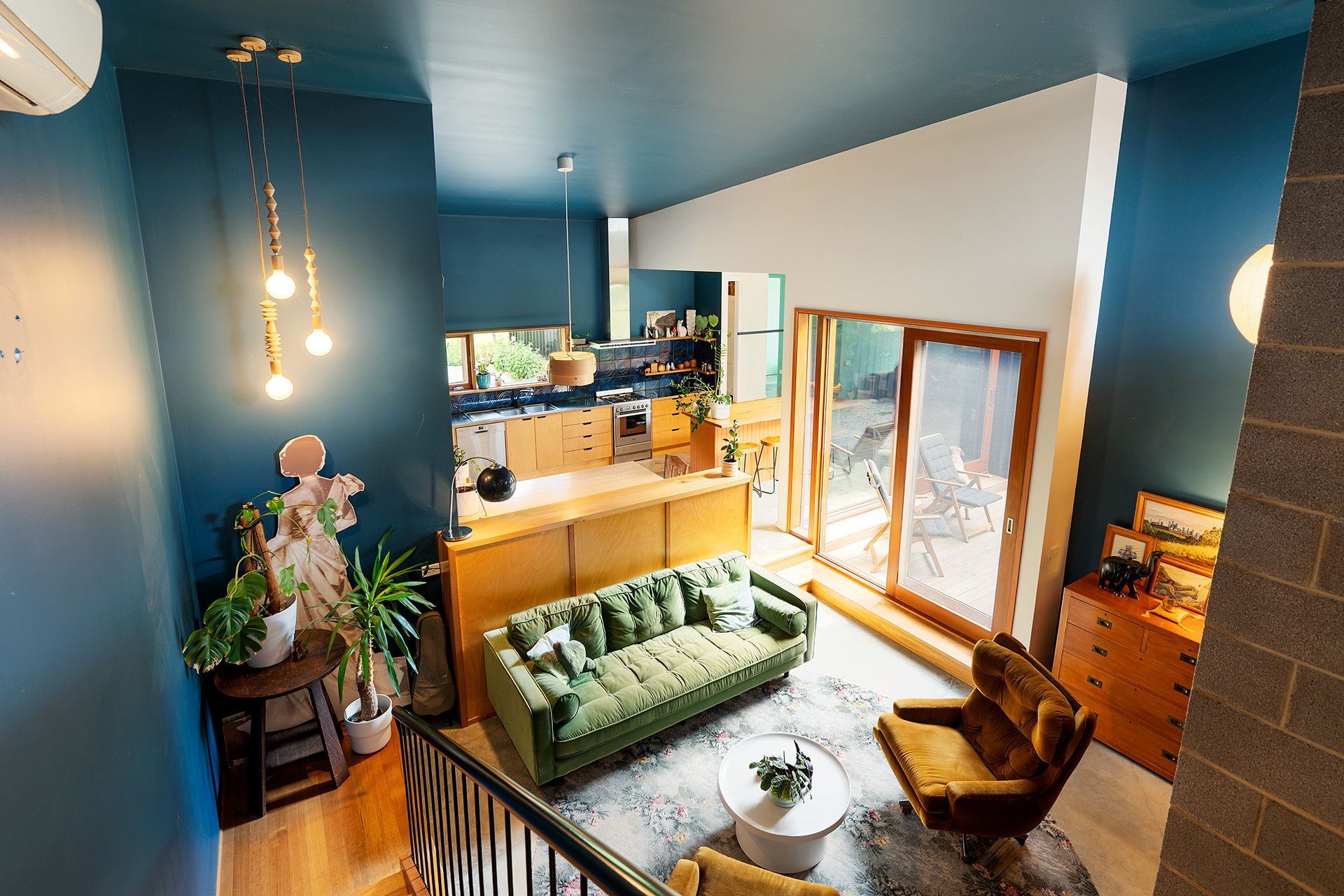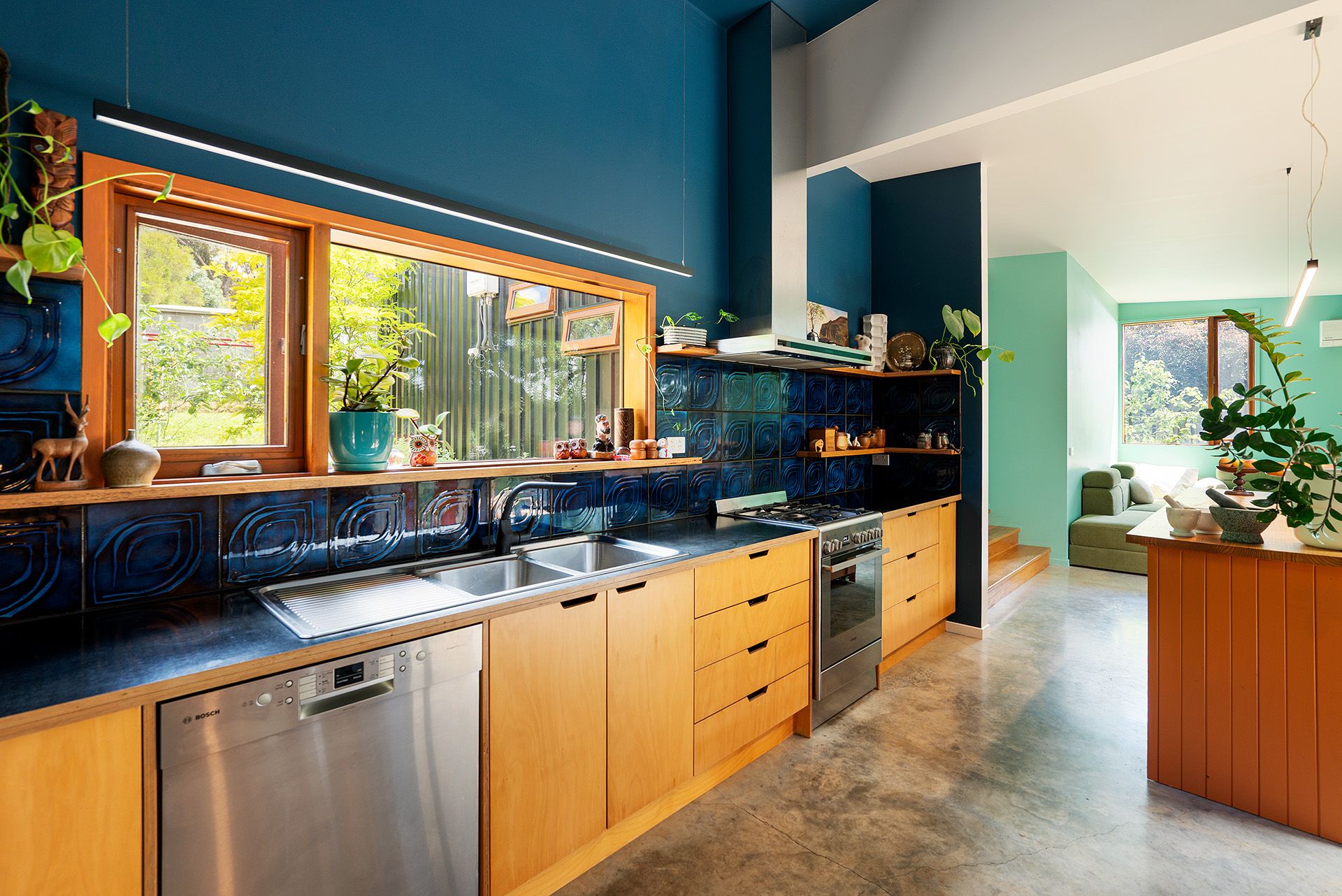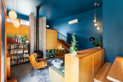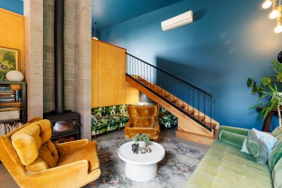 Step inside and discover soaring angled ceilings and a dramatic mezzanine that create a sense of volume and intrigue from the moment you enter. The open-plan kitchen, dining, and dual living zones form the heart of the home, where concrete and timber floors bring warmth and texture to a moody palette of navy and green. The galley-style kitchen overlooks the productive garden and features a freestanding gas cooktop and oven, dishwasher, and a timber island bench on casters, perfect for casual dining and flexible entertaining. A butler's pantry cleverly incorporates laundry facilities, while a dedicated mudroom with dual external access provides a practical link between indoors and outdoors.