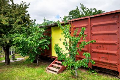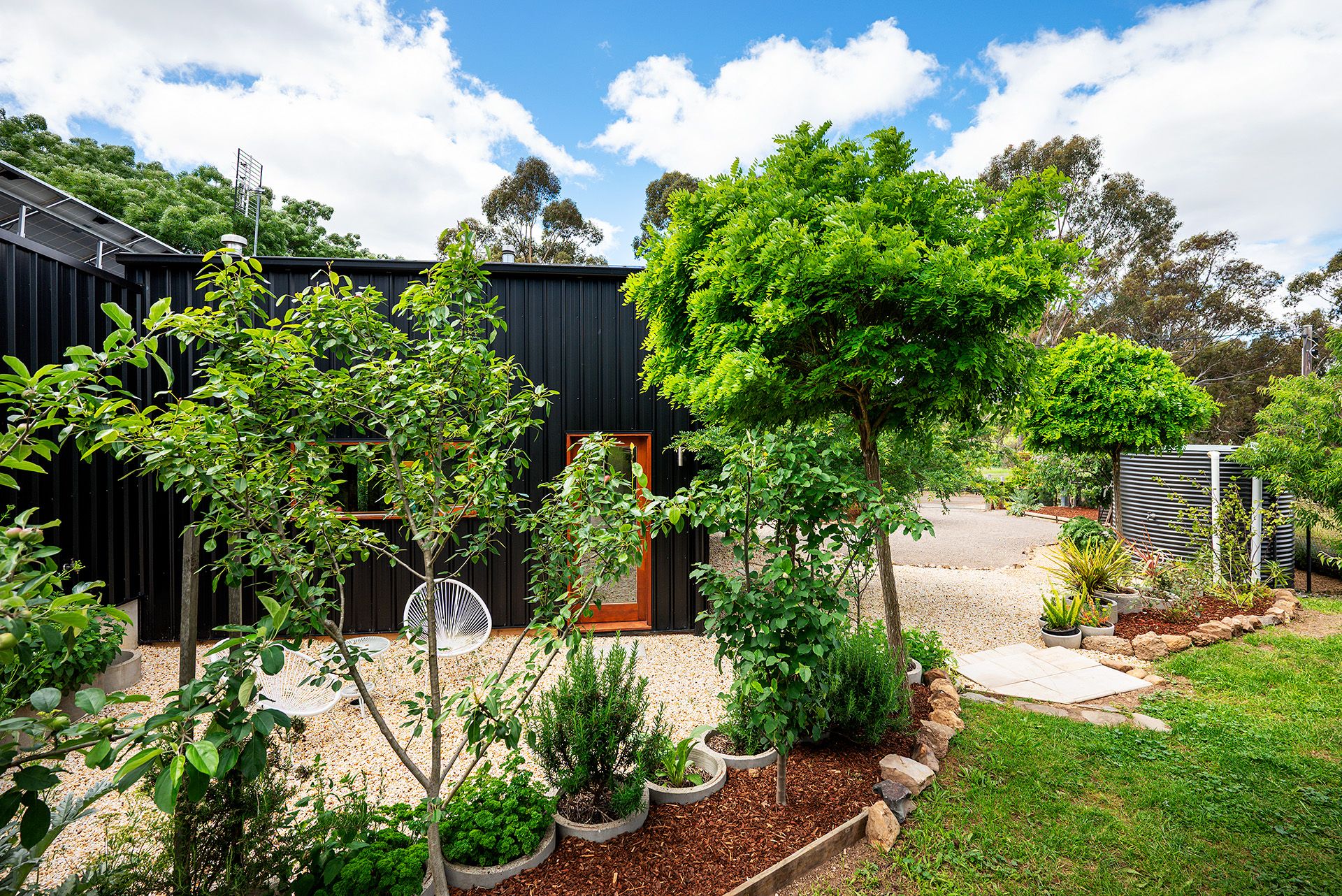 Sustainability and comfort are at the forefront, with double glazing, high-level insulation, and an integrated solar system ensuring year-round efficiency. A large water tank supports the thriving garden, while concrete pipes double as a clever retaining wall and planter. A garage, gravel pathways, and a vintage V-Line caboose, ideal as storage or a quirky home office, add to the home's unique character.