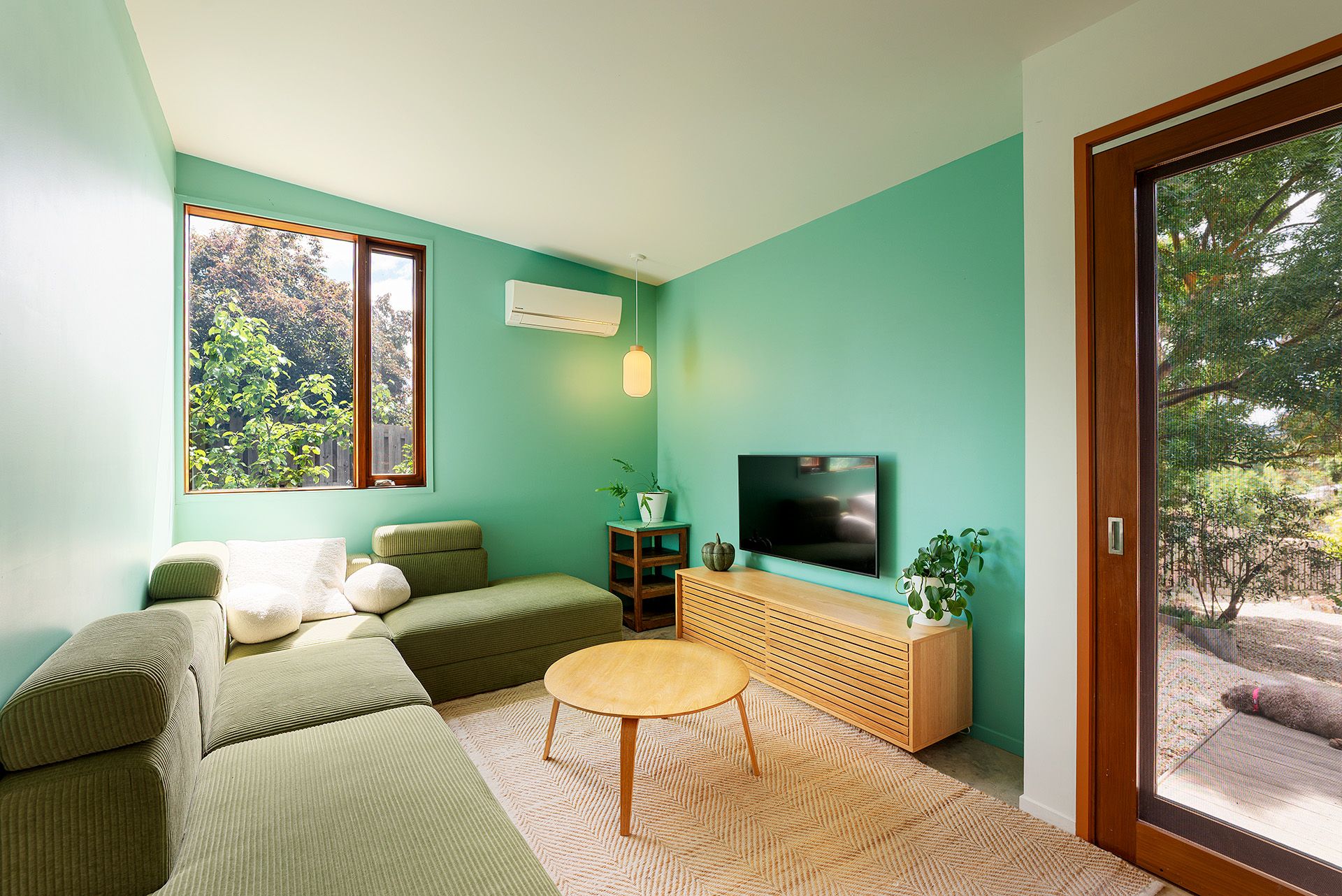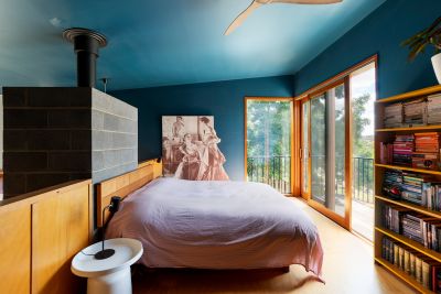 The sunken living area invites relaxation with its pitched 4.5-metre ceiling and solid wood heater, creating an intimate space for winter evenings. Sliding doors from both the kitchen and lounge open to a north-facing deck, embracing seamless indoor–outdoor living and framing views across raised veggie beds, orchard, and lawn.