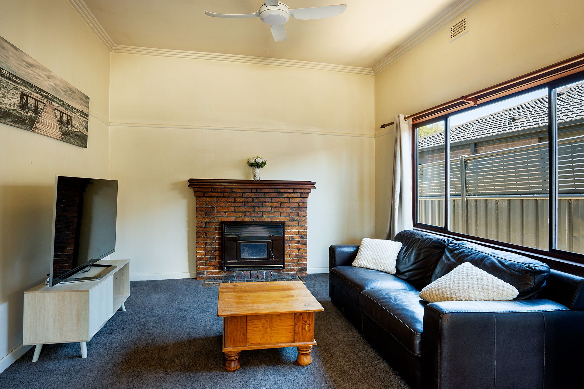 Inside, the home features a front-facing living room with a gas heater, flowing into an adjoining dining space highlighted by a classic brick fireplace surround. At the heart of the home, the kitchen retains its period charm with a freestanding gas cooktop set within a traditional surround, complemented by storage and direct access to the backyard. There are three spacious bedrooms, with the main positioned at the front of the home, while the bathroom includes a shower, bath, and vanity, with a separate toilet conveniently located off the laundry.