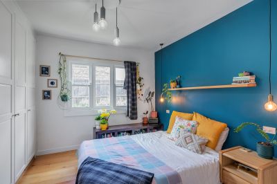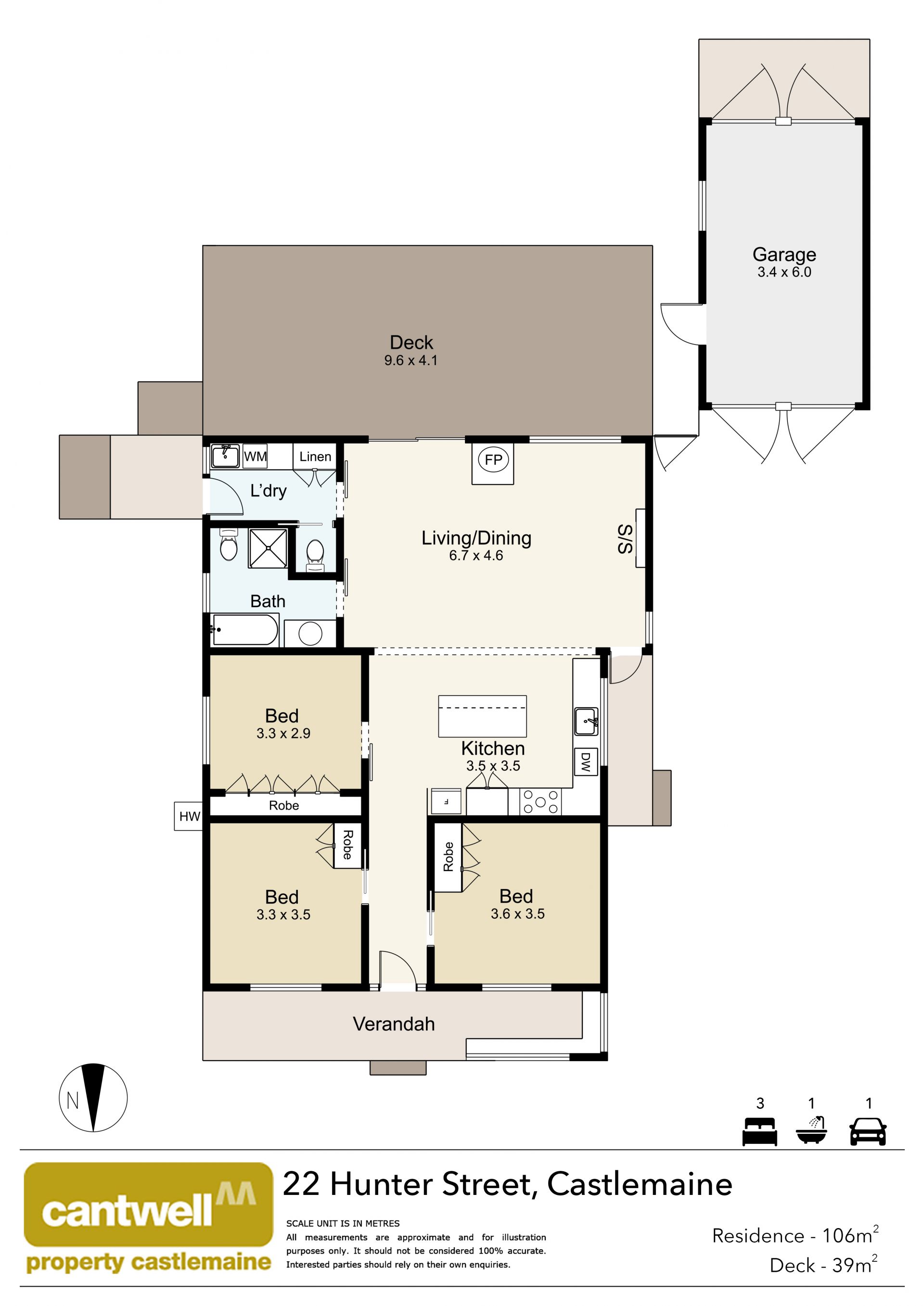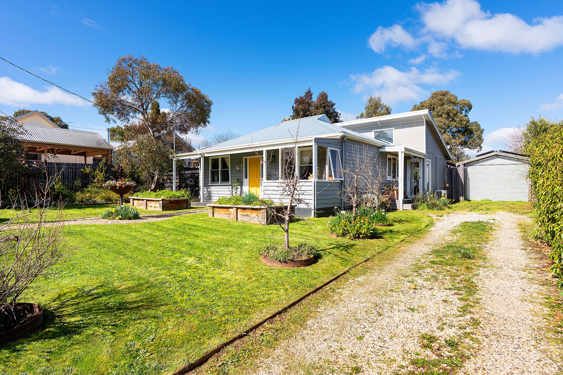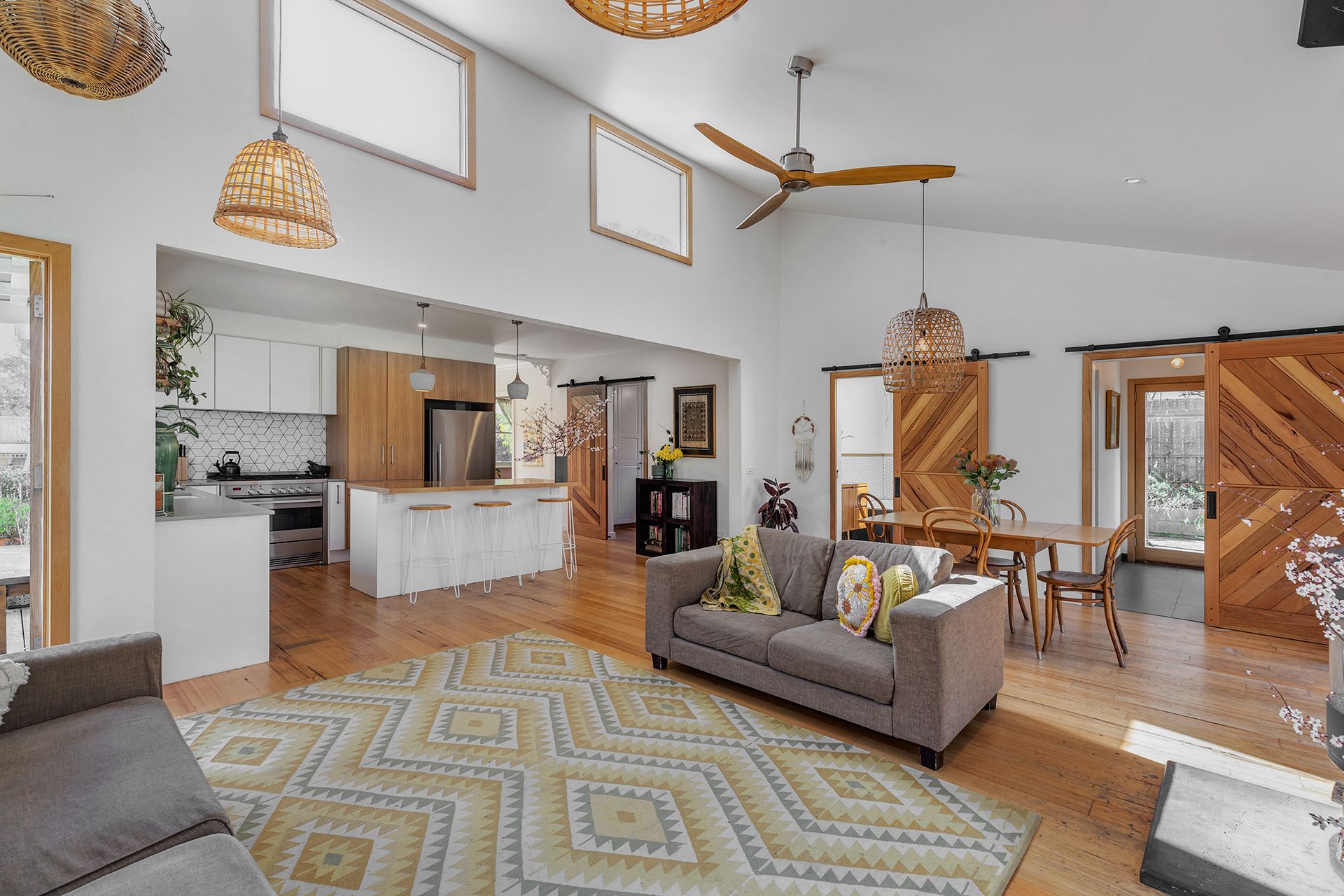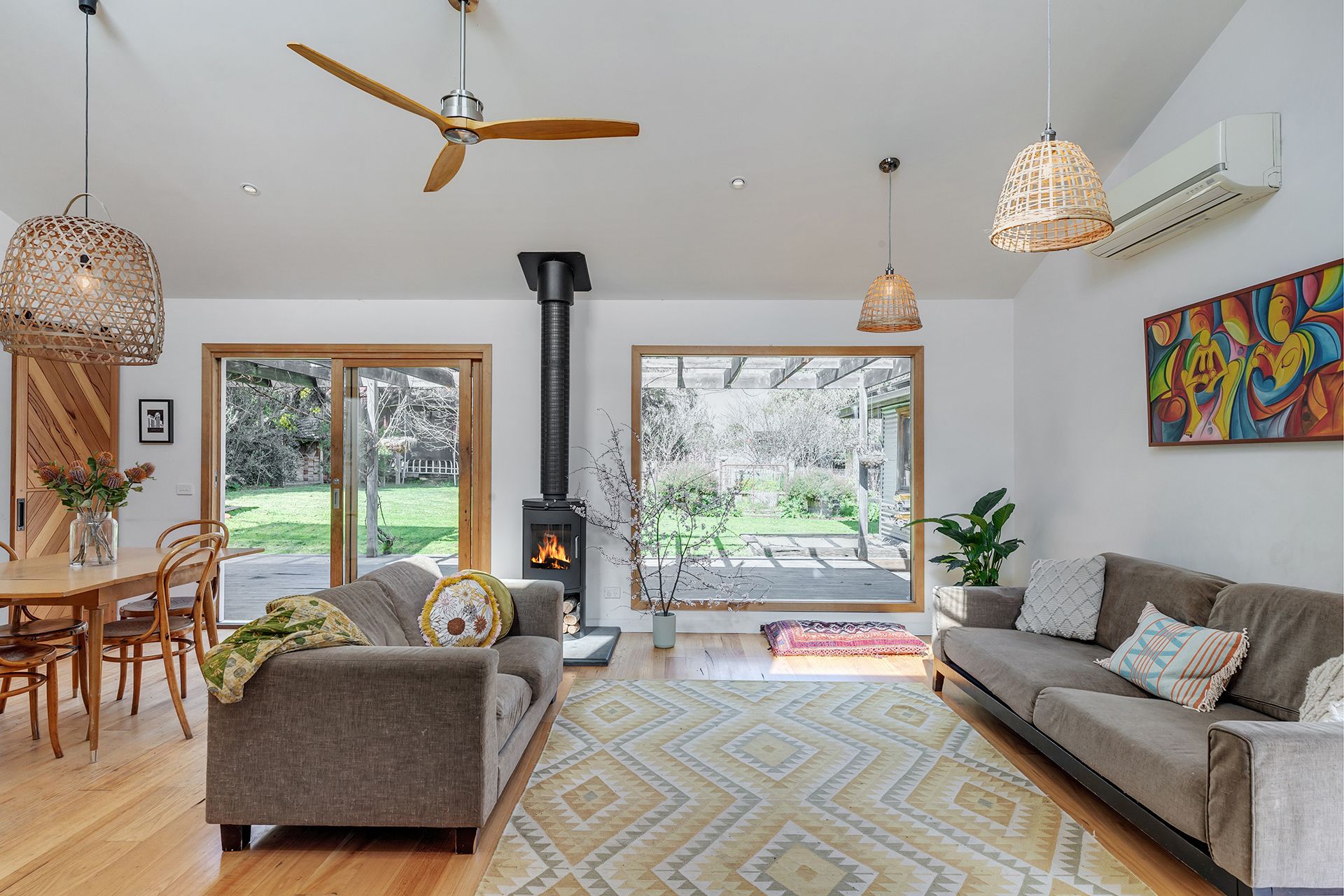 Enter through the vibrant yellow door from the semi-enclosed front verandah into a central hallway, drawing you to the rear of the stunning renovated home, with a high raked ceiling, large double-glazed windows and a contemporary kitchen. The open plan kitchen with living and dining features an island bench with storage and additional seating space, soft close drawers, a dishwasher and a 900mm freestanding gas cooktop with an oven. The high-raked ceiling provides north light into the living and dining space that features a split system, ceiling fan and a Morso solid wood heater, adding a touch of Danish style and design. A sliding door leads to a 9.6m x 4.1m deck with a vine-covered pergola overlooking the south-facing back garden. Three bedrooms have built-in robes, serviced by an updated bathroom with a bath, shower, vanity and toilet, highlighted statement tiles, featured in both the bathroom and the kitchen. A laundry with external access and a second additional toilet complete the floorplan. Internal details include an integrated solar system and floorboards.