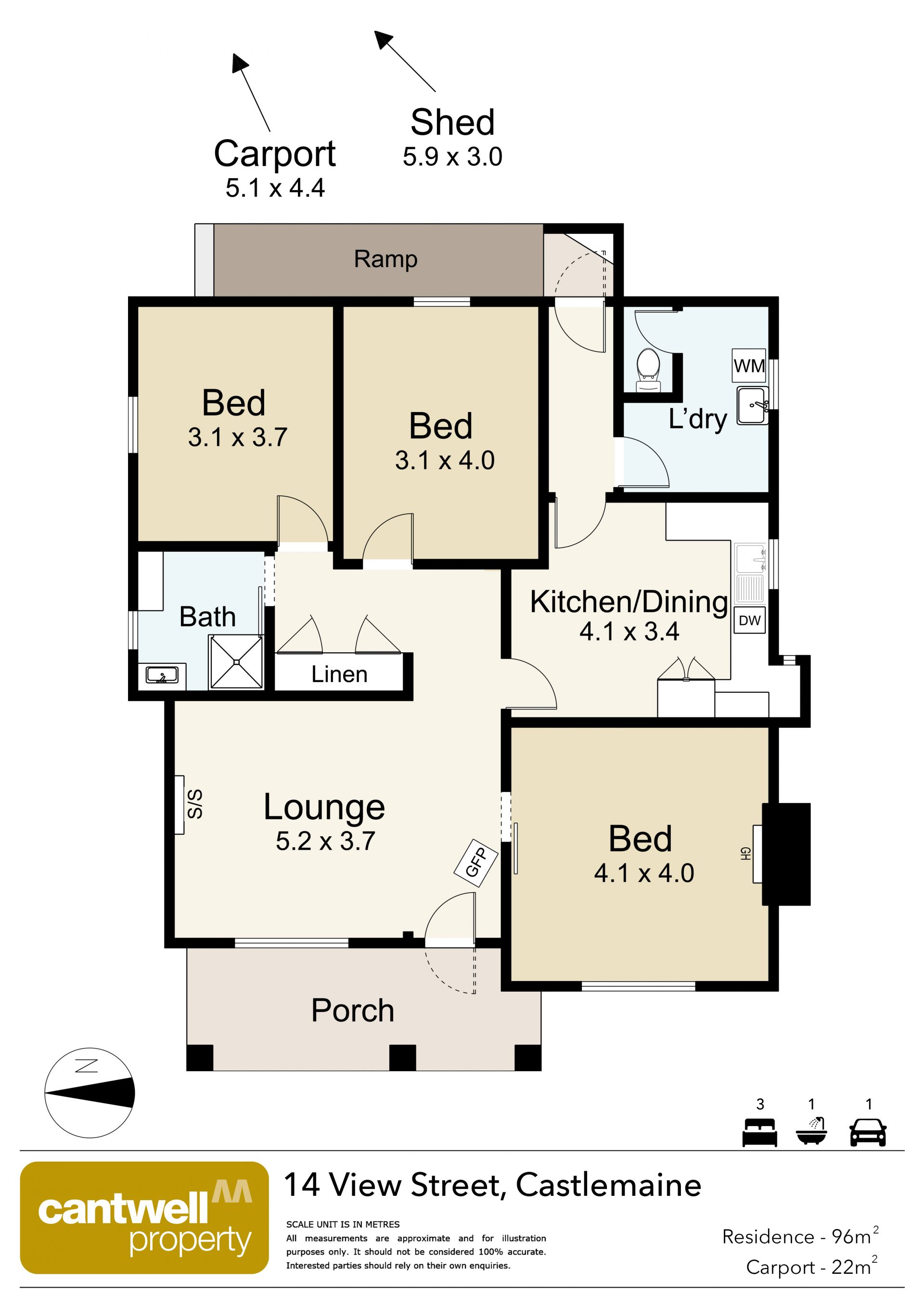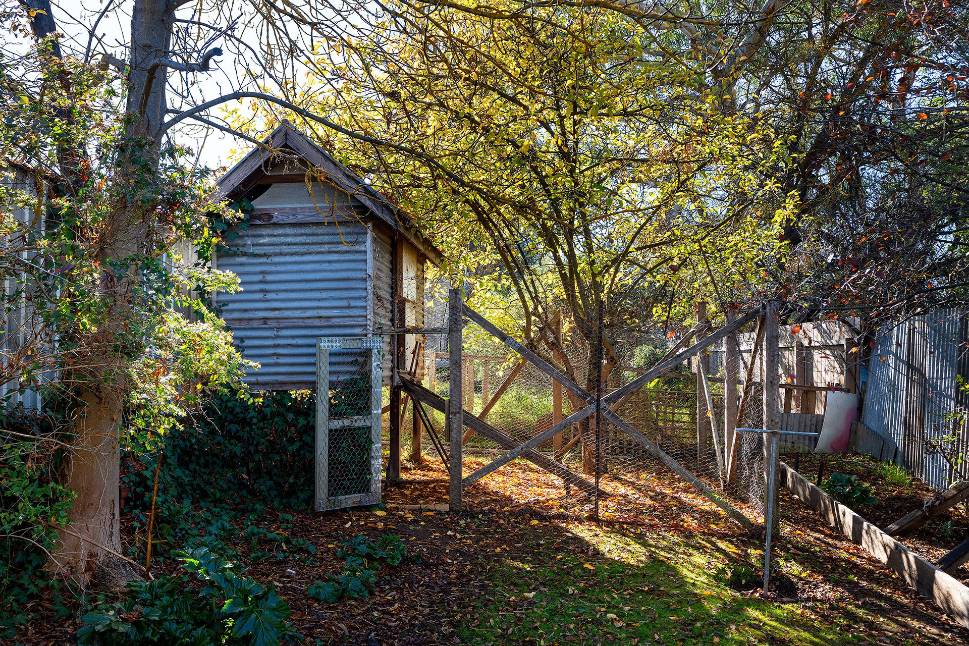 A driveway leads to a 5.1m x 4.4m double carport, and the fully fenced back garden features a 5.9m x 3m garage, an enclosed veggie garden with kiwi fruit, apple and feijoa trees, a chicken pen and a low maintenance garden with established trees.