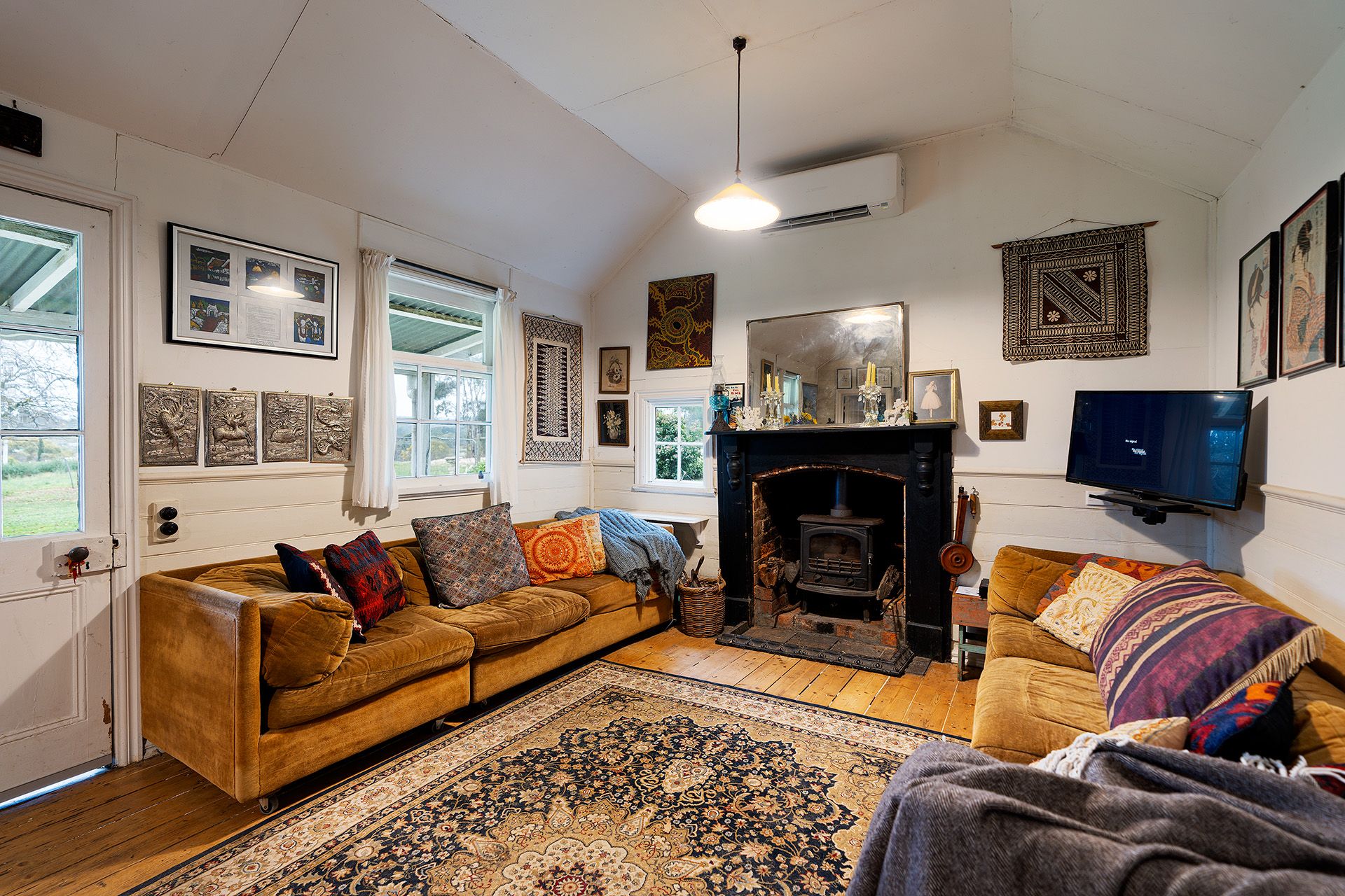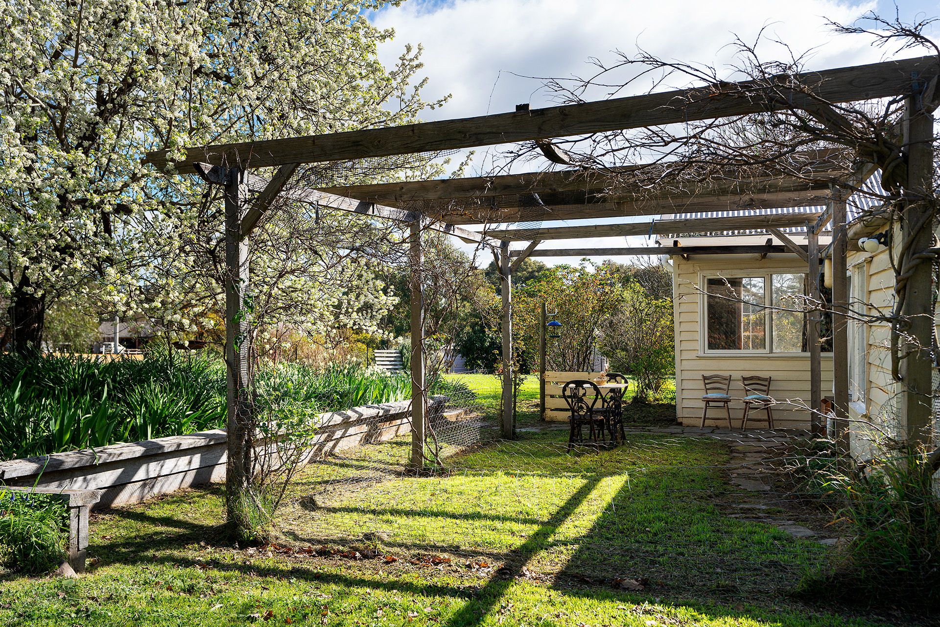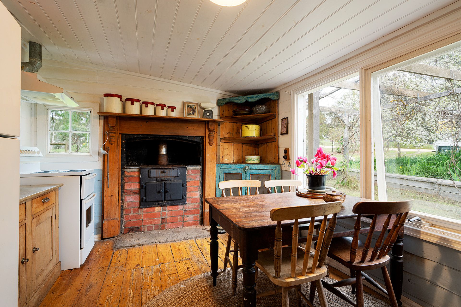 Before entering the cottage, a north-facing front verandah invites you to relax while enjoying views of the surrounding landscape. The floorplan features direct entry into the living and dining, with all the period charm of a cove ceiling, floorboards, a timber-lined Dado, quaint 6/6 windows, and a solid wood heater inset into a period fireplace with surround. The country-style kitchen provides a freestanding electric cooktop with an oven, a wood-burning stove inset into a period fireplace with timber surround, and a large window that frames the back garden with ornamental pear trees and a pergola.