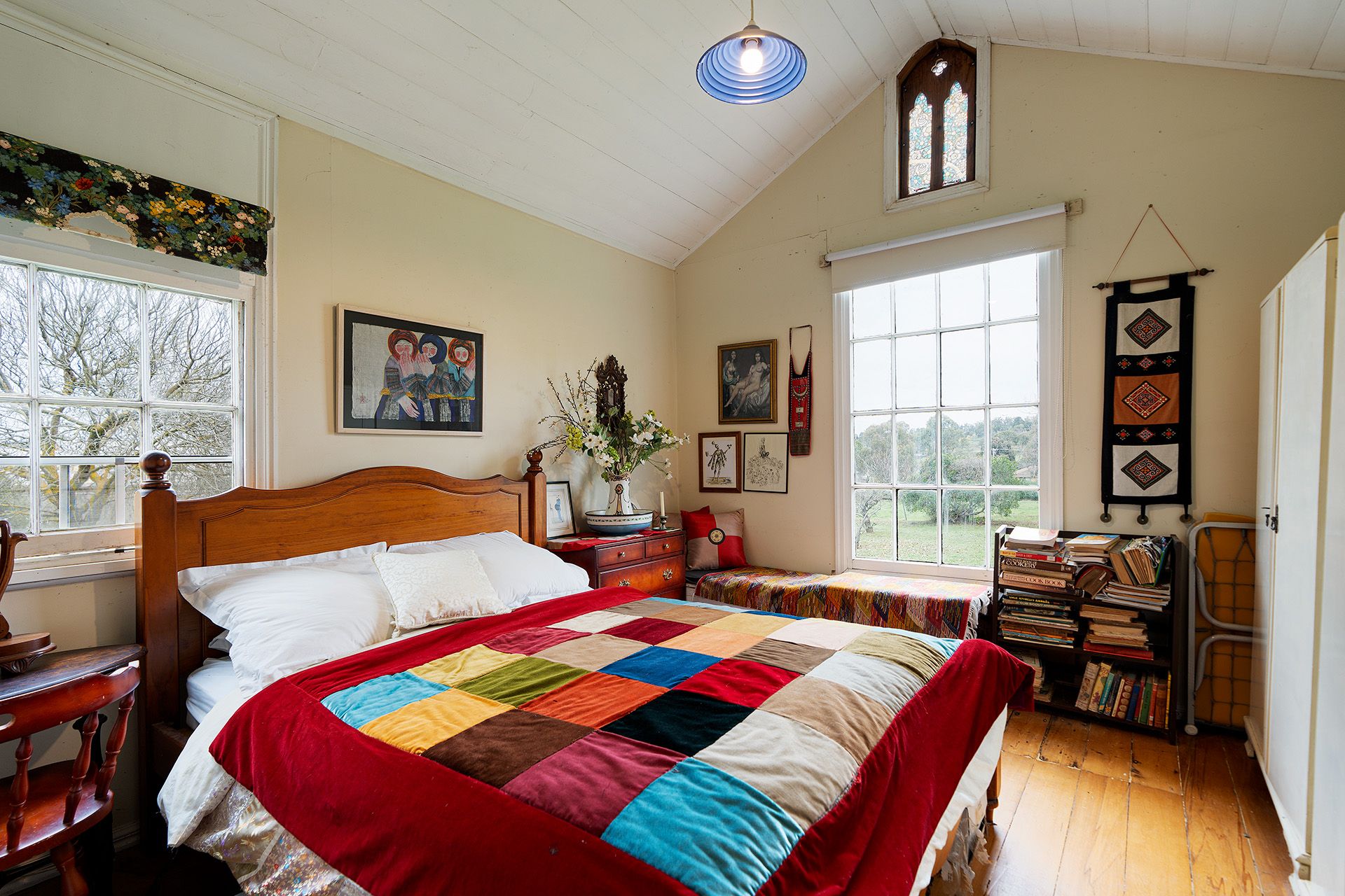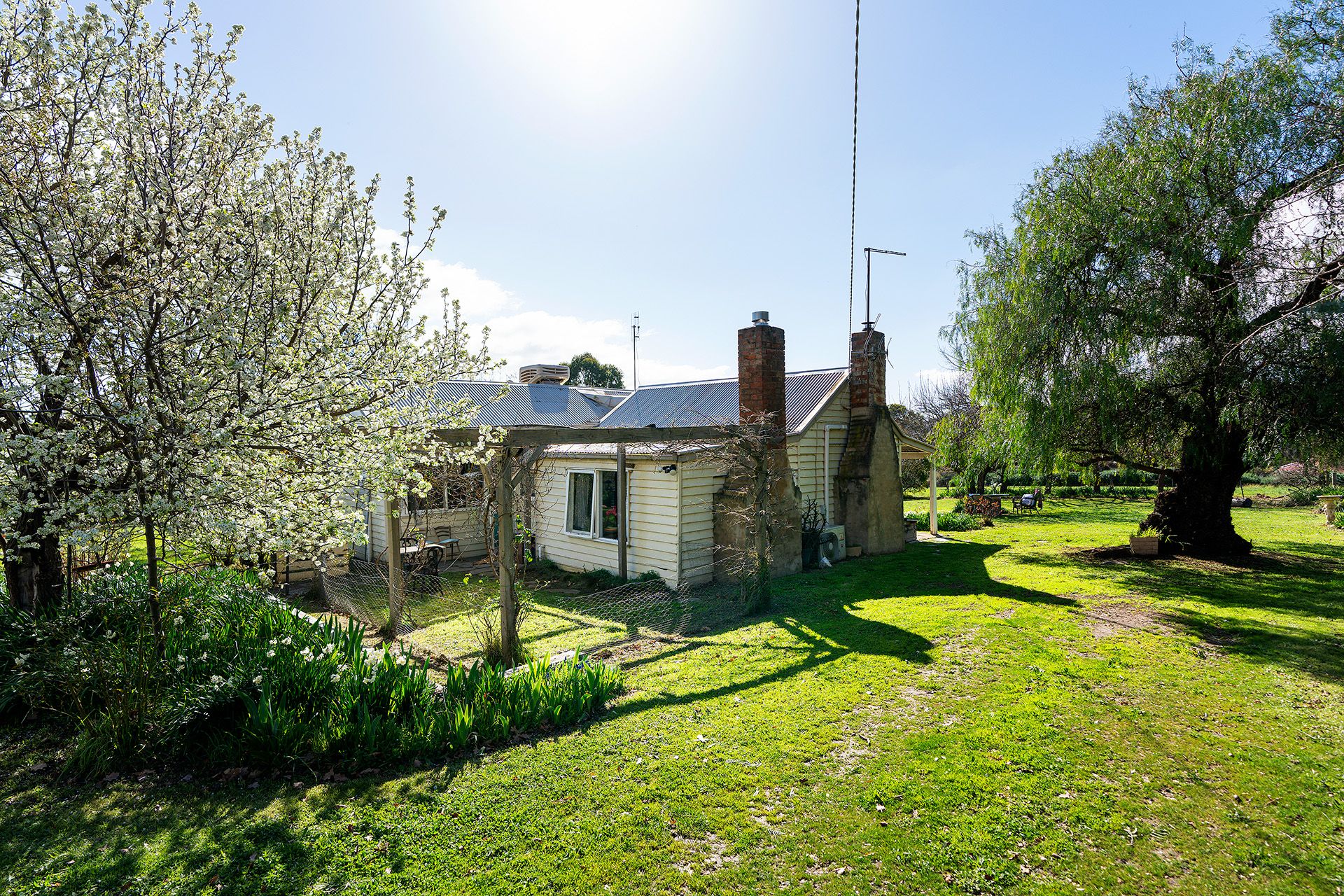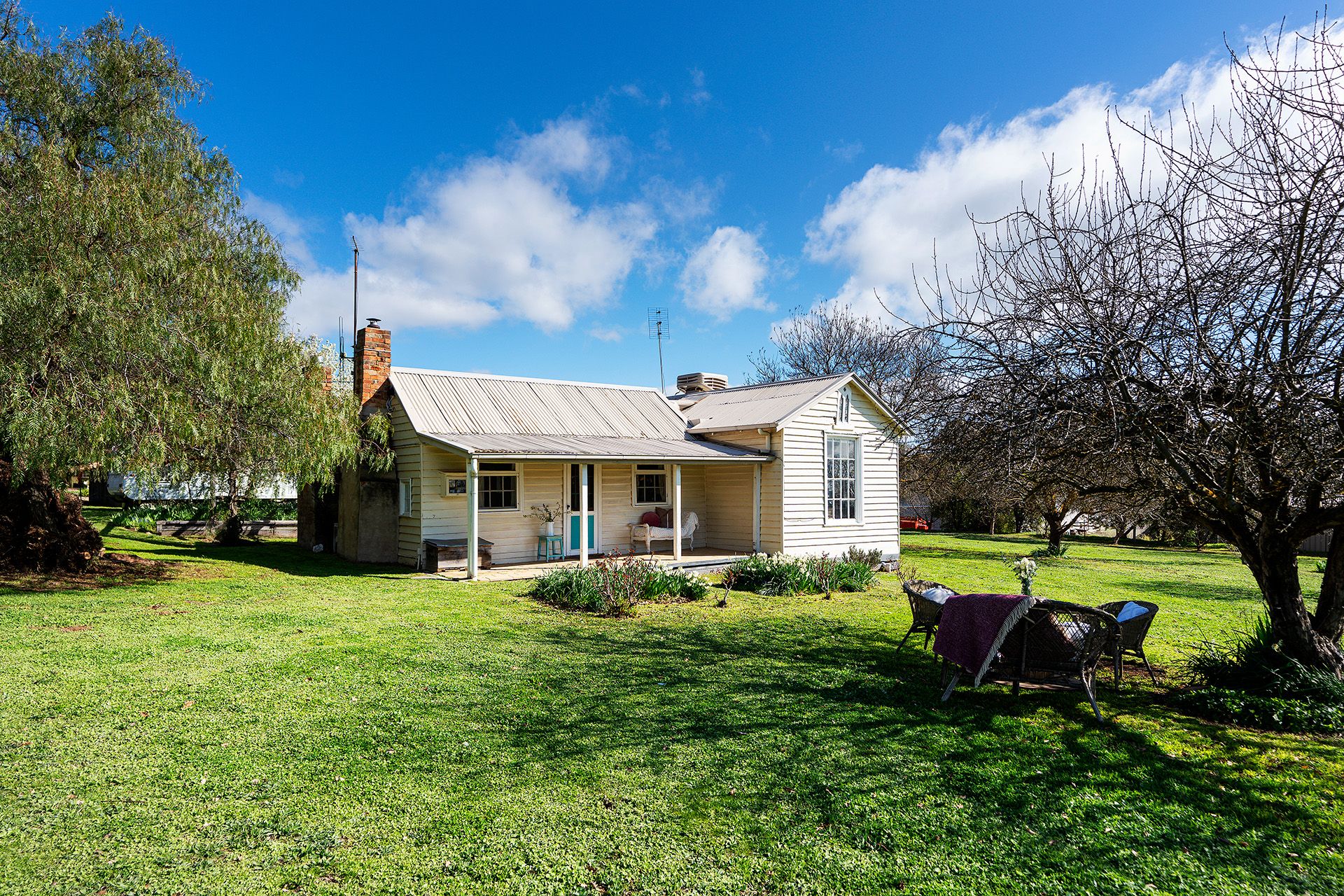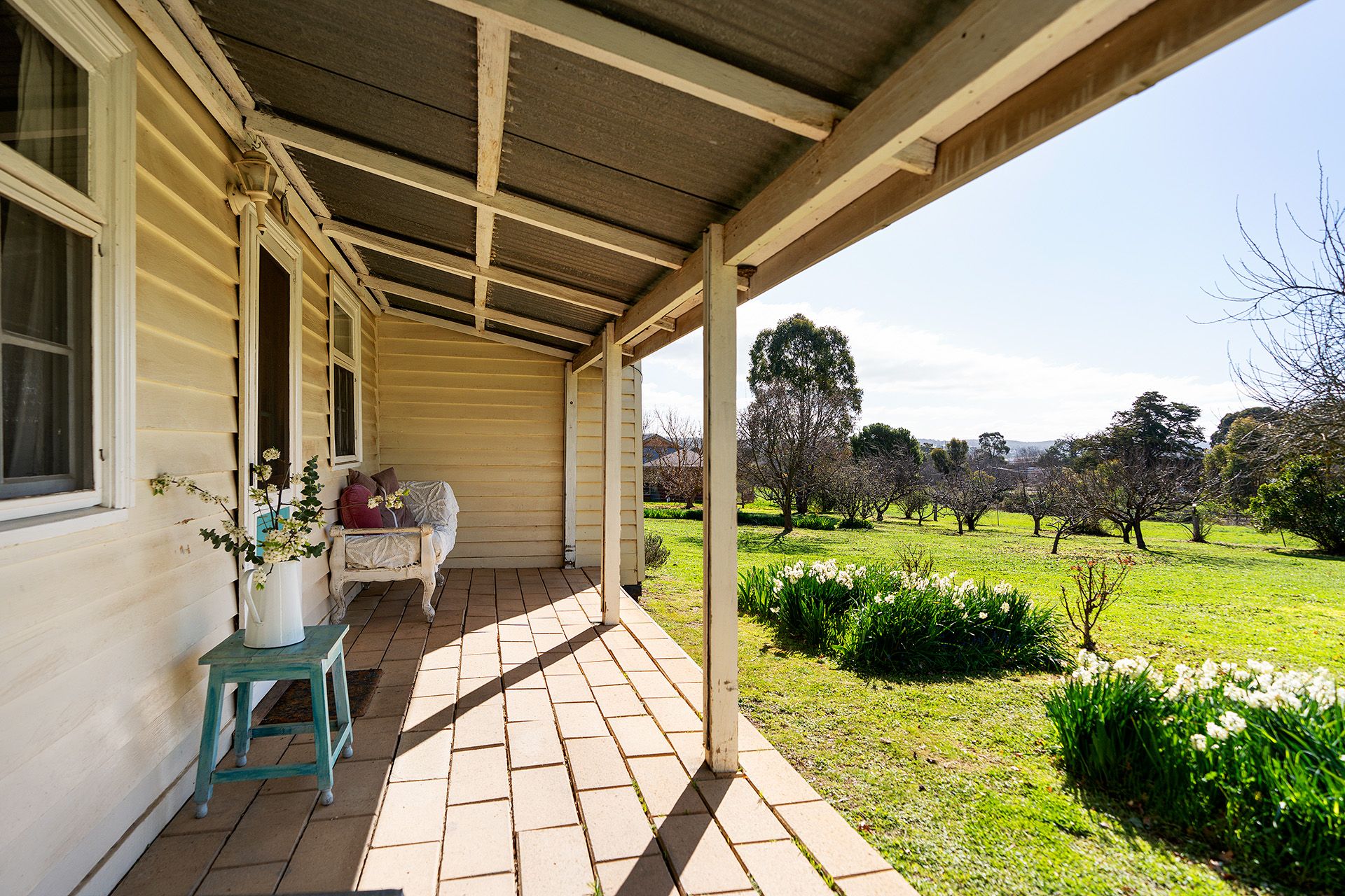 Before entering the cottage, a north-facing front verandah invites you to relax while enjoying views of the surrounding landscape. The floorplan features direct entry into the living and dining, with all the period charm of a cove ceiling, floorboards, a timber-lined Dado, quaint 6/6 windows, and a solid wood heater inset into a period fireplace with surround. The country-style kitchen provides a freestanding electric cooktop with an oven, a wood-burning stove inset into a period fireplace with timber surround, and a large window that frames the back garden with ornamental pear trees and a pergola.