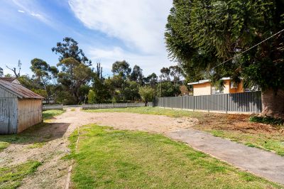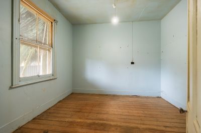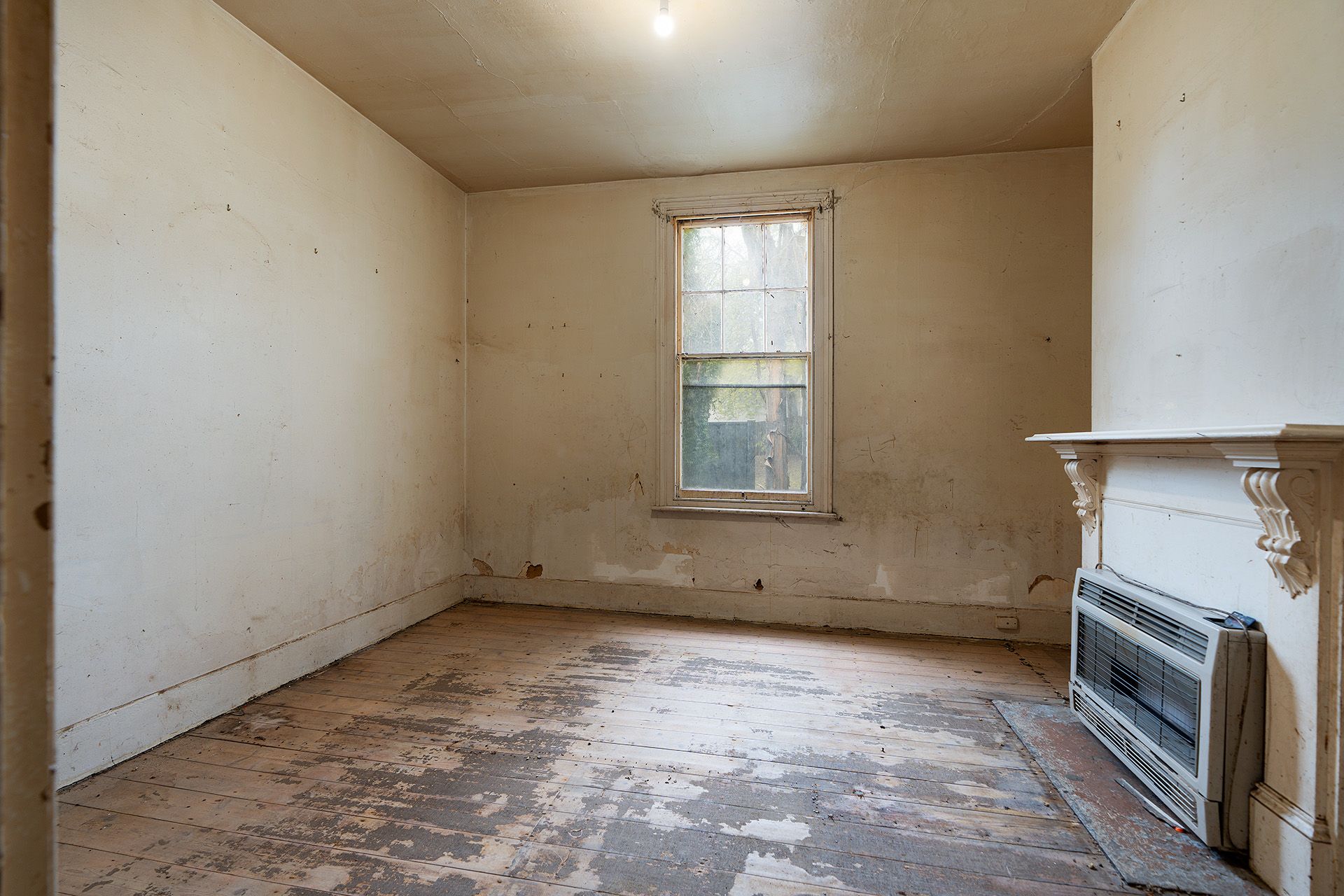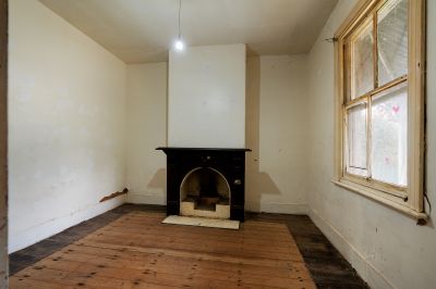 The Victorian building is positioned towards the rear of the property, allowing for a generous north-facing front garden. In its current state, the home features two front-facing bedrooms with double-hung windows, one with an open fireplace with a period timber surround and a central hall leading to a third bedroom with a gas heater inset into a fireplace with a period timber ornate surround and a lounge room with French doors. To the rear of the home is the kitchen with dining. The kitchen with a raked timber-clad ceiling provides a solid wood heater inset into a period fireplace and a freestanding gas cooktop with an oven. The bathroom in its present state includes a shower over the bath and a wall basin, and completing the floorplan is a laundry with a separate toilet. Period details include high ceilings and timber flooring