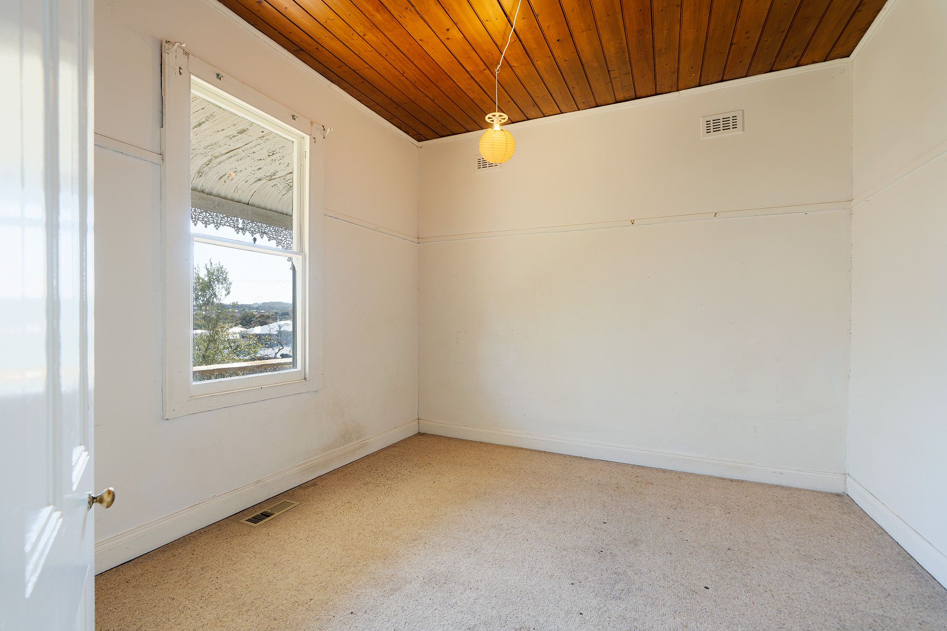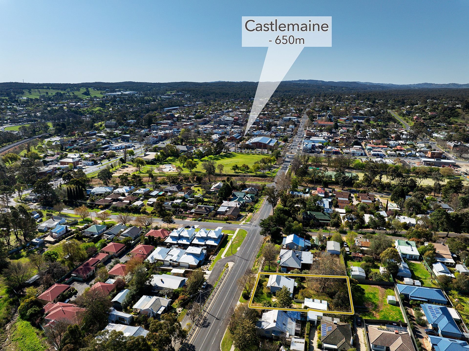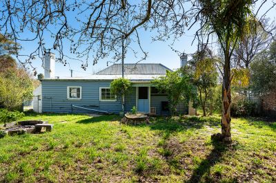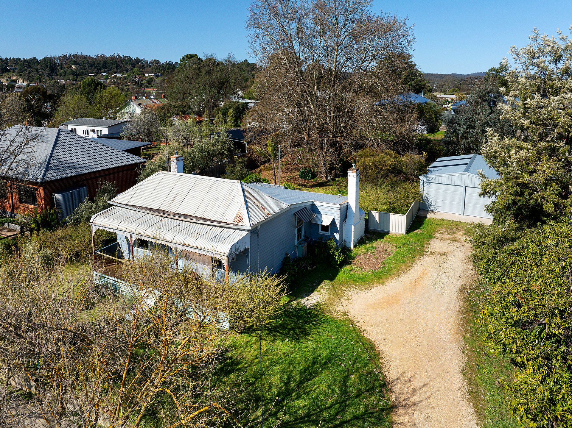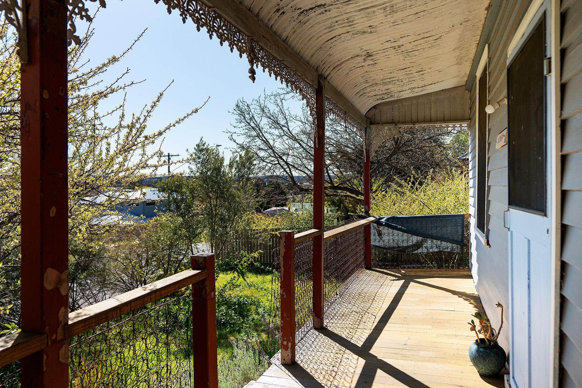 Private from the street, steps lead to a front verandah with lovely views of the surrounding landscape and the township of Castlemaine. The floorplan features a central hall leading to a central north-facing living room with a raked ceiling, an open fireplace with a brick surround, and a ceiling fan, two front-facing bedrooms with high ceilings and views of Castlemaine, and a third bedroom with shelving and a raked ceiling. To the rear of the home is the kitchen with dining with outlooks of the back garden. In its current condition, the kitchen provides a freestanding gas cooktop and oven. Completing the floorplan is a laundry with external access, a bathroom with a shower over the bath, a vanity, and a separate toilet. Updates to the property include ducted heating, period details being high ceilings, timber cladding, ornate plasterwork, double hung and 6 x 6 windows.