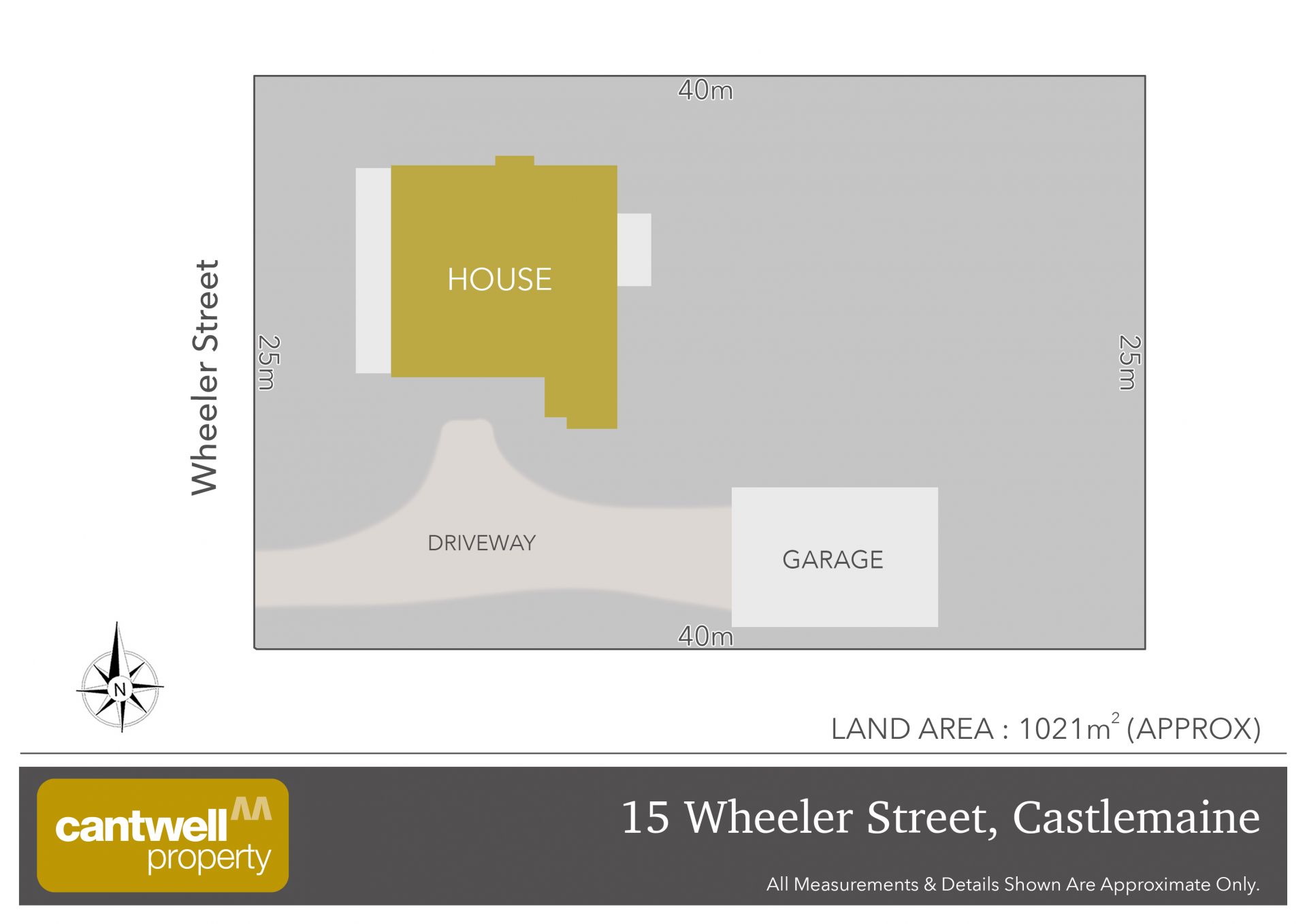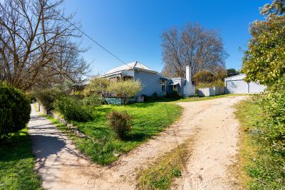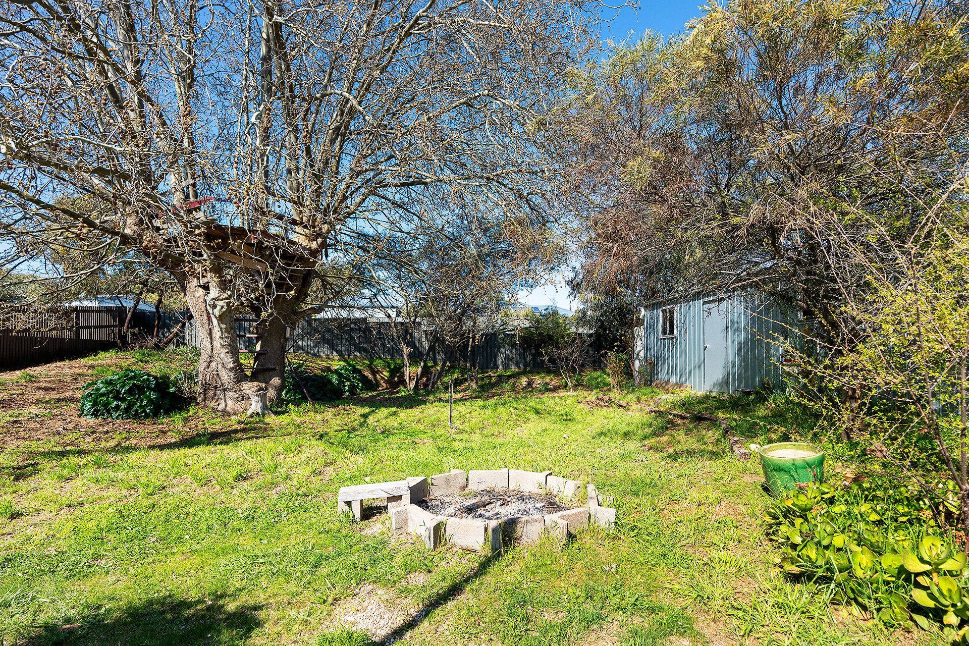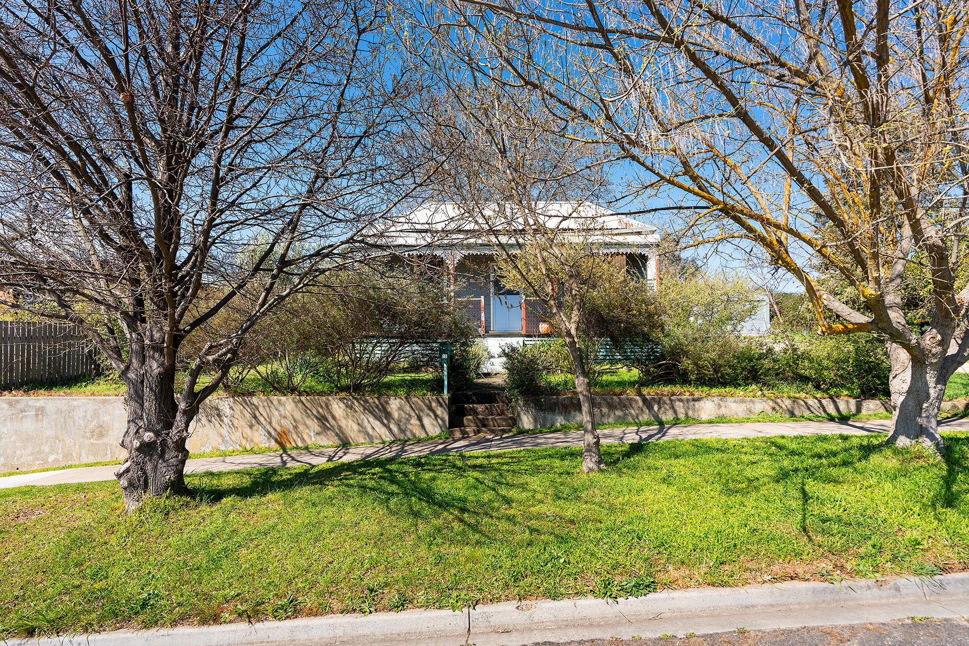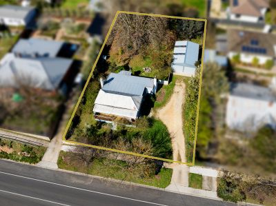 Private from the street, steps lead to a front verandah with lovely views of the surrounding landscape and the township of Castlemaine. The floorplan features a central hall leading to a central north-facing living room with a raked ceiling, an open fireplace with a brick surround, and a ceiling fan, two front-facing bedrooms with high ceilings and views of Castlemaine, and a third bedroom with shelving and a raked ceiling. To the rear of the home is the kitchen with dining with outlooks of the back garden. In its current condition, the kitchen provides a freestanding gas cooktop and oven. Completing the floorplan is a laundry with external access, a bathroom with a shower over the bath, a vanity, and a separate toilet. Updates to the property include ducted heating, period details being high ceilings, timber cladding, ornate plasterwork, double hung and 6 x 6 windows.