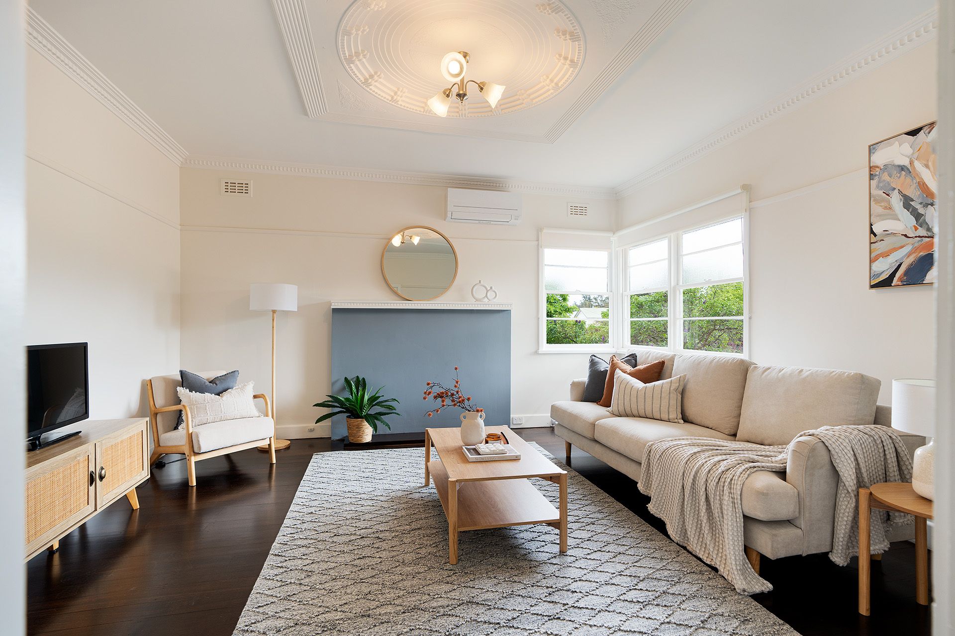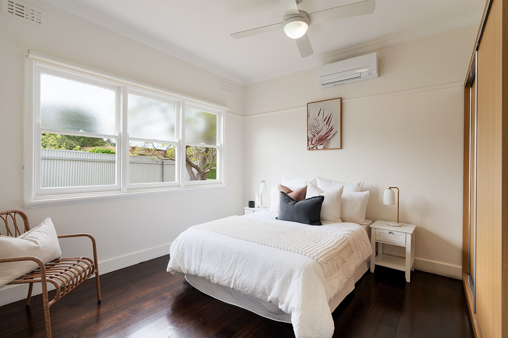 The period home features a spacious north-facing living room with period corner windows, a split system and a beautiful period ornate plaster ceiling. The kitchen with dining overlooks the back garden and has all new appliances, a freestanding electric cooktop with an oven and plenty of storage. Three spacious bedrooms have split systems, one with built-in robes, and the renovated contemporary bathroom has a large shower, a wall-hung vanity and a toilet. To the rear of the home is the laundry, a second toilet, and a sunny passageway with external access to an elevated back deck perfect for a quiet spot to sit and enjoy your morning coffee. Additional details include polished floorboards, ceiling fans, period ornate plasterwork and frosted glass detailing.