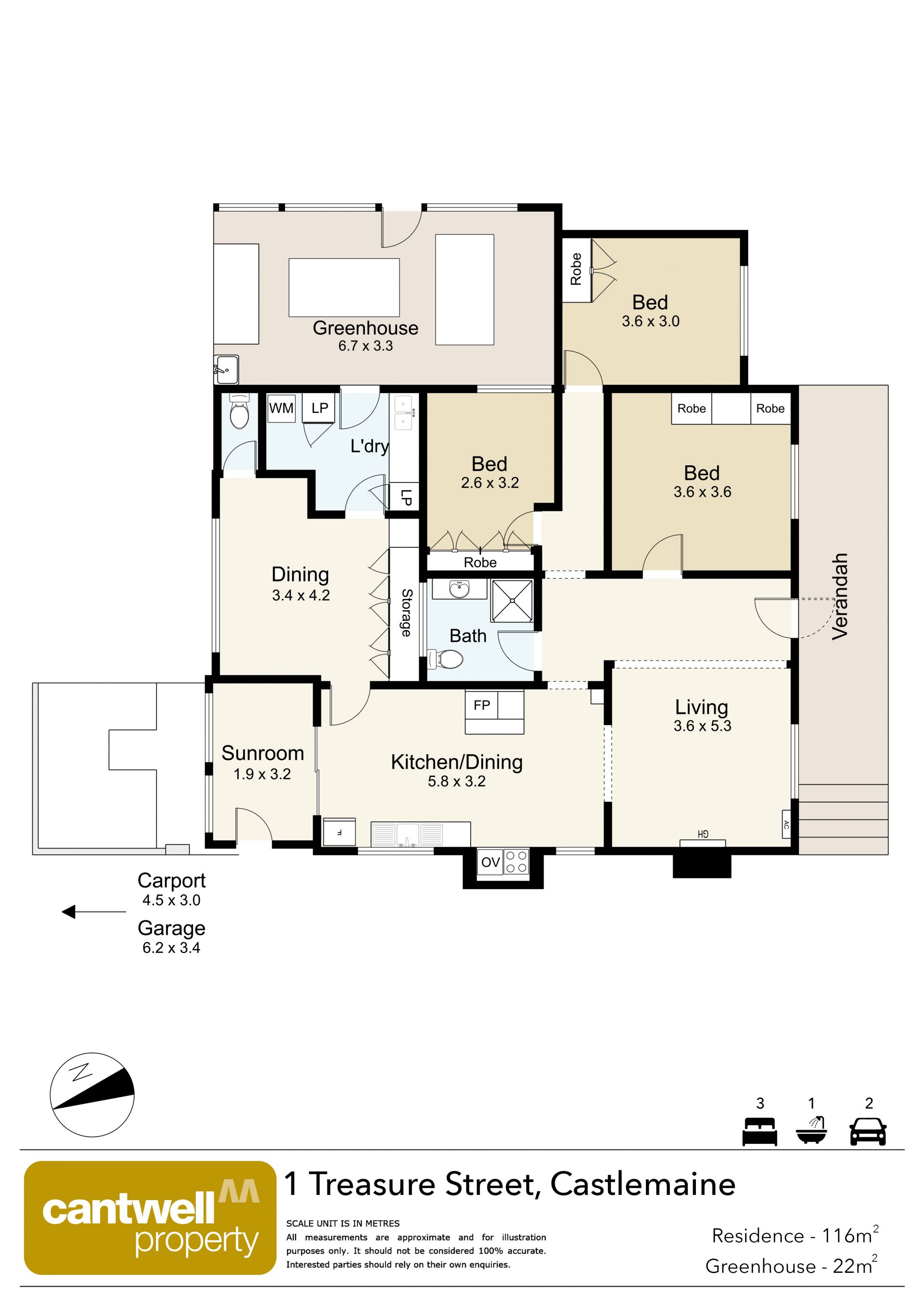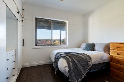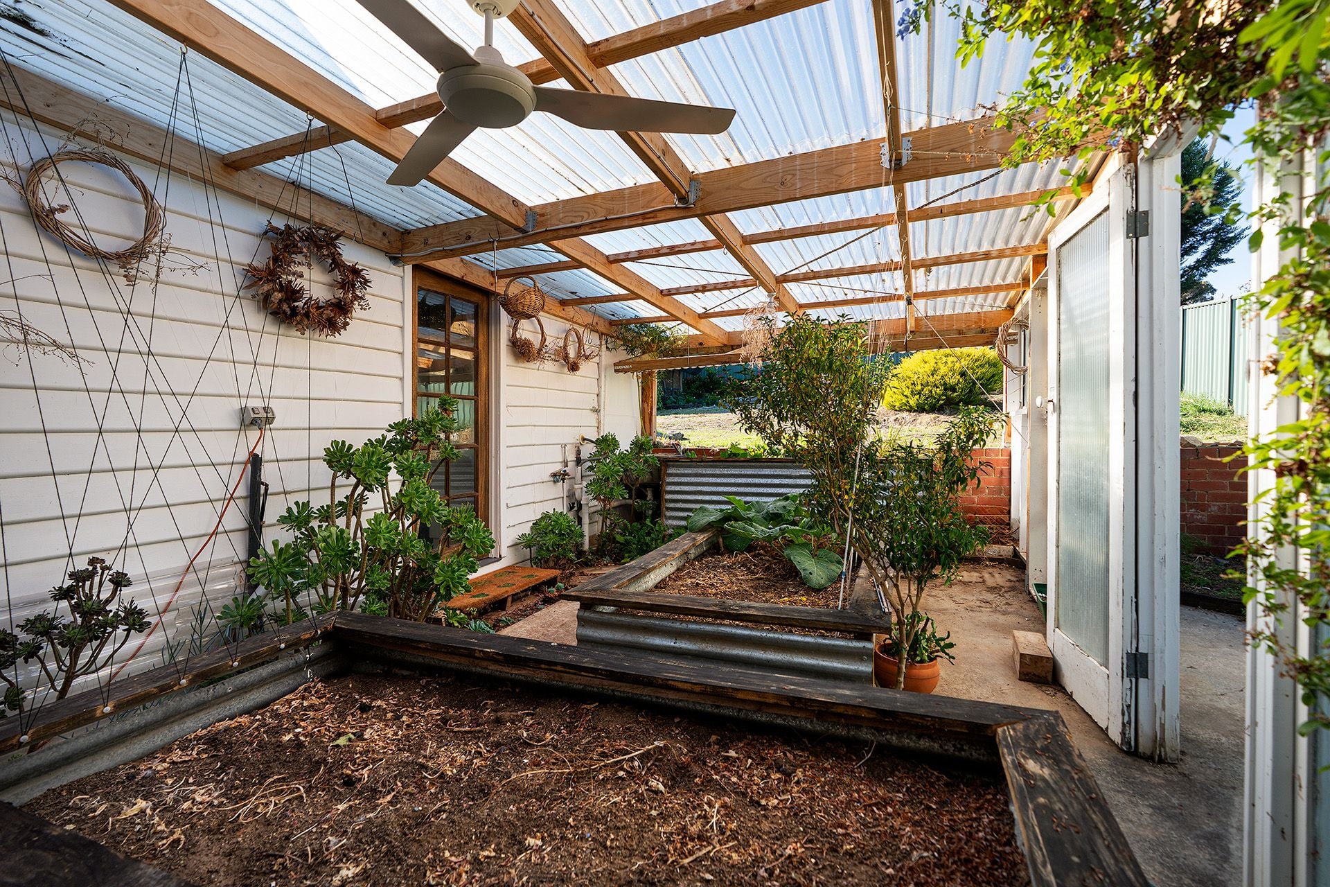 The home features three bedrooms, with the third perfectly suited as a home office. The central bathroom includes a shower, vanity, and toilet, while the front verandah provides a peaceful spot to enjoy your morning coffee while taking in the view. An updated laundry provides external access to a sun-filled greenhouse with raised garden beds – perfect for growing your produce or enjoying quiet moments surrounded by greenery.