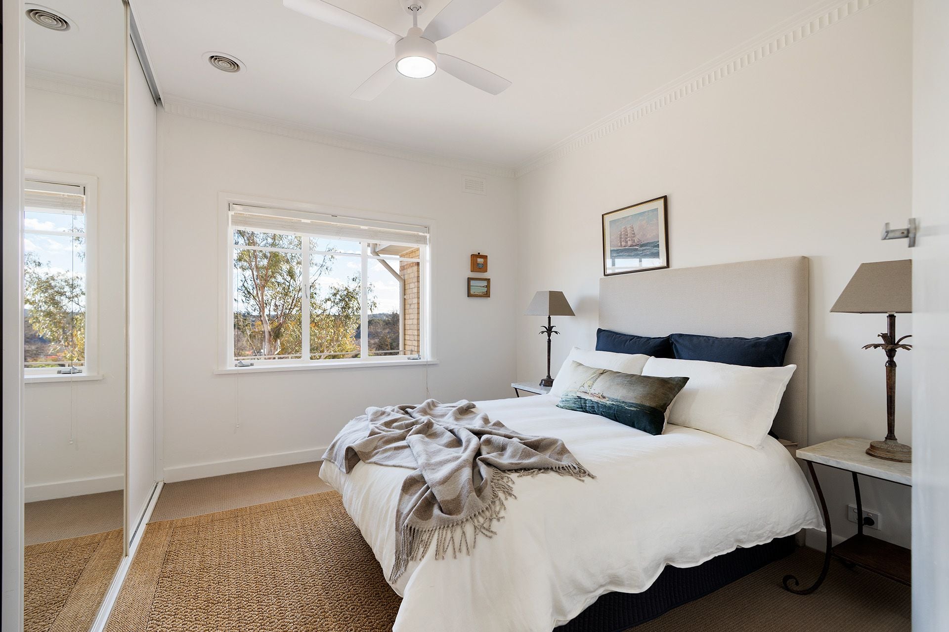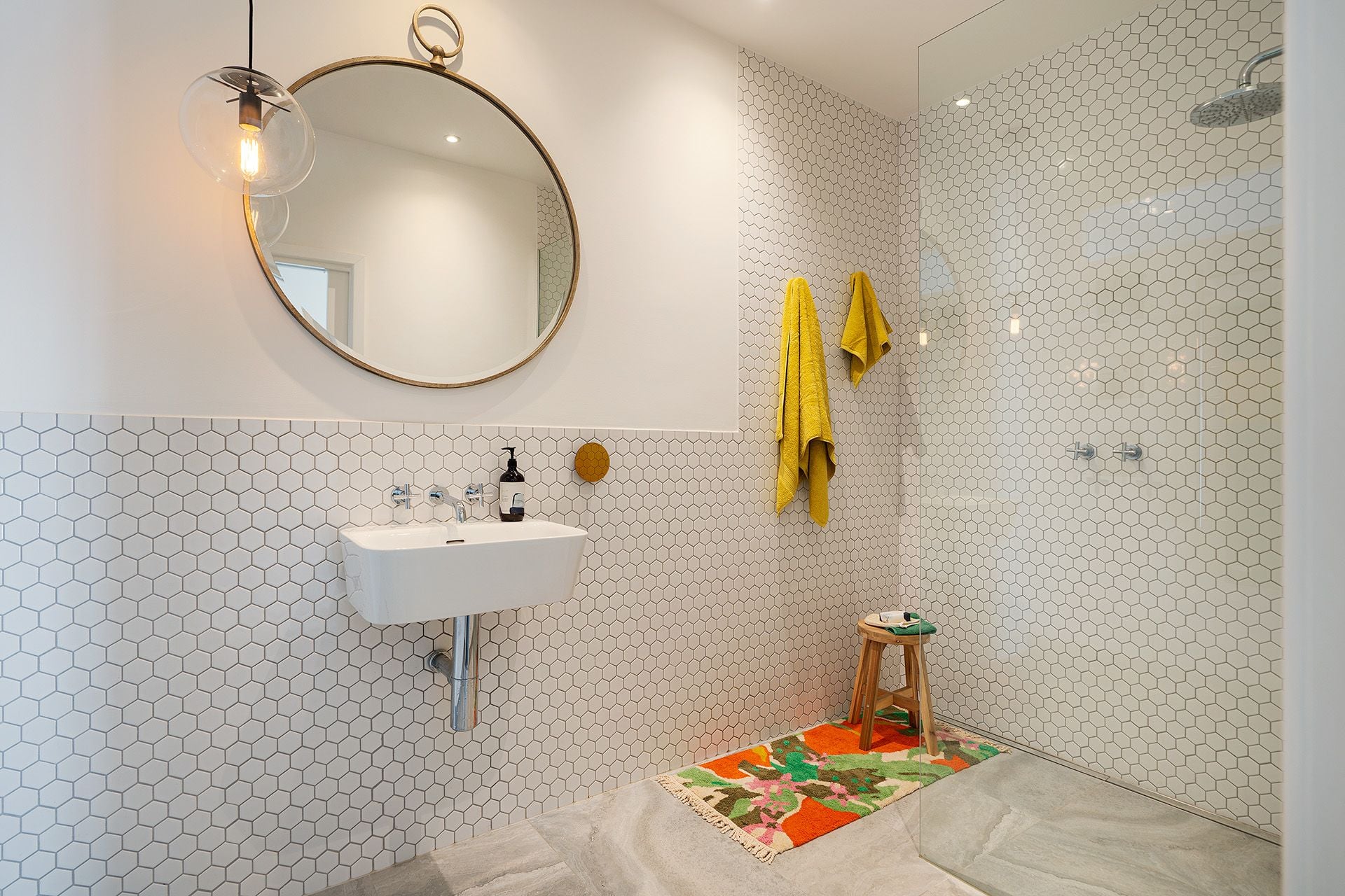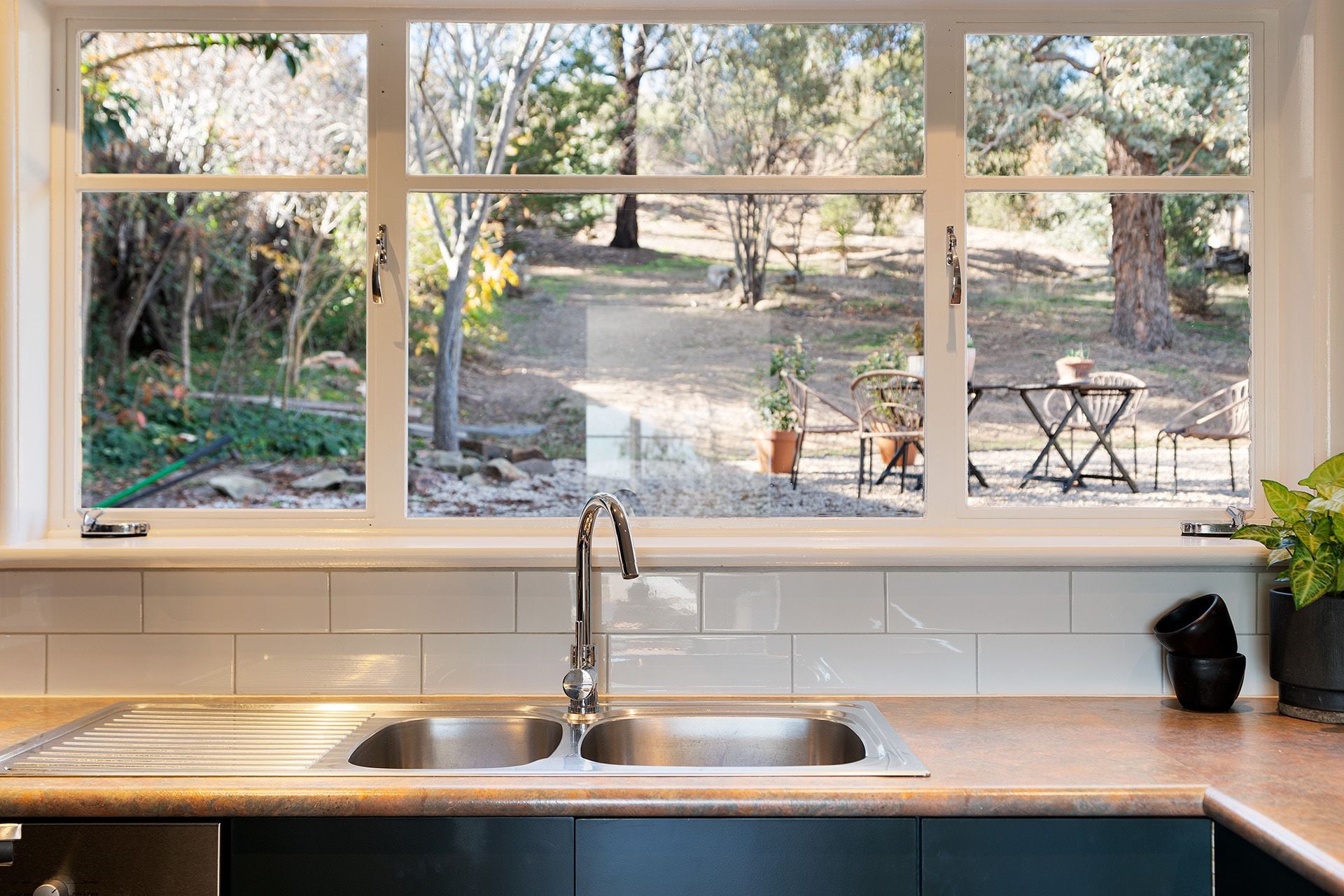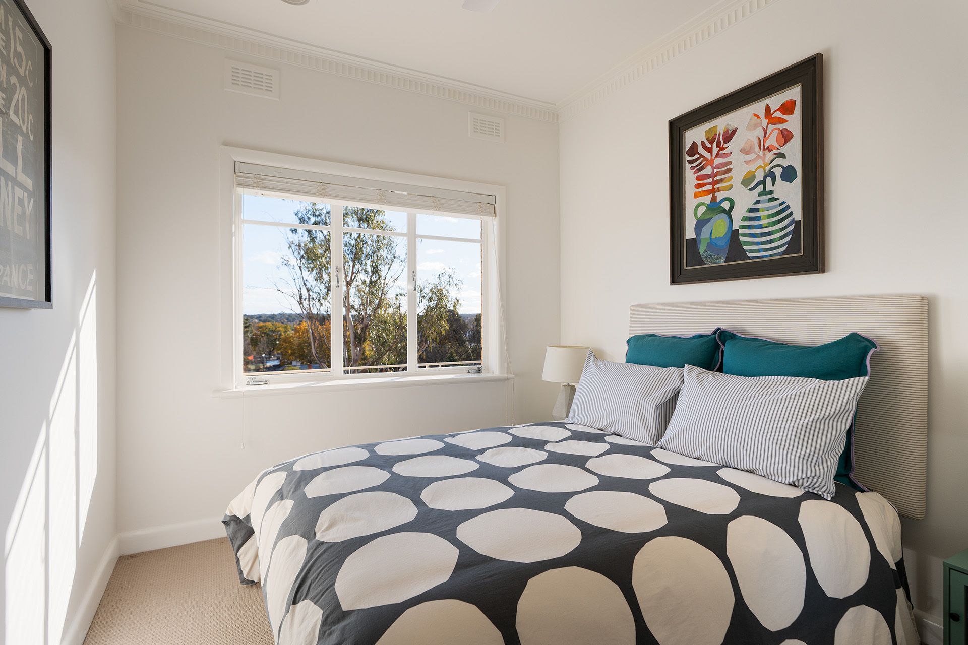 All three bedrooms are generously sized and positioned to enjoy the elevated outlooks, with two including built-in robes. The bathroom has been beautifully updated with mid-century flair, featuring a walk-in shower, wall-hung basin, heated flooring, a heated towel rail, geometric hexagon tiling, and a bespoke gold perspex towel hook. A separate matching powder room and a full-sized laundry with vintage windows and garden views add functionality.