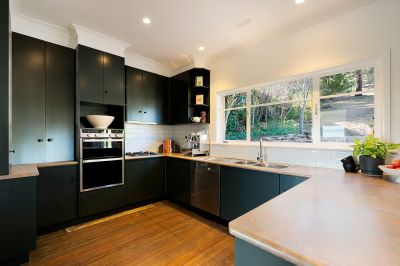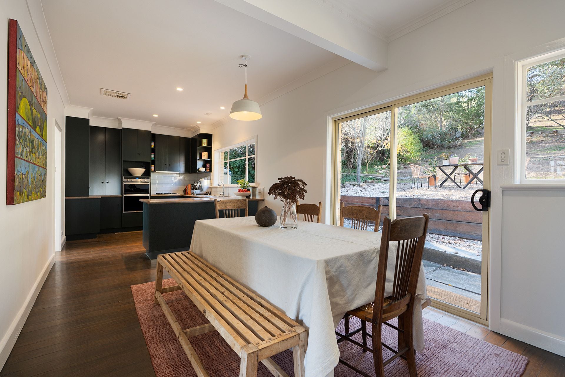 The open-plan kitchen and dining area continues the theme of retro-cool meets contemporary function. Cabinetry in Dulux 'Nimrod' makes a bold design statement, complemented by gas cooktop, a wall oven, Miele dishwasher, and a wraparound bench ideal for casual dining. The dining area opens directly to the rear garden and entertaining space.
