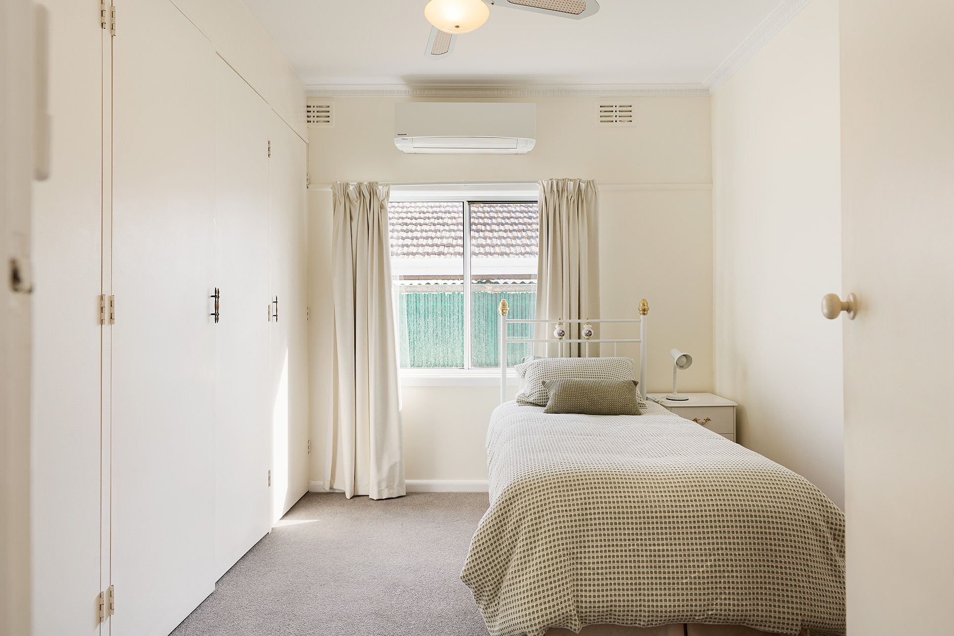 The home comprises three well-sized bedrooms, each with built-in robes, serviced by a central bathroom with a shower, vanity, and toilet. Additional comfort features include ceiling fans and a second split system in one of the bedrooms.