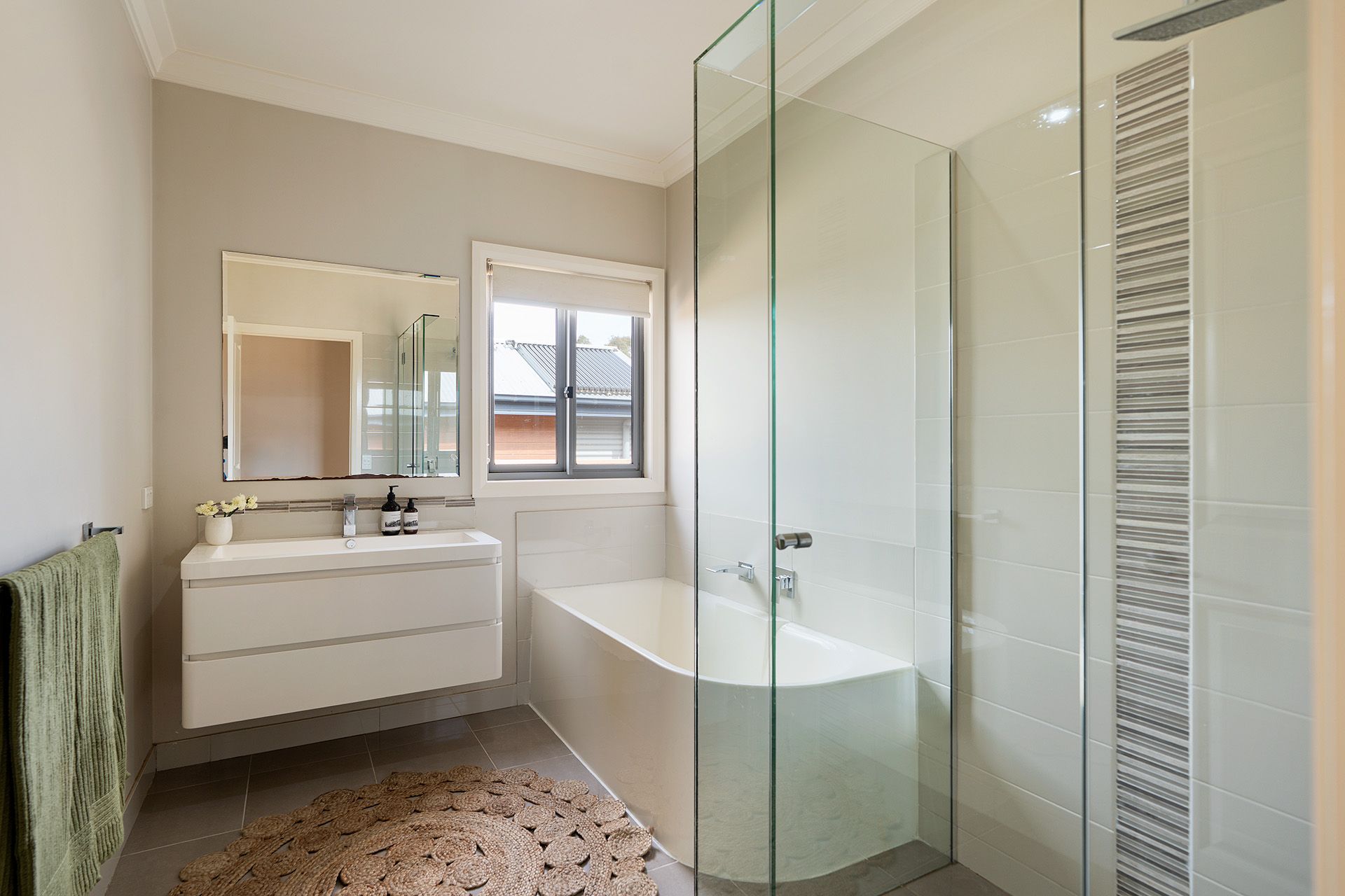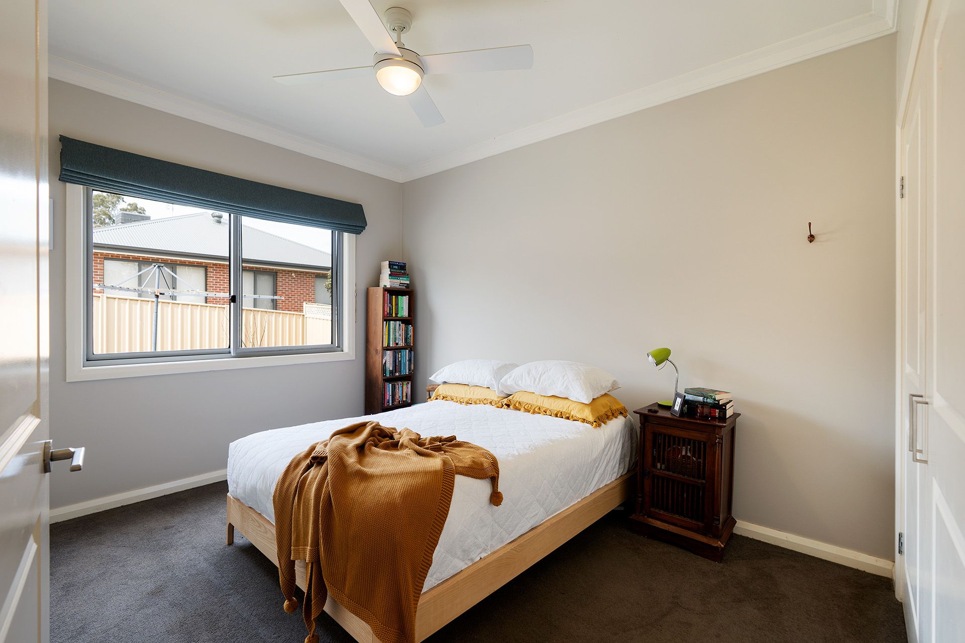 Accommodation features three bedrooms with built-in robes, a central bathroom with a back-to-wall bath, wall-hung vanity, and separate toilet, plus a laundry with external access. The main bedroom suite offers a walk-in robe and ensuite, creating a private retreat. Two split systems ensure year-round comfort, while the integrated solar system and solar hot water add to the home's energy efficiency. Partial double glazing enhances thermal performance and quiet living.