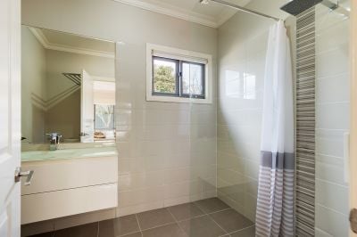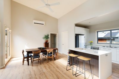 The home's striking façade, clad in Colorbond and stone, sets the tone for what lies within. A rock-clad feature wall in the entry foyer introduces the natural textures and thoughtful design that continue throughout. Inside, the open-plan living, kitchen, and dining area is bathed in light thanks to high raked ceilings and north-facing clerestory windows. The kitchen is designed for both style and practicality, featuring an island bench for casual dining, a freestanding 900mm gas cooktop with oven, dishwasher, and ample storage. A second north-facing living space opens to a deck overlooking the fully fenced back garden, offering a peaceful spot to relax or entertain. A dedicated home office with external access to a side deck adds flexibility for remote work or creative pursuits.