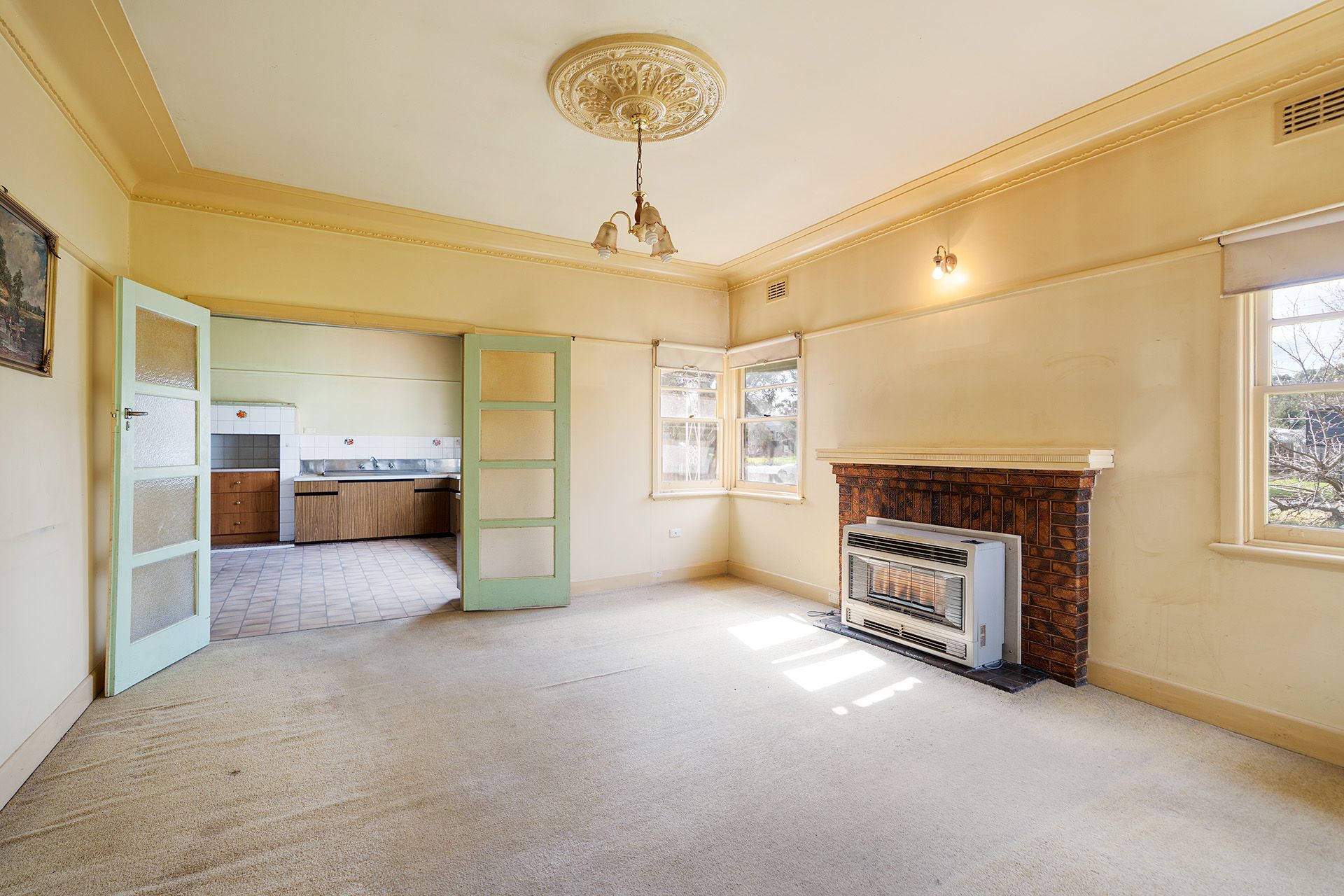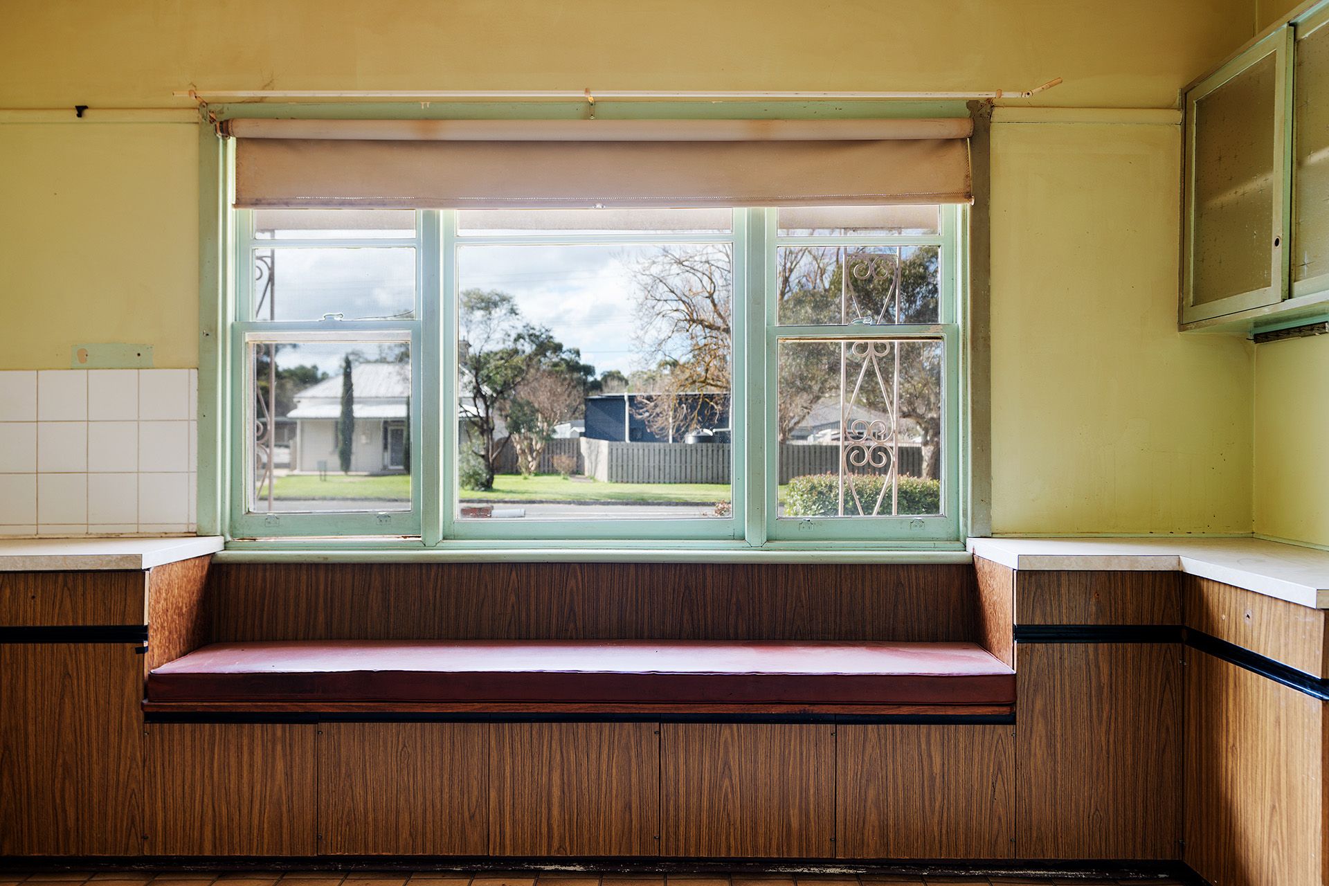 Inside, the central living room features a gas heater inset into a period brick surround, framed by double-hung windows. The kitchen is a nostalgic delight, with period cabinetry, a freestanding gas cooktop and oven set within a period surround, and a built-in dining bench seat under the window.