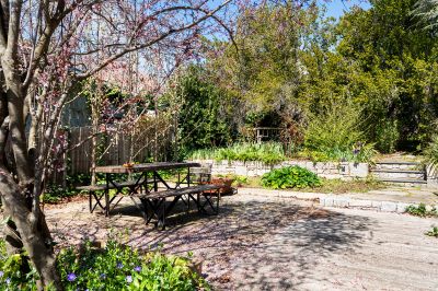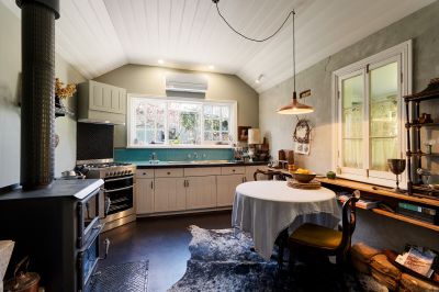 At the heart of the home, the kitchen and dining area is a welcoming space with a solid wood heater and baker's oven, freestanding gas cooktop, and split system. It overlooks a private side entertaining area, perfect for long lunches and quiet evenings.