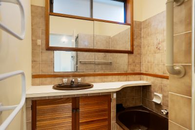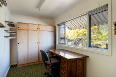 The north-facing main bedroom is filled with natural light, and two additional bedrooms include built-in robes. The bathroom is retro-cool with a distinct 1980s vibe, complete with a mission brown bath and basin, and a separate shower.