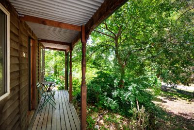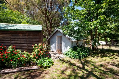 Among the winding pathways and lush plantings are two studios (including a fully lined creative or work-from-home space), sheds, carports with rear access, 1.5kW integrated solar, solar hot water, and water tank, with the added benefit of Crown Land at the rear, enhancing the home's peace and privacy.