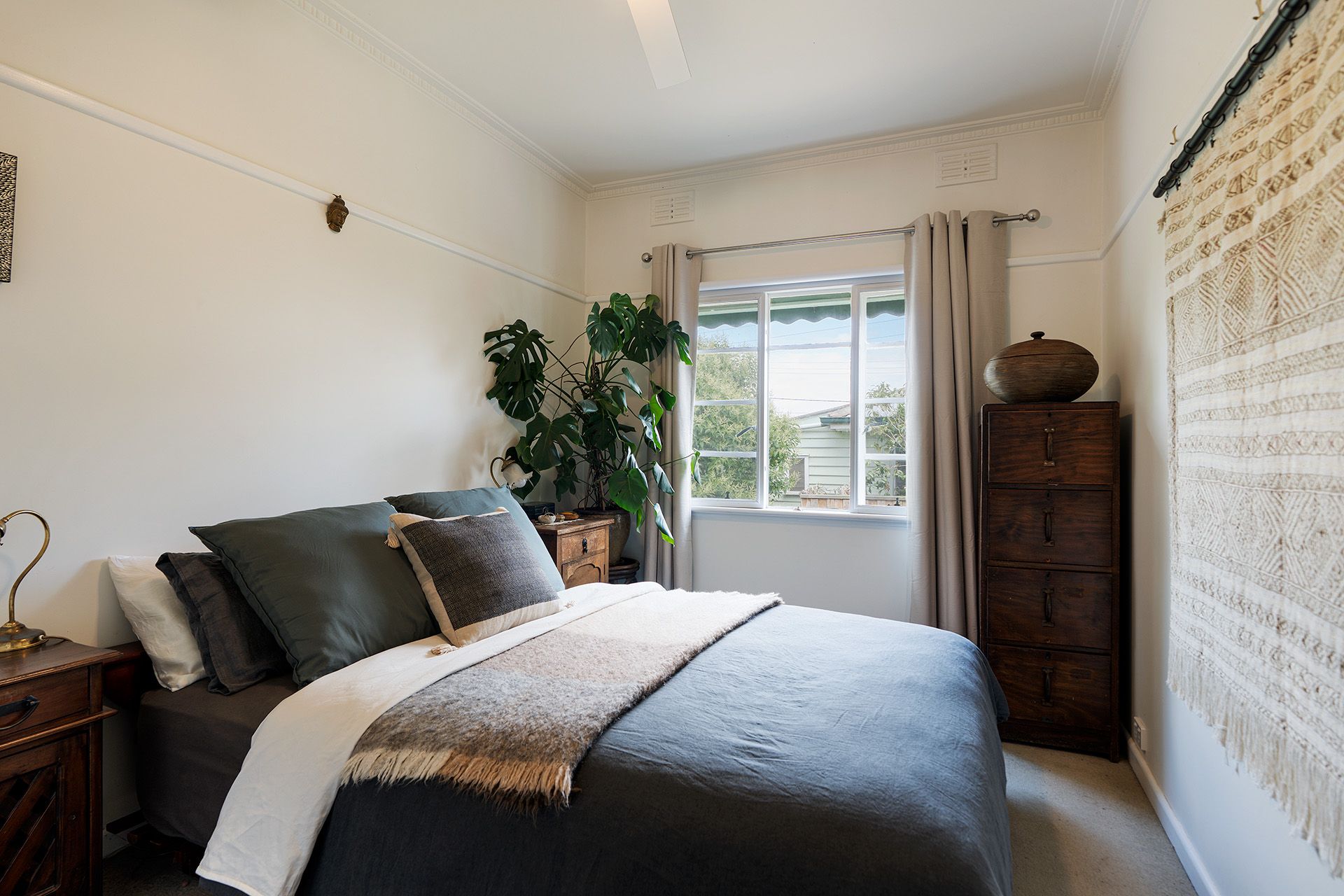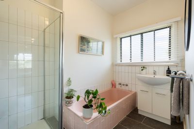 Two light-filled, private bedrooms with built-in robes and ceiling fans offer calm retreats, while the refreshed bathroom provides a bath, shower, and vanity.