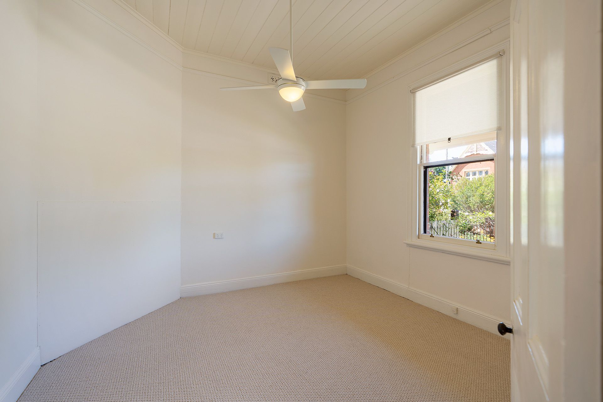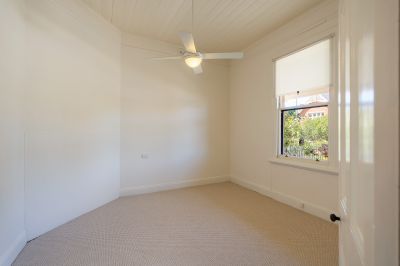 A traditional central hallway introduces the home's generous proportions, where high ceilings, pine timber floors and classic double‑hung windows create an immediate sense of light and space. Two inviting, front‑facing bedrooms sit at the front of the home, one featuring an open fireplace with an original period surround, offering a quiet reminder of the home's heritage.