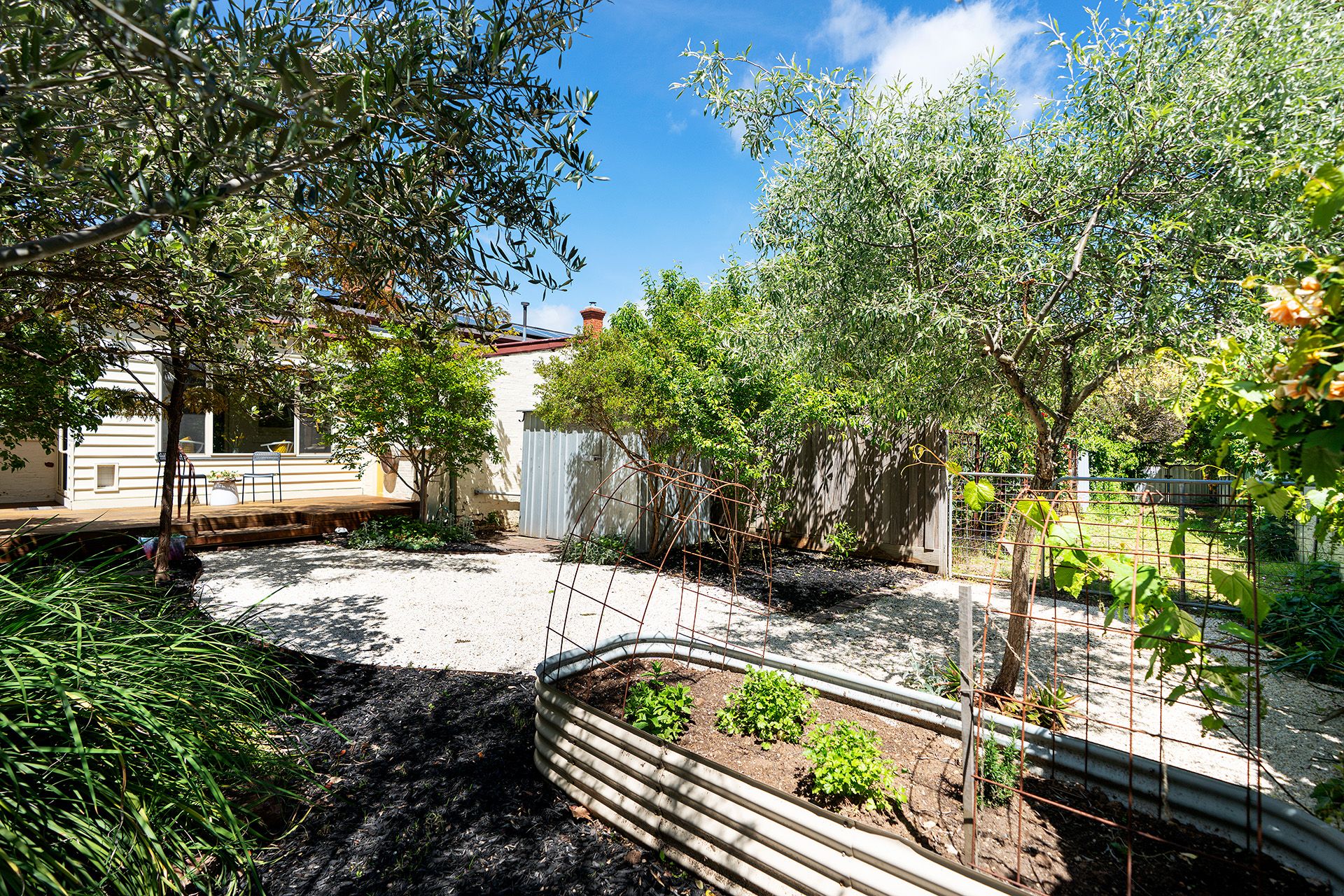 From the kitchen, the home opens into a north‑facing sunroom with double‑glazed windows, a versatile space ideal as a dining area, second living zone or quiet workspace. With direct access to the rear deck, this sun‑filled room creates a seamless link to the garden beyond. The established backyard enjoys a prized northerly aspect and is beautifully landscaped with mature crepe myrtles, olive and feijoa trees, raised vegetable beds, gravel pathways and corten edging, offering a low‑maintenance yet richly planted outdoor setting. A shed provides practical storage, while off‑street parking is available via the shared driveway.