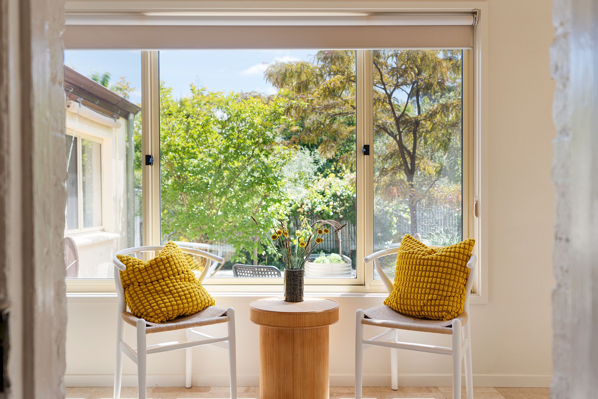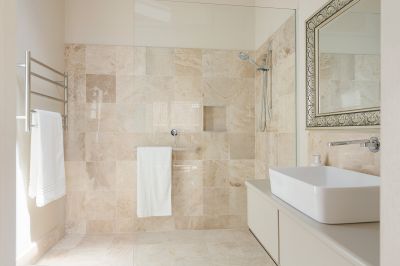 The contemporary bathroom is stylishly finished with a walk‑in shower, heated towel rail, travertine‑look tiles and vanity, complementing the home's blend of old and new. An external laundry with excellent storage is discreetly positioned and easily accessed from the garden, adding everyday functionality. Additional features include an integrated solar system and an electric retractable sun blind, with the overall presentation one of calm, comfort and quiet confidence.
