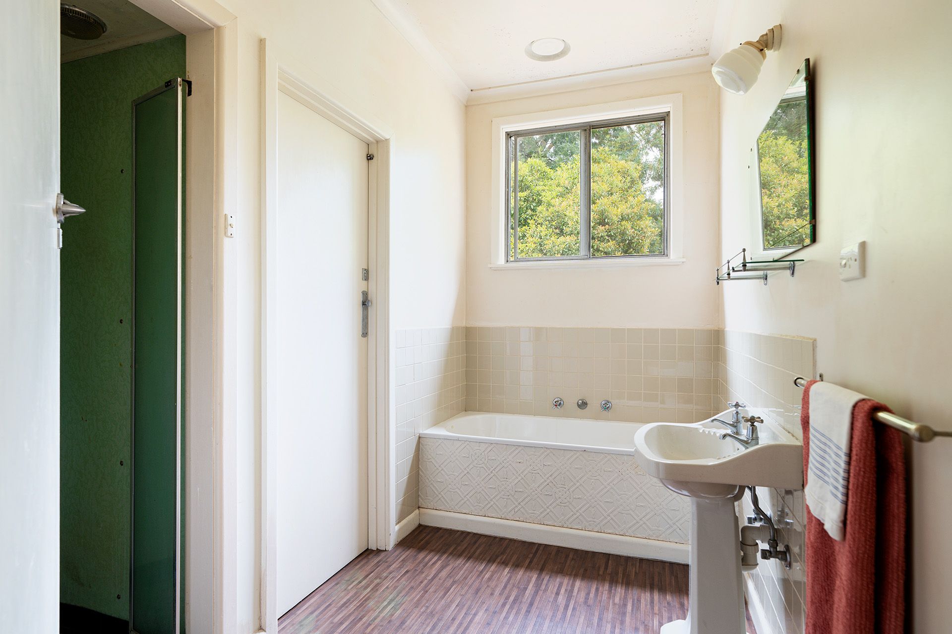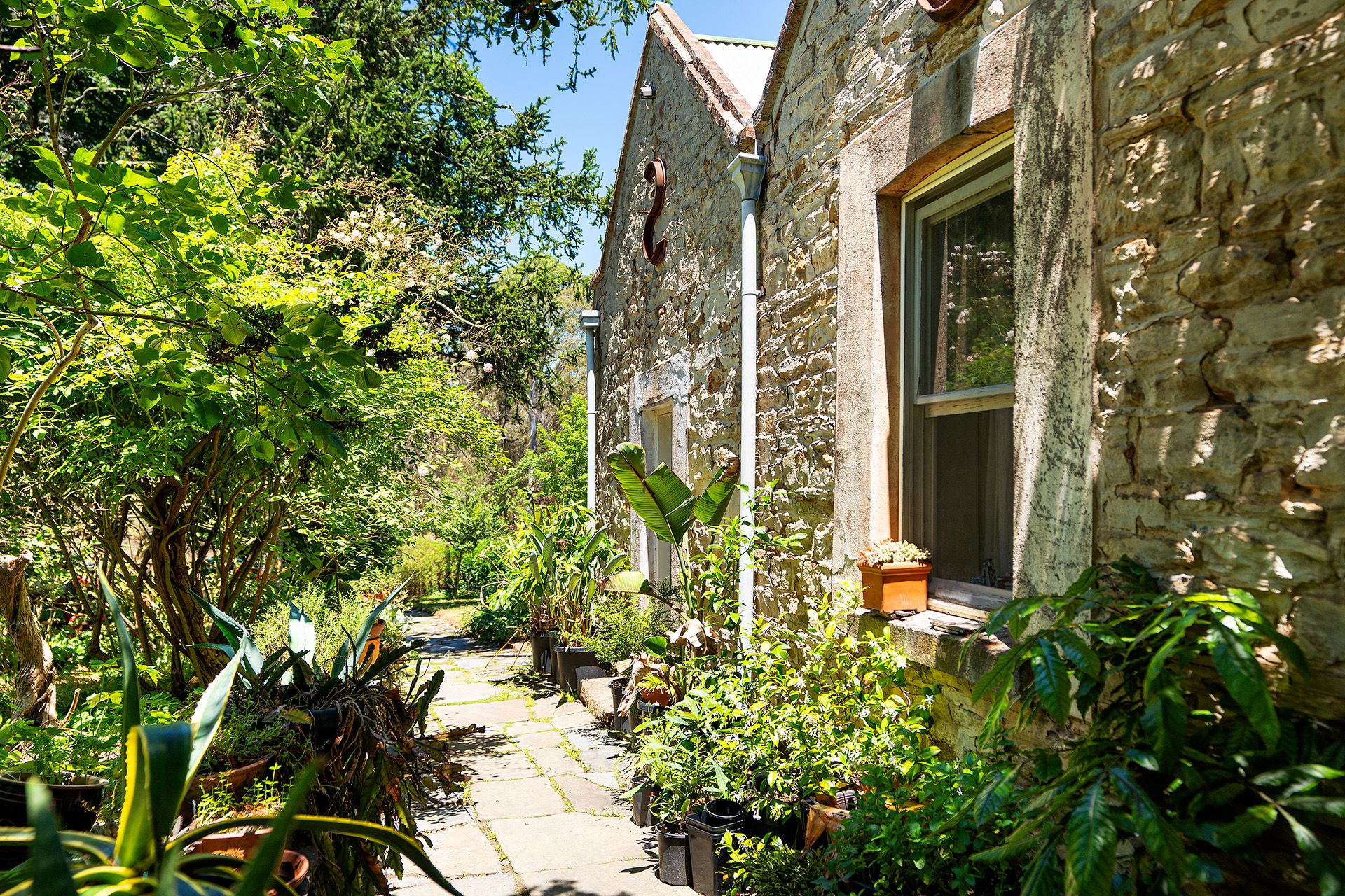 The home itself is a testament to a bygone era. The original stone cottage, dating back to 1858, is one of the last remaining homes from the height of the quartz mining boom in nearby Nimrod Reef. It features a traditional layout with a central hall leading to three spacious bedrooms. One bedroom opens to the garden through French doors, creating an ideal connection to the outdoor space. The living room is the heart of the home, with a solid wood heater. This area flows seamlessly into a thoughtfully designed mid-century addition, which expands the living space and adds modern functionality to the home. The addition features a second living/dining area with a sliding door to the garden, a home office, and a bathroom with a shower, bath, pedestal basin, and a separate toilet. The kitchen/ dining is spacious and features wall-to-wall windows with louvres, offering abundant natural light, a freestanding gas cooktop, and access to the front terrace.
