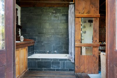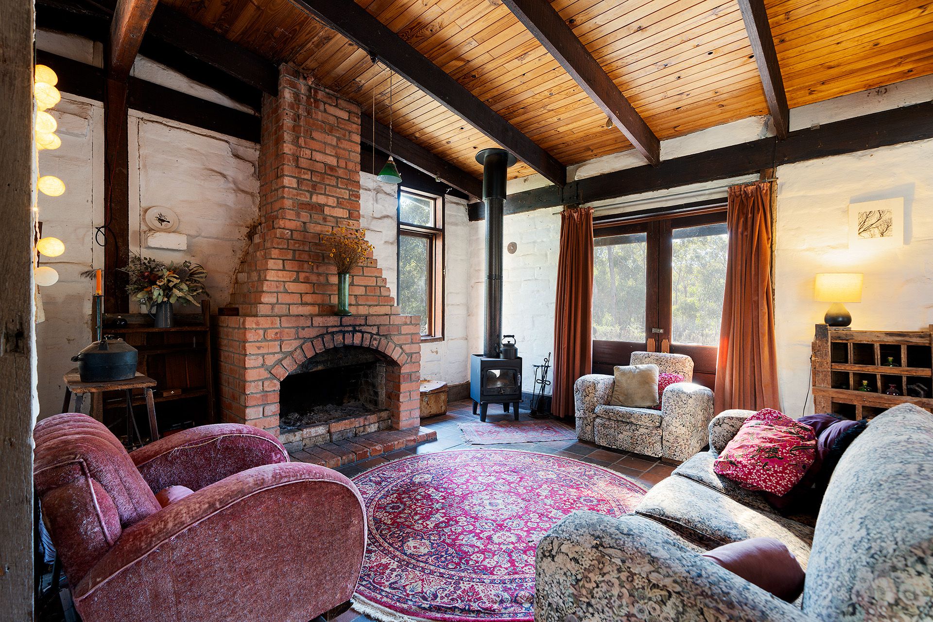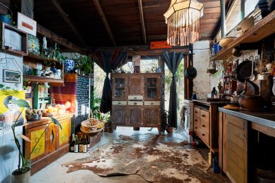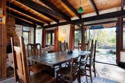 Set on approximately 33 acres of picturesque bushland, the property is home to birds and wildlife, creating an idyllic natural environment. The two-bedroom mud brick home has been designed to ensure comfort while maintaining a deep connection with the surrounding nature. The open-plan living area is warm and inviting, featuring a stunning open fireplace and two sets of French doors that open onto an outdoor entertaining area, offering a seamless flow between the indoors and outdoors. The dining area, combined with a country-style kitchen, includes a slow-combustion stove, a gas cooker, and a solar-powered hot water system.