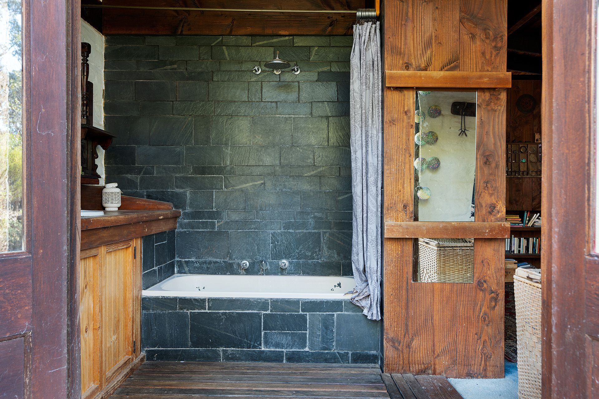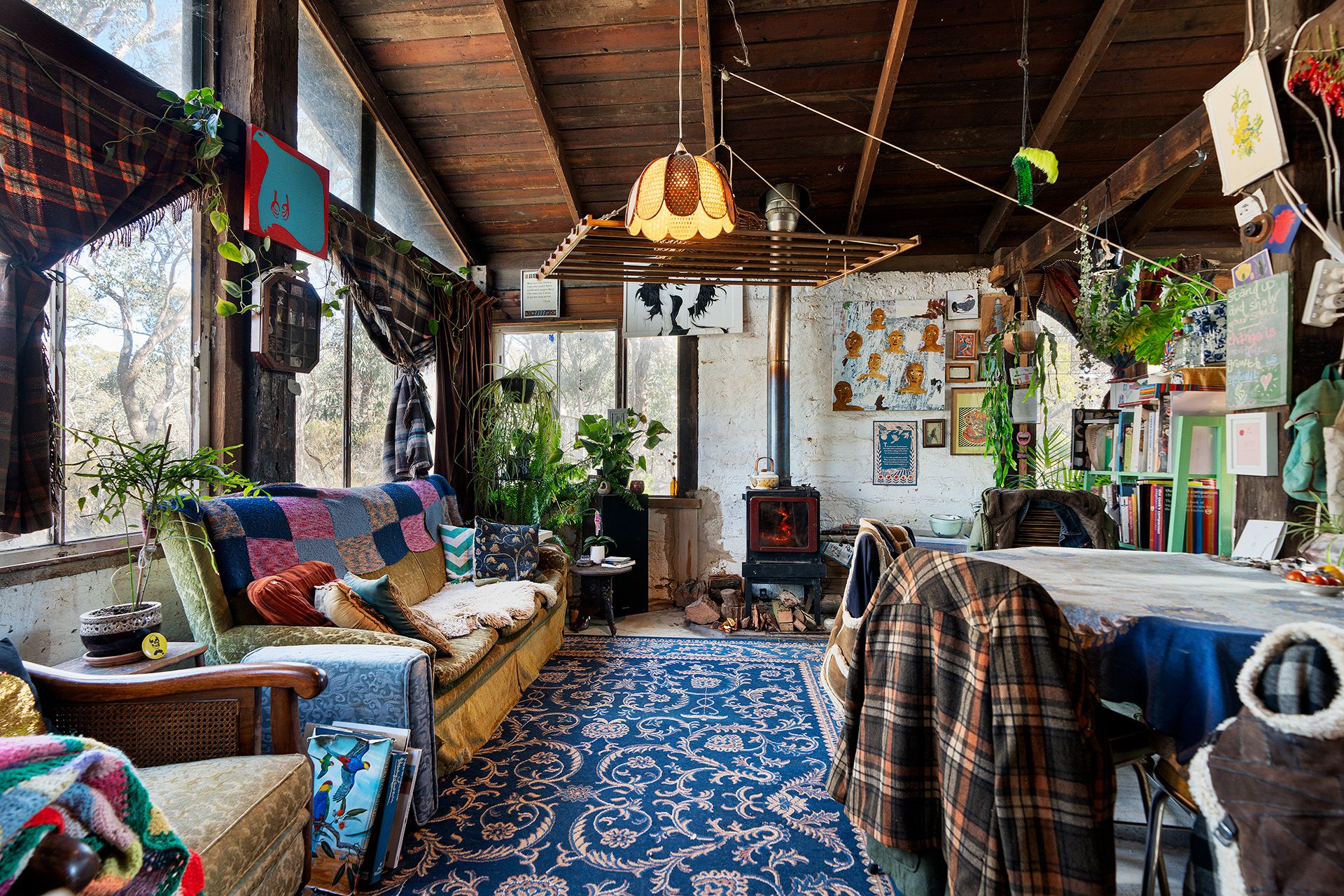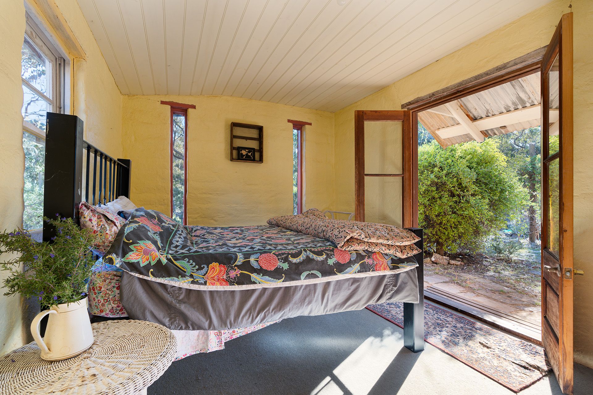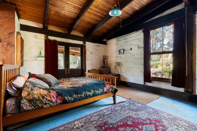 The spacious master bedroom is a peaceful retreat, complete with built-in robes, French doors, and an adjoining bathroom featuring a timber vanity and shower over the bath. A detached mud brick studio, previously used as a potter's studio, now serves as additional accommodation, offering a kitchen, bathroom, living room, and bedroom, perfect for guests or creative pursuits. The property also features a workshop/garage, providing ample space for storage or any creative projects. Sustainability is at the heart of this property, with a solar power system providing off-grid living and a dam that serves as a natural water source.