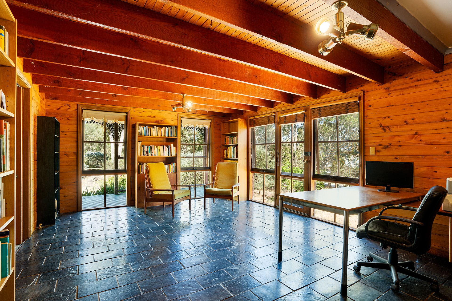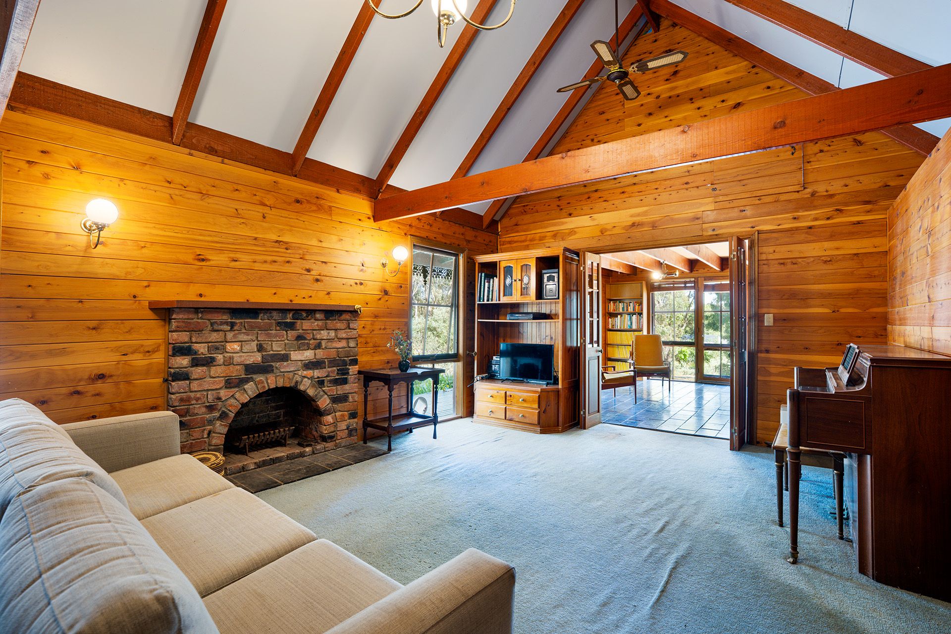 Inside, the home is designed for generous family living. At its heart is a welcoming country-style kitchen, complete with a freestanding gas cooktop and oven, dishwasher, and walk-in pantry. The kitchen flows seamlessly into the dining and second living area, which opens onto an impressive 54 sqm alfresco space, perfect for year-round entertaining. Slate flooring adds character, while the main living room boasts cathedral ceilings with exposed beams, timber-clad walls, and an open fireplace with a brick surround, creating a warm and inviting atmosphere.