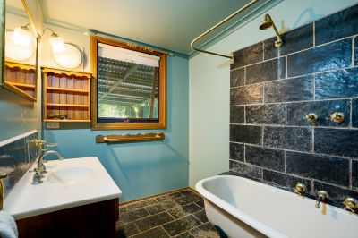Accommodation includes five spacious bedrooms. The main bedroom features built-in robes and an ensuite with a shower, vanity, and separate toilet. Two further bedrooms offer walk-in robes, a fourth has built-in robes, and the fifth, located upstairs, makes an ideal teen retreat or private home office. A north-facing rumpus room with external access adds flexibility for family living. The second bathroom includes a shower over a clawfoot bath, vanity, and separate toilet, while the laundry provides direct outdoor access.