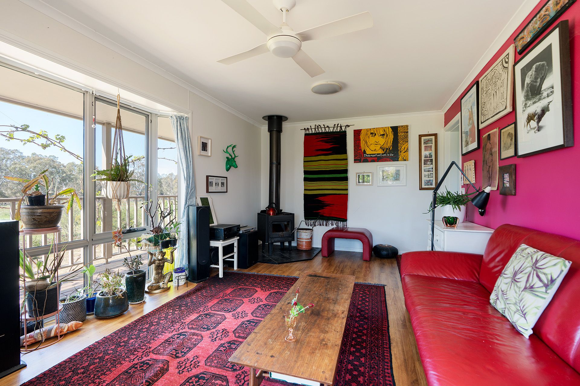 The two-bedroom home is positioned to take full advantage of its north-facing aspect, with a living room featuring a Nectre solid wood heater and double-glazed windows that ensure year-round comfort and quiet. The kitchen and dining area includes a split system, electric cooktop, wall oven, and pantry, while the living space opens to a wraparound deck, a perfect spot to sit and enjoy the views across the property.