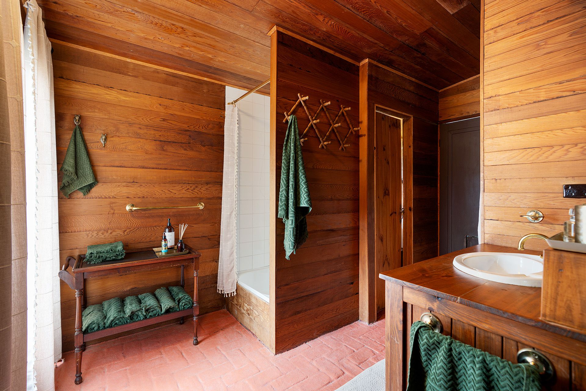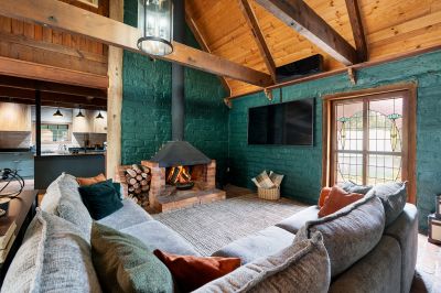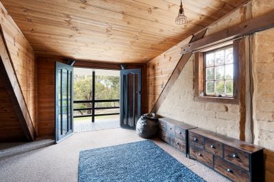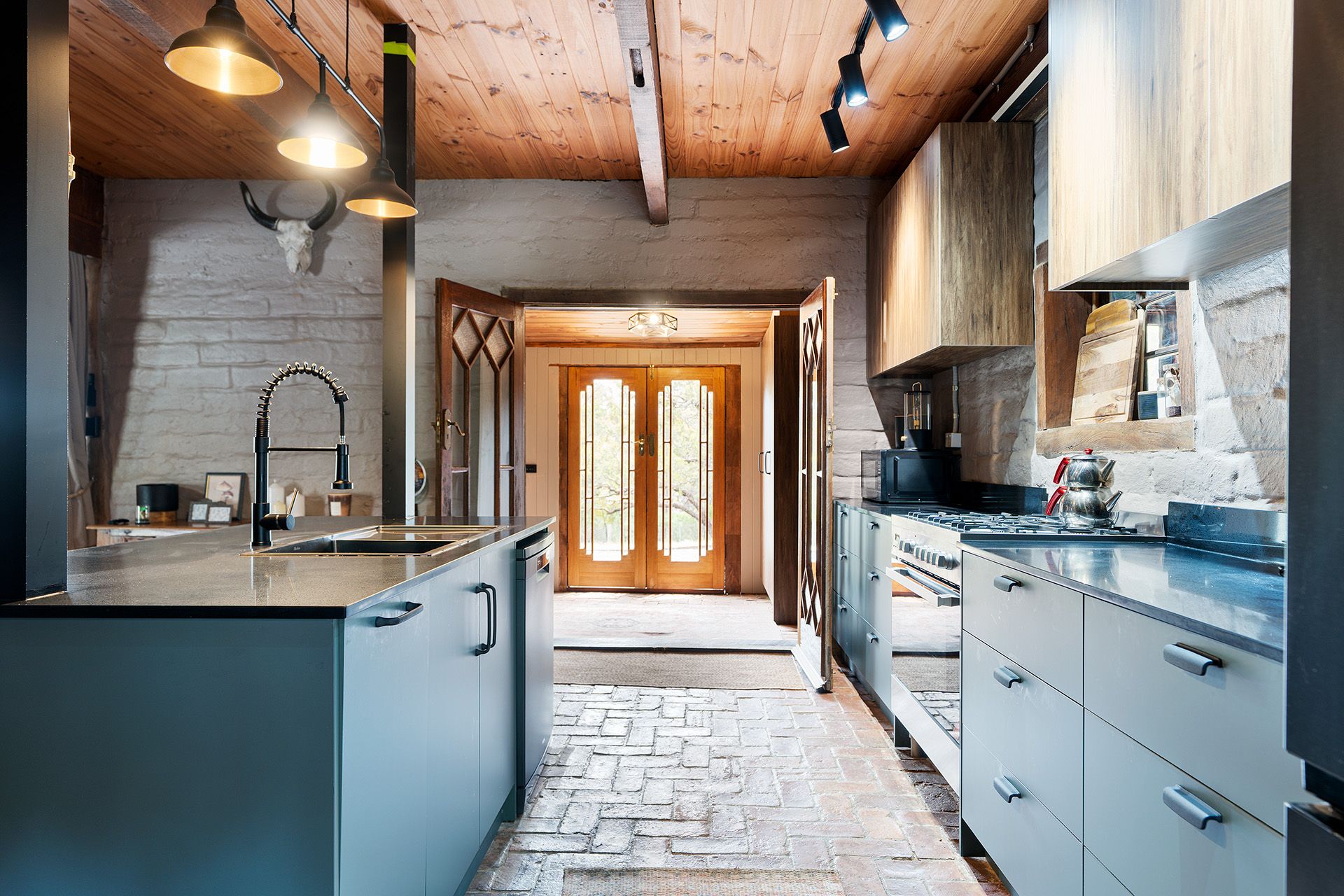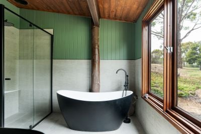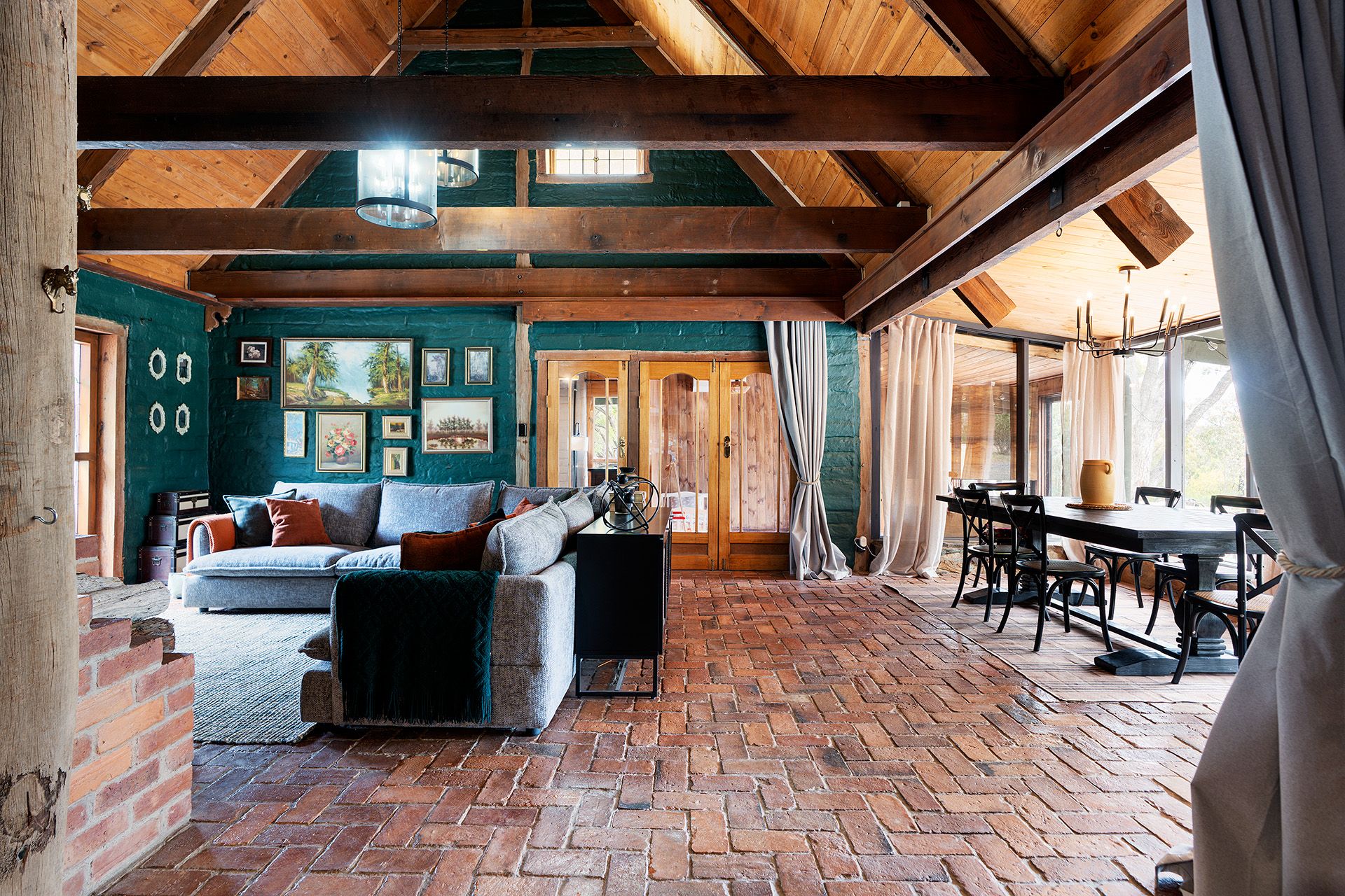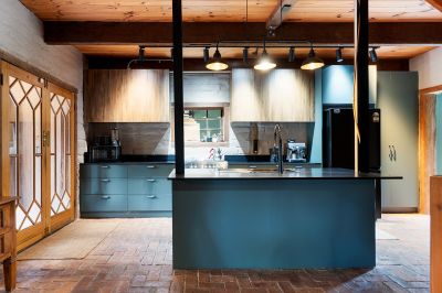 The home's mudbrick construction speaks to its eco-conscious origins, providing natural insulation and thermal regulation, while its north-facing orientation captures the warmth of the sun. Inside, the interiors have been thoughtfully updated to reflect a contemporary aesthetic without losing their rustic soul. A practical mudroom leads into a striking kitchen finished in deep green and black tones, complete with stone benchtops, a freestanding gas cooktop and oven, dishwasher, and an island bench designed for casual dining.