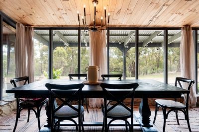 From here, the space opens into a dramatic living and dining area where a timber-clad cathedral ceiling with recycled beams soars overhead. A large brick fireplace anchors the room, complemented by a wall of windows that frame uninterrupted views of the surrounding bushland. Natural light floods the space, creating an atmosphere that feels warm, inviting, and deeply connected to nature.