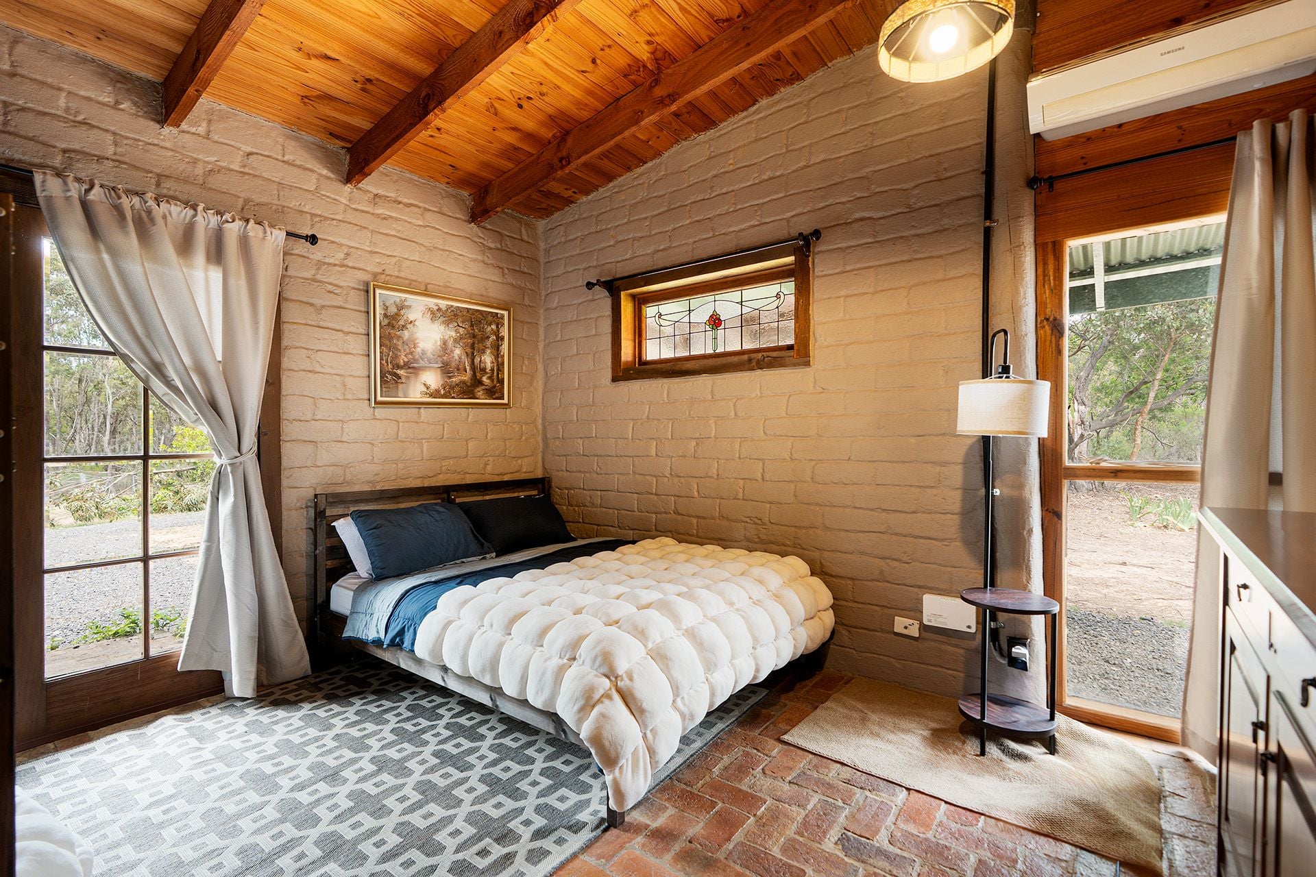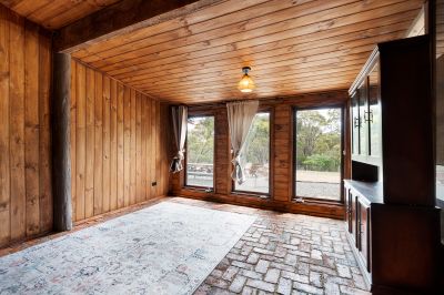 Character details such as handmade brick flooring and leadlight windows sourced from a Surrey Hills period home add texture and history, while modern conveniences include mains power, an integrated solar system, and solar-boosted hot water. Outside, the property backs onto State Forest, ensuring privacy and tranquillity. Two carports, a dam, three water tanks, and a shed provide practicality, while the fully fenced house yard features a low-maintenance native garden with established gums and wattles.