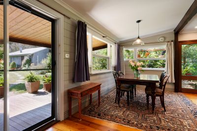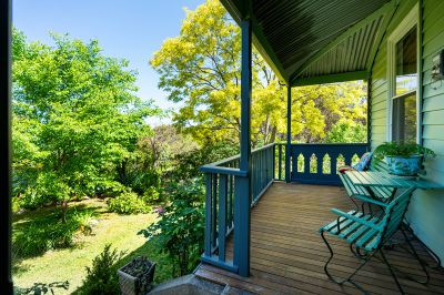 Elevated, the home features a front verandah overlooking the garden, a perfect spot for a morning coffee or evening relaxation before entering the sitting room with a solid wood heater inset into a period fireplace, complemented by double-hung windows and classic timber dado. A central hall leads to the open-plan second living with a north-facing kitchen and dining. The living room has a striking bay window adorned with Tudor-style leaded diamond glass, adding an elegant touch reminiscent of Edwardian architecture and the ideal spot to relax or be creative. The room is softened by sage-coloured timber cladding on the walls and warmed by a solid wood heater. The updated country French-style kitchen is the ideal space for entertaining. It has a 900mm freestanding gas cooktop with an oven, plumbing for the fridge, stone benchtops, and an island bench with plenty of storage. The dining space has a raked timber-clad ceiling and external access to the 5.6m x 2.3m north-facing patio overlooking the back garden. The main front-facing bedroom has multiple windows framing the garden, a walk-in robe and access to the generous bathroom with Art Nouveau touches, a shower over the bath, a vanity and a toilet. The second spacious bedroom has high ceilings and timber cladding, and a third bedroom to the rear of the home is perfect as a study. The laundry has external access and a separate second toilet with a vanity, making it ideal for guests. Additional details include an integrated solar system, solar hot water, and has a split system and ceiling fans. Period details include floorboards, high ceilings, double-hung windows, and timber detailing. All windows beautifully frame the magnificent garden, creating a tranquil atmosphere throughout the home. This seamless connection with nature invites calming views and natural light into every room, enhancing the sense of peace and relaxation.